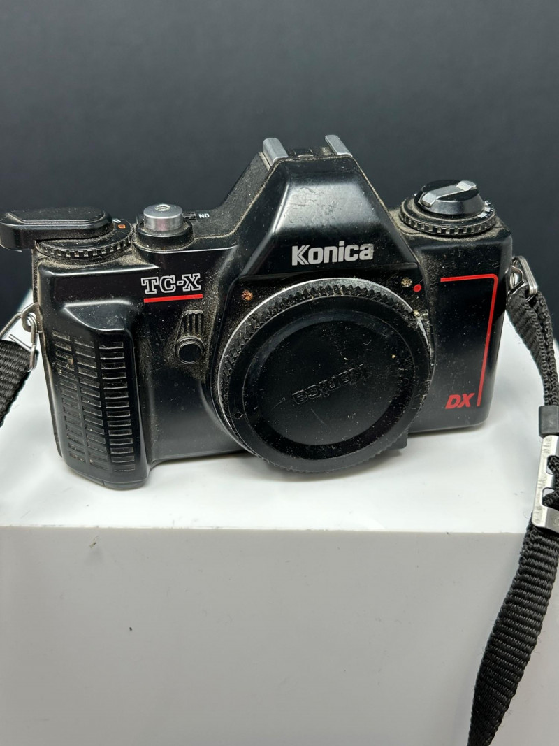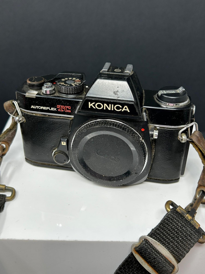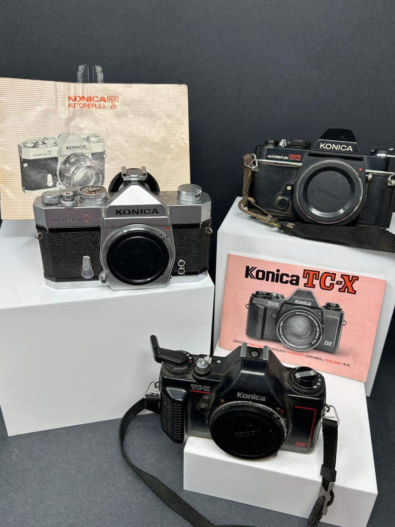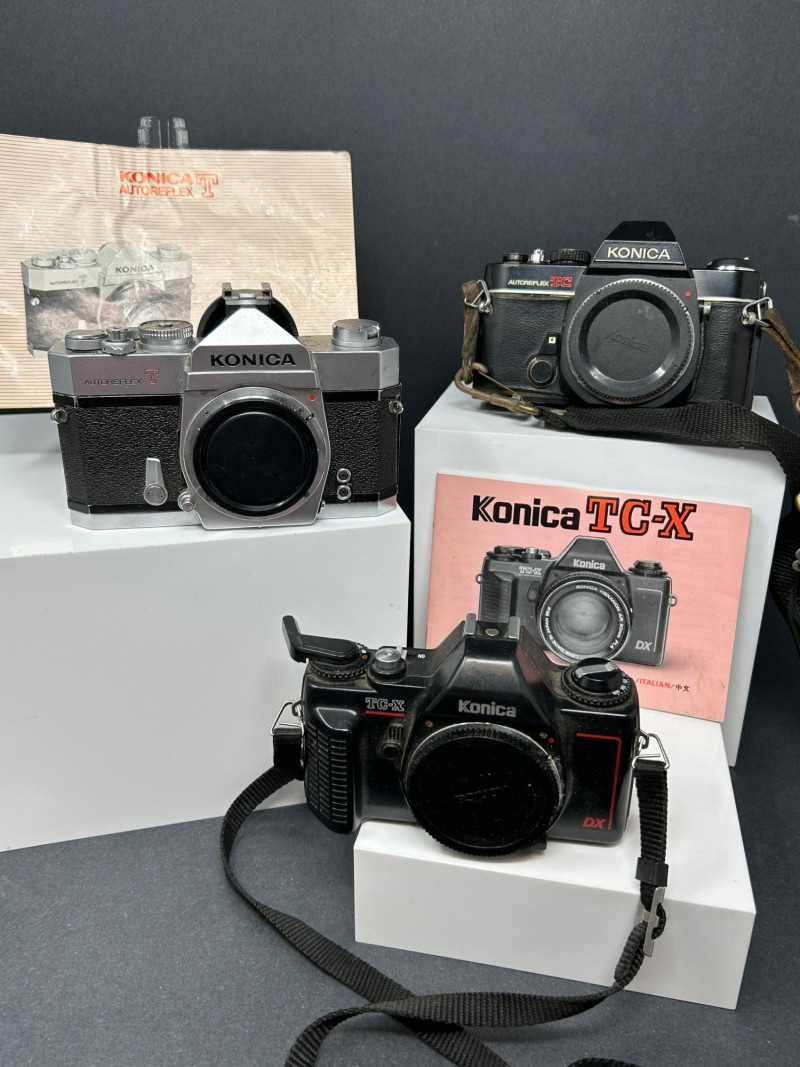 A group of three vintage Konica 35mm SLR camera bodies including the Autoreflex T, Autoreflex TC, and TC-X. Also included are the Autoreflex T and TC-X instruction manuals and a camera strap. These cameras reflect Konica’s classic mid-to-late 20th century SLR design, featuring durable construction and compatibility with Konica AR-mount lenses. The cameras show cosmetic wear consistent with age and use. One camera has a name label on the back and another contains a Kodacolor VR 400 film cartridge. Together, they make an appealing lot for collectors of vintage film cameras, display pieces, or restoration projects. Lot Details: Konica Autoreflex T 35mm SLR Camera Body Konica Autoreflex TC 35mm SLR Camera Body Konica TC-X 35mm SLR Camera Body