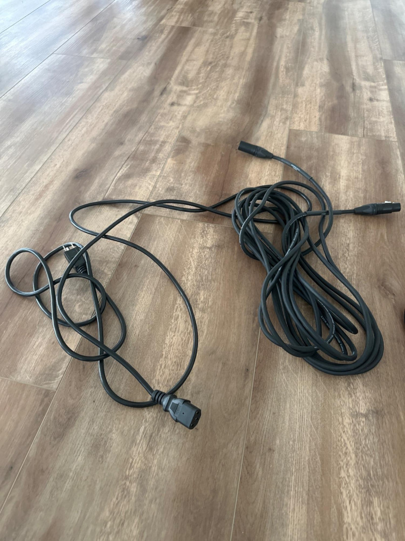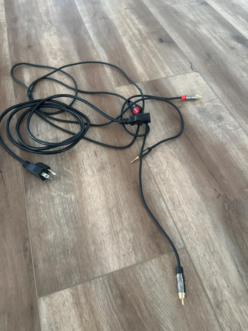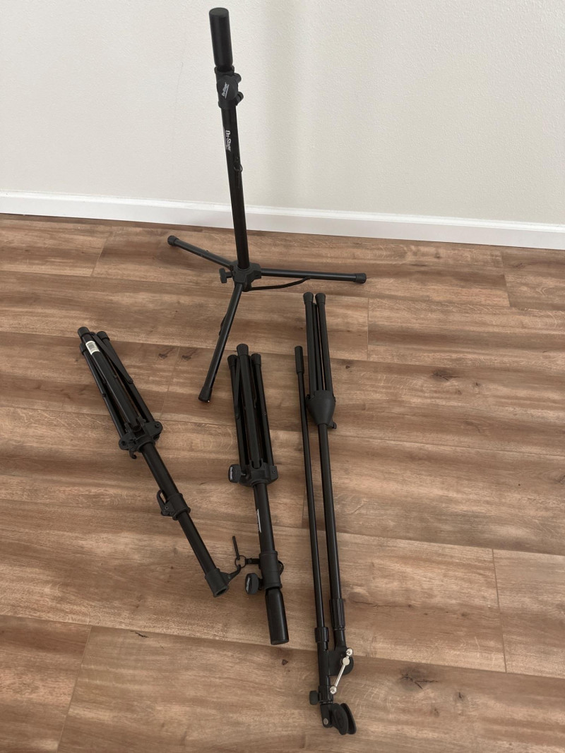 Mixed lot of audio and power cables along with speaker stands, suitable for PA systems, speakers, and other audio equipment. The lot includes multiple cables with various connectors such as RCA, 1/4", and power connections, along with collapsible tripod-style stands. These items are useful for live sound setups, DJ equipment, studio use, or event setups. Included in this lot: Assorted audio cables Power cable Speaker stands / tripod stands (as shown) Item Details: Brand: Mixed / On-Stage (stand visible) Type: Audio Cables & Speaker Stands Color: Black Material: Metal (stands) Measurements: 22" T × 13" W × 12" D Quantity: Multiple items (as shown in photos)