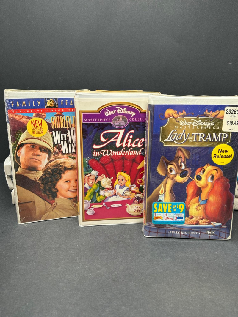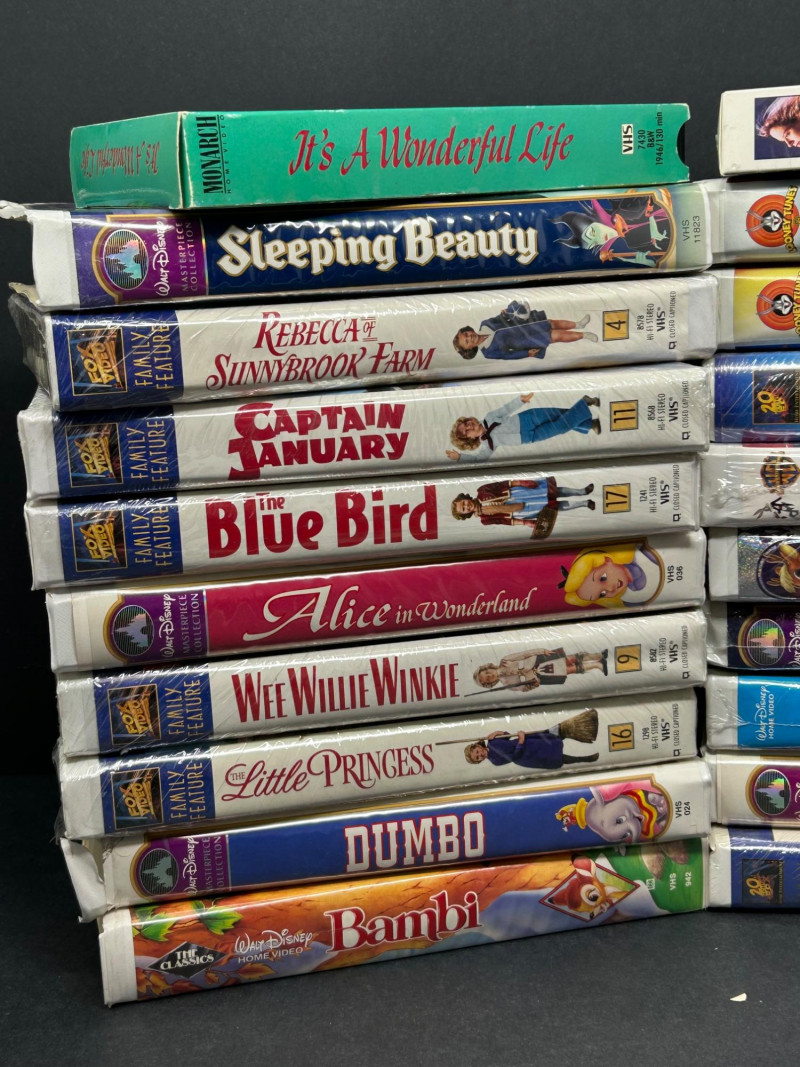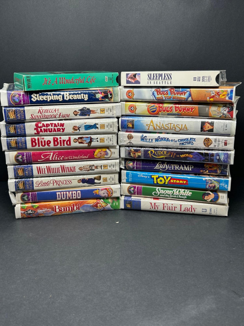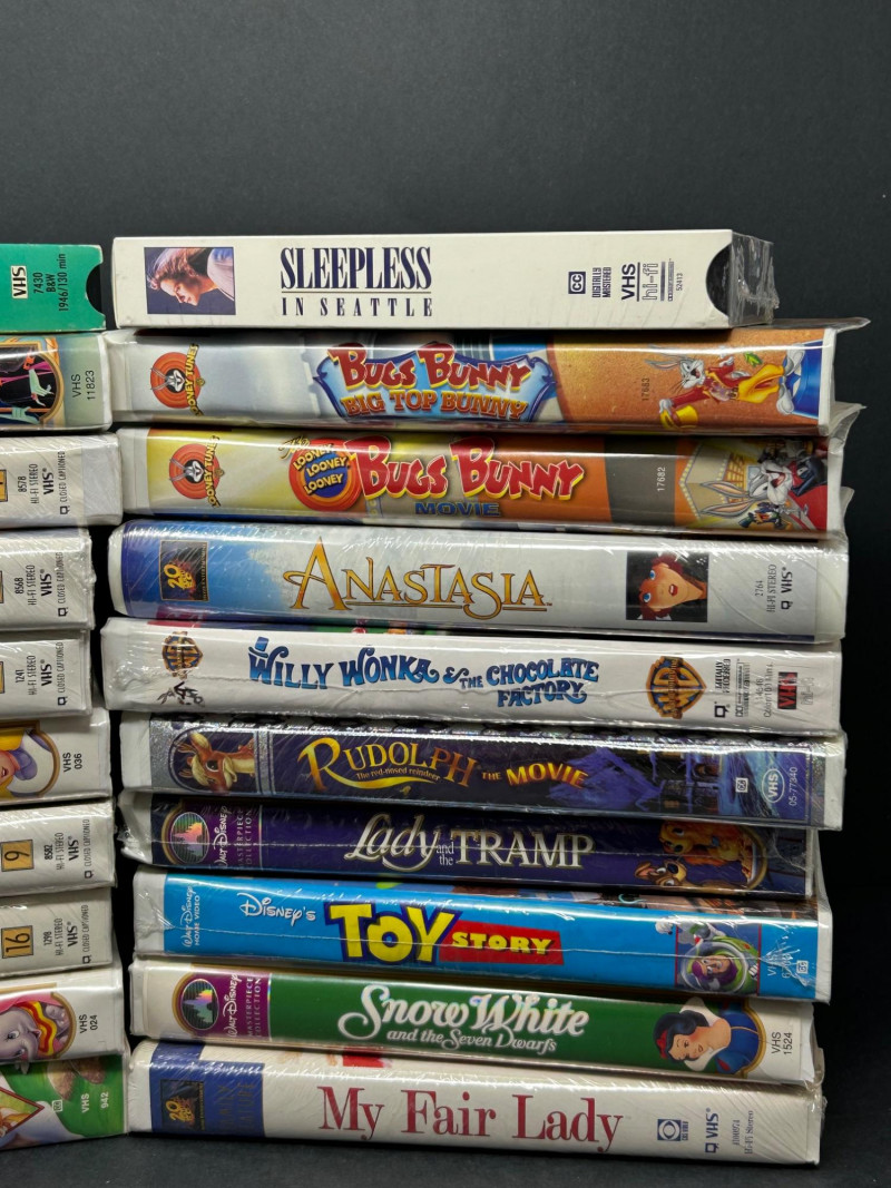 Mixed lot of vintage VHS movies featuring a selection of Disney classics, family films, and animated favorites. Titles visible in the lot include Alice in Wonderland, Lady and the Tramp, Toy Story, Snow White and the Seven Dwarfs, Dumbo, Bambi, Willy Wonka & the Chocolate Factory, Anastasia, Rudolph the Red-Nosed Reindeer, Bugs Bunny titles, Sleeping Beauty, Shirley Temple films, My Fair Lady, Sleepless in Seattle, It’s a Wonderful Life, and more. Many tapes in this collection are still factory sealed, while others are opened but remain in good vintage condition. Some cases may show shelf wear, creasing, or minor storage wear as shown in the photos. Item Details: Format: VHS Tapes Genre: Family, Animation, Classic Films Studio: Disney, Warner Bros., 20th Century Fox, and others Language: English Case Type: Standard Plastic Clamshell & Slipcase Many tapes are sealed