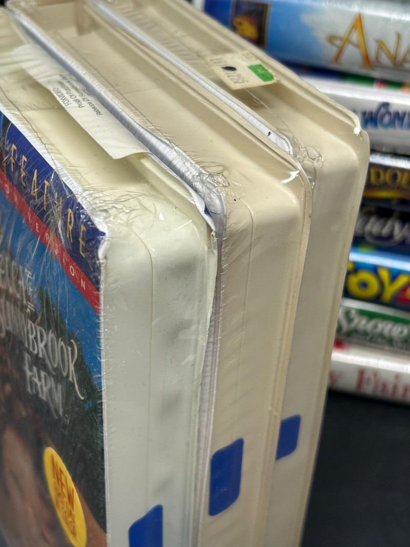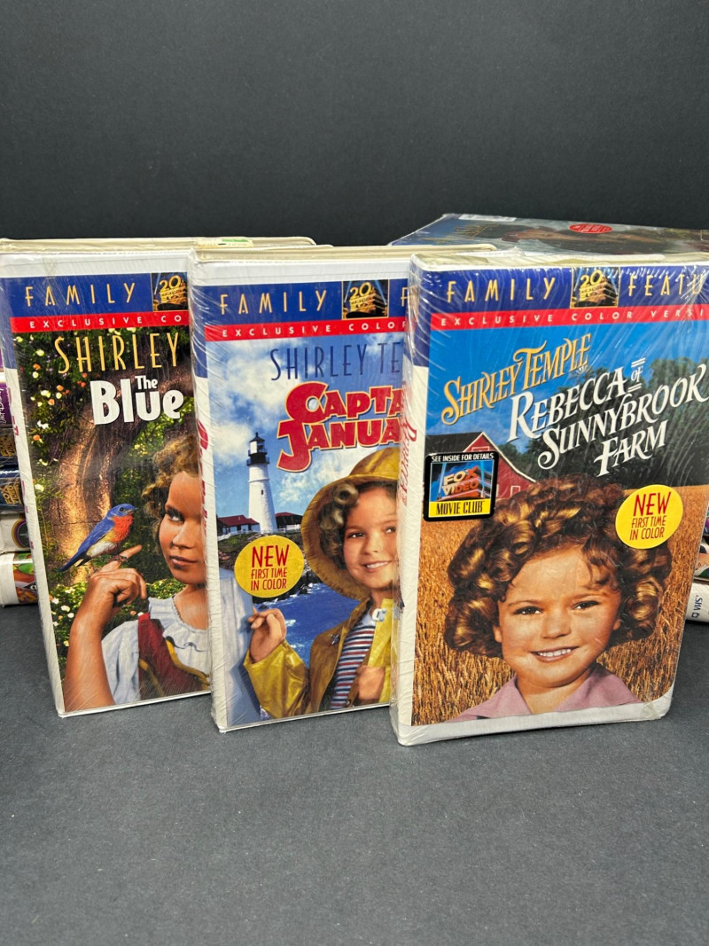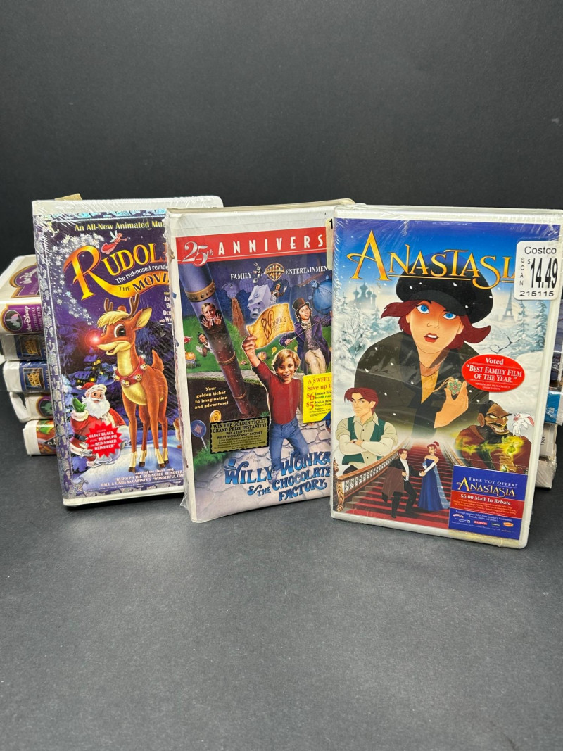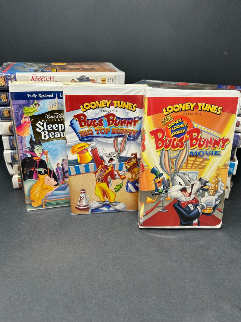 Mixed lot of vintage VHS movies featuring a selection of Disney classics, family films, and animated favorites. Titles visible in the lot include Alice in Wonderland, Lady and the Tramp, Toy Story, Snow White and the Seven Dwarfs, Dumbo, Bambi, Willy Wonka & the Chocolate Factory, Anastasia, Rudolph the Red-Nosed Reindeer, Bugs Bunny titles, Sleeping Beauty, Shirley Temple films, My Fair Lady, Sleepless in Seattle, It’s a Wonderful Life, and more. Many tapes in this collection are still factory sealed, while others are opened but remain in good vintage condition. Some cases may show shelf wear, creasing, or minor storage wear as shown in the photos. Item Details: Format: VHS Tapes Genre: Family, Animation, Classic Films Studio: Disney, Warner Bros., 20th Century Fox, and others Language: English Case Type: Standard Plastic Clamshell & Slipcase Many tapes are sealed