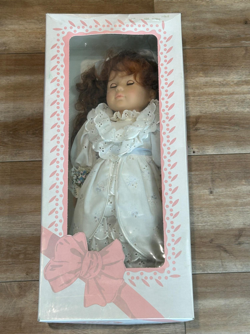Mixed lot of 8 collectible dolls including several Barbie Happy Holidays editions, Wedding Fantasy Barbie, Sparkle Beach Ken, and a Gotz doll. Many appear new in their original boxes and were kept as part of a collection. The lot features multiple Holiday Barbie dolls from different years, each dressed in festive gowns with detailed holiday packaging. Also included is a Wedding Fantasy Barbie in bridal dress, Sparkle Beach Ken, and a Gotz baby doll in original packaging. Item Details: Total: 8 Dolls Brand: Mattel Barbie / Gotz Includes: Happy Holidays Barbie dolls, Wedding Fantasy Barbie, Sparkle Beach Ken, Gotz doll