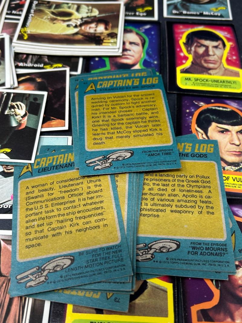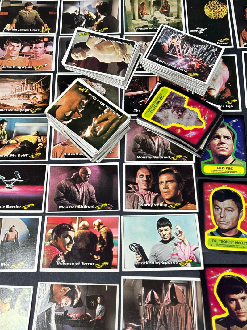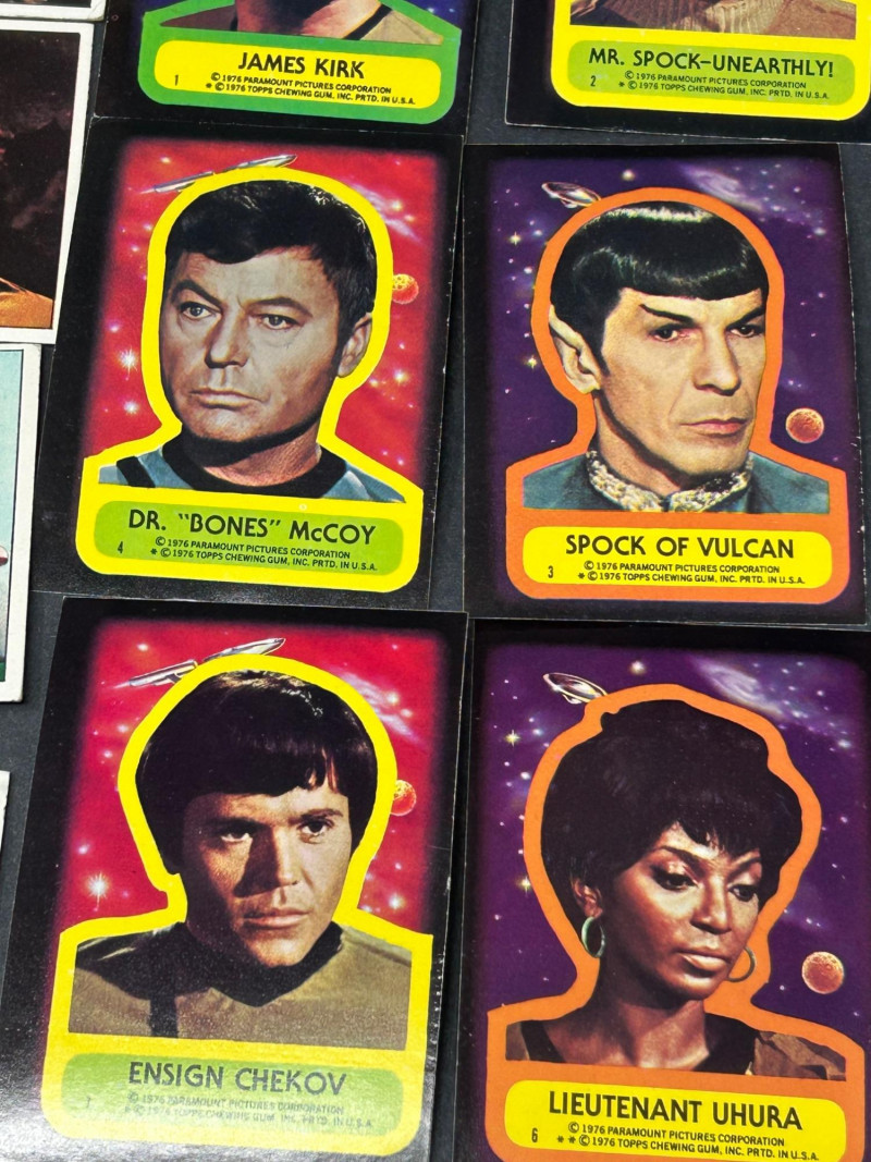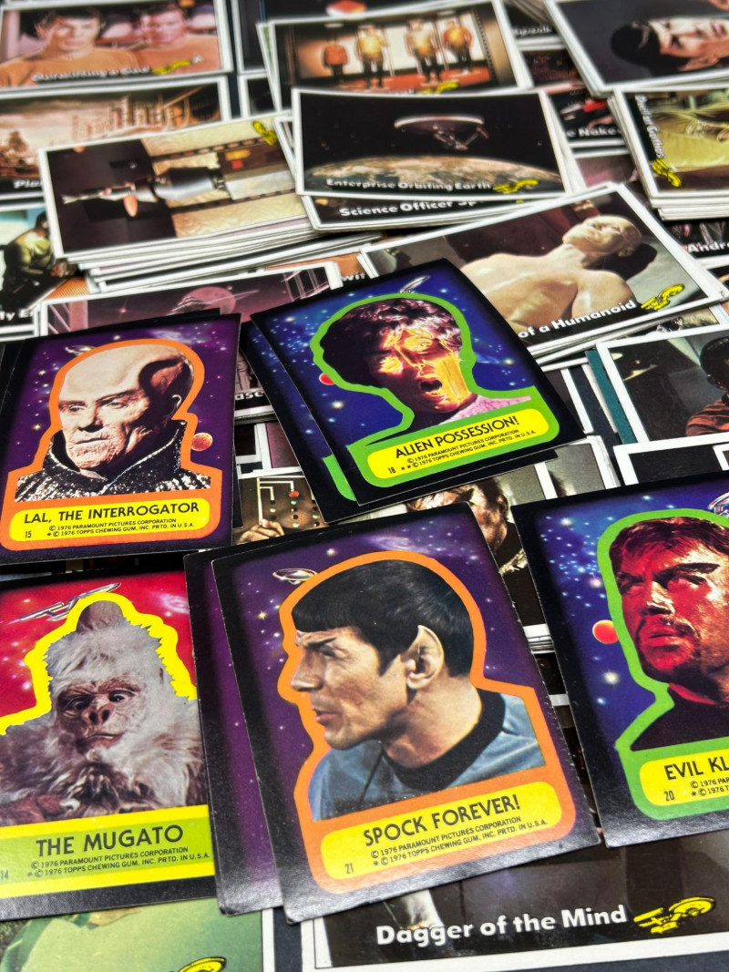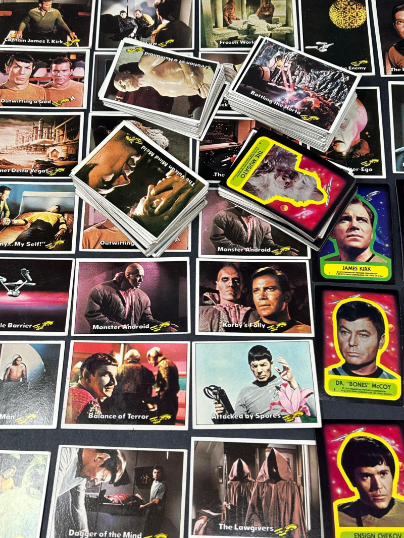 Large vintage Star Trek trading card lot featuring characters, scenes, and sticker-style cards from the classic series. This lot includes a mix of colorful character portraits and scene cards featuring well-known characters such as Spock, Dr. McCoy, Captain Kirk, and others. Cards display iconic moments and episode scenes from the original series, along with bright character cards and a few sticker-style cards with fold instructions on the back. Great for collectors, fans of vintage sci-fi memorabilia, or anyone looking to complete or expand a classic Star Trek card collection. Item Details: