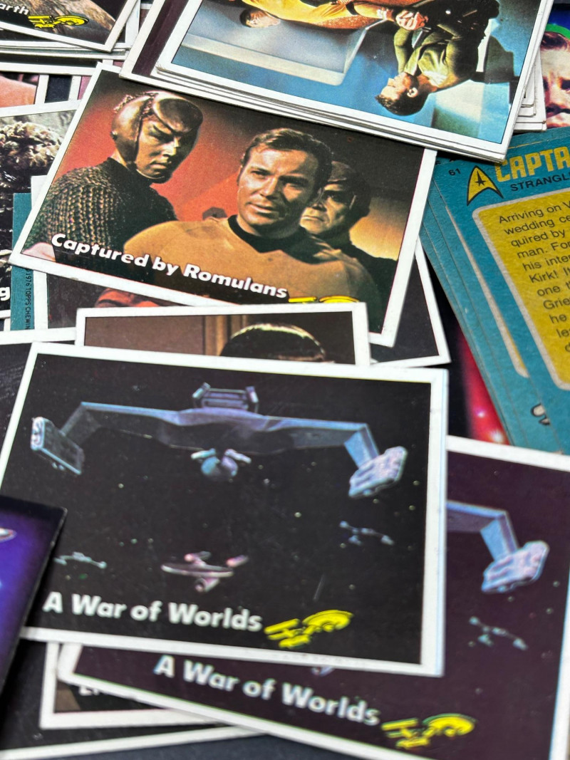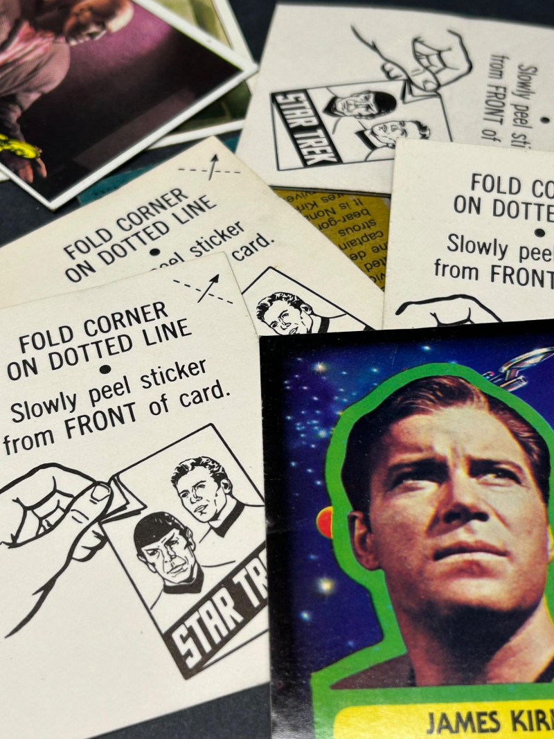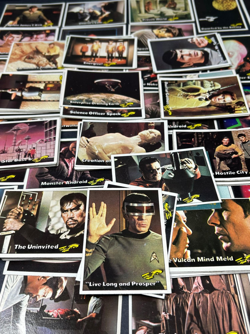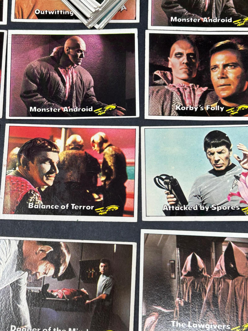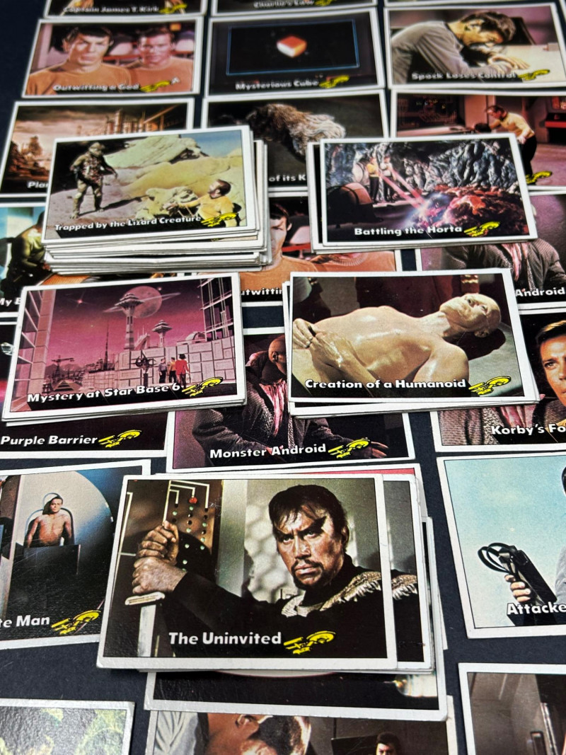 Large vintage Star Trek trading card lot featuring characters, scenes, and sticker-style cards from the classic series. This lot includes a mix of colorful character portraits and scene cards featuring well-known characters such as Spock, Dr. McCoy, Captain Kirk, and others. Cards display iconic moments and episode scenes from the original series, along with bright character cards and a few sticker-style cards with fold instructions on the back. Great for collectors, fans of vintage sci-fi memorabilia, or anyone looking to complete or expand a classic Star Trek card collection. Item Details: