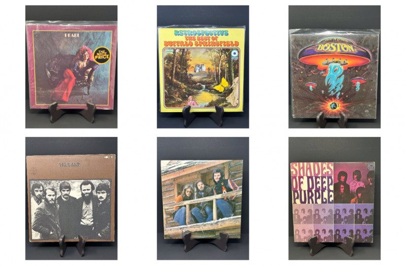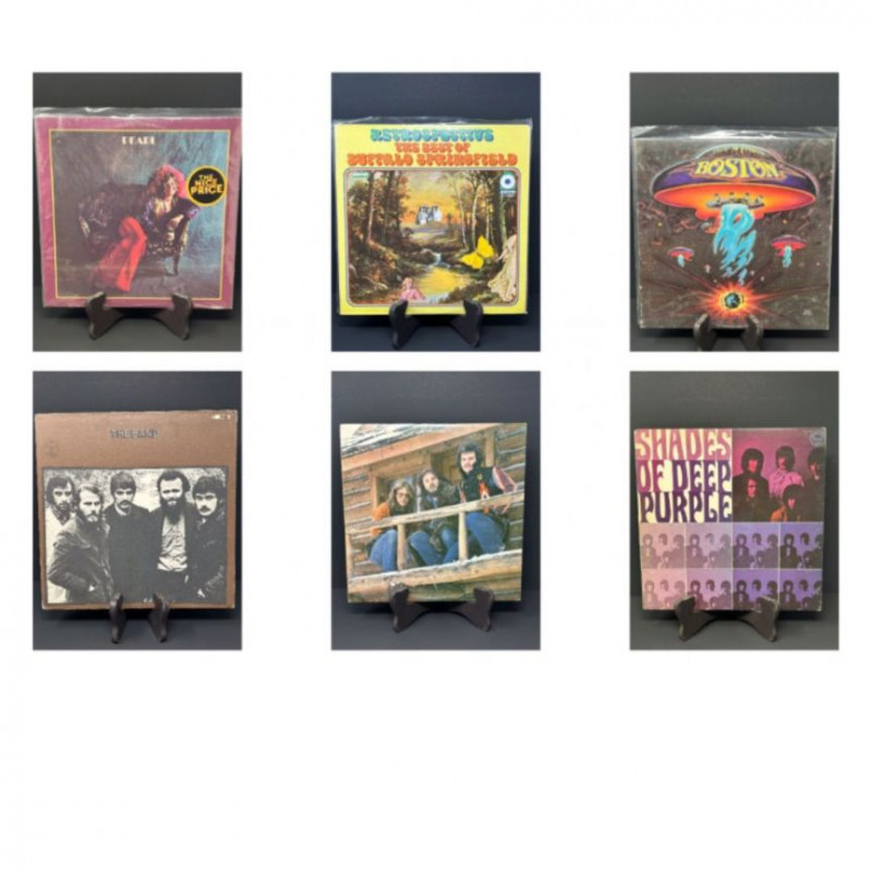 Nice lot of 6 vintage classic rock vinyl records featuring well-known artists from the late 1960s and 1970s. A great addition for collectors or fans of classic rock music. Albums included in this lot: • Pearl – Janis Joplin • Janis Joplin / Full Tilt Boogie Band • Retrospective: The Best of Buffalo Springfield – Buffalo Springfield • Boston – Boston • The Band – The Band • Shades of Deep Purple – Deep Purple Each album includes the vinyl record and its corresponding cover sleeve as shown. Some records are stored in protective plastic sleeves. Please review all photos carefully to see the album covers, record labels, and both sides of the vinyl records included in this lot.