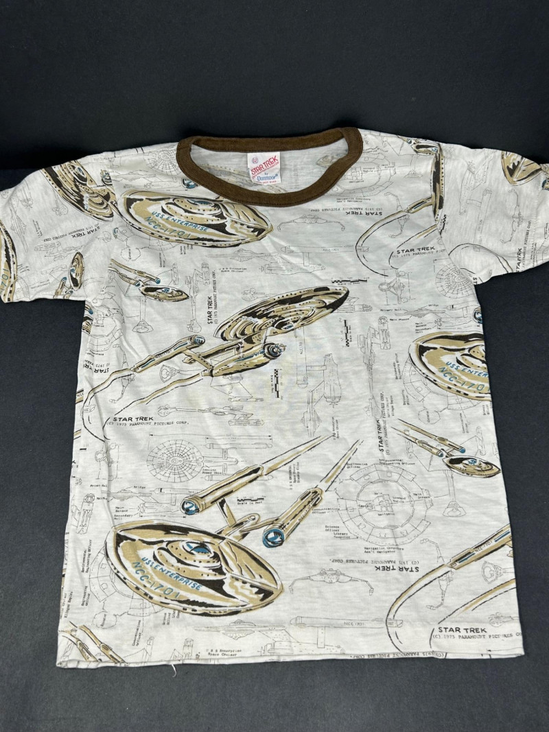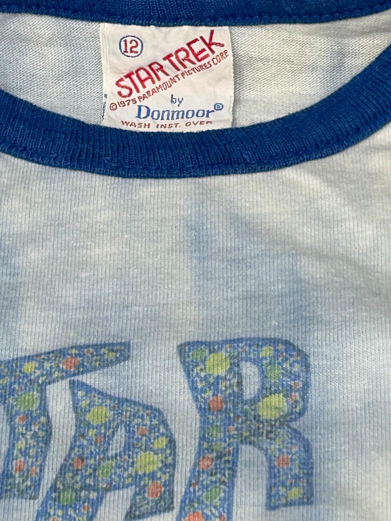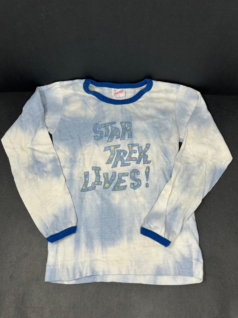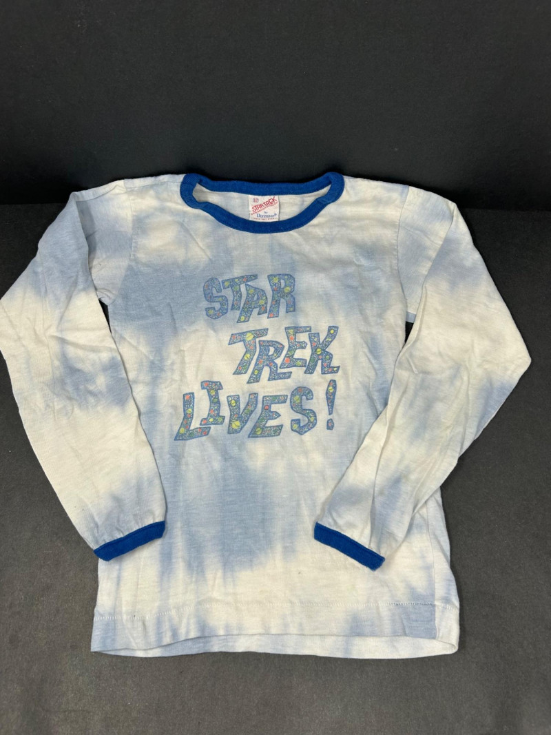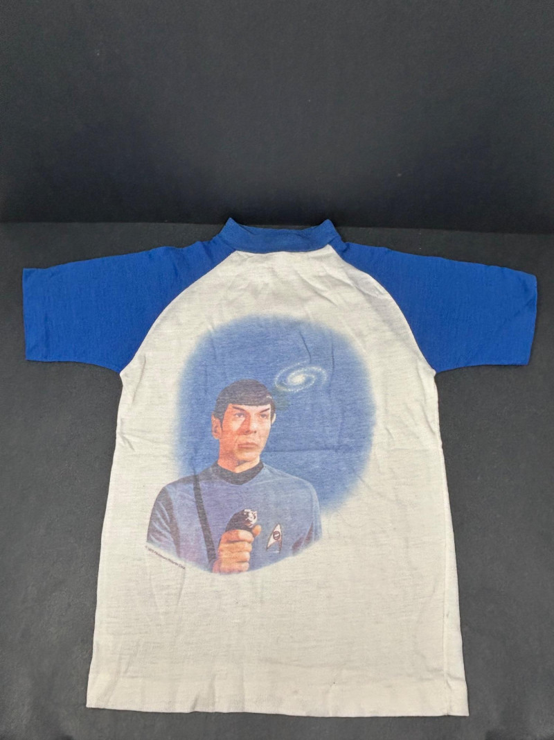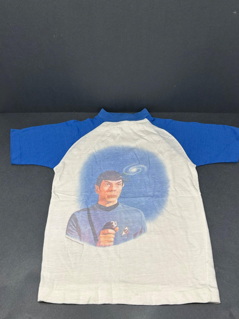 Lot of 3 vintage Star Trek kids t-shirts, featuring classic graphics and licensed designs from the 1970s. These shirts include rare Dormoor tags and iconic imagery from the original Star Trek series. Items Included: “Star Trek Lives!” Long Sleeve Shirt White shirt with blue collar and cuffs Colorful “Star Trek Lives!” graphic on the front Dormoor tag Marked size 10 Star Trek Enterprise All-Over Print Shirt Features starships and schematic-style illustrations across the shirt Brown collar Dormoor tag Marked size 12 Spock Graphic Raglan Shirt White body with blue raglan sleeves Large portrait graphic of Spock with galaxy background ©1973 Paramount Pictures Great vintage Star Trek collectible lot for fans, collectors, or display.