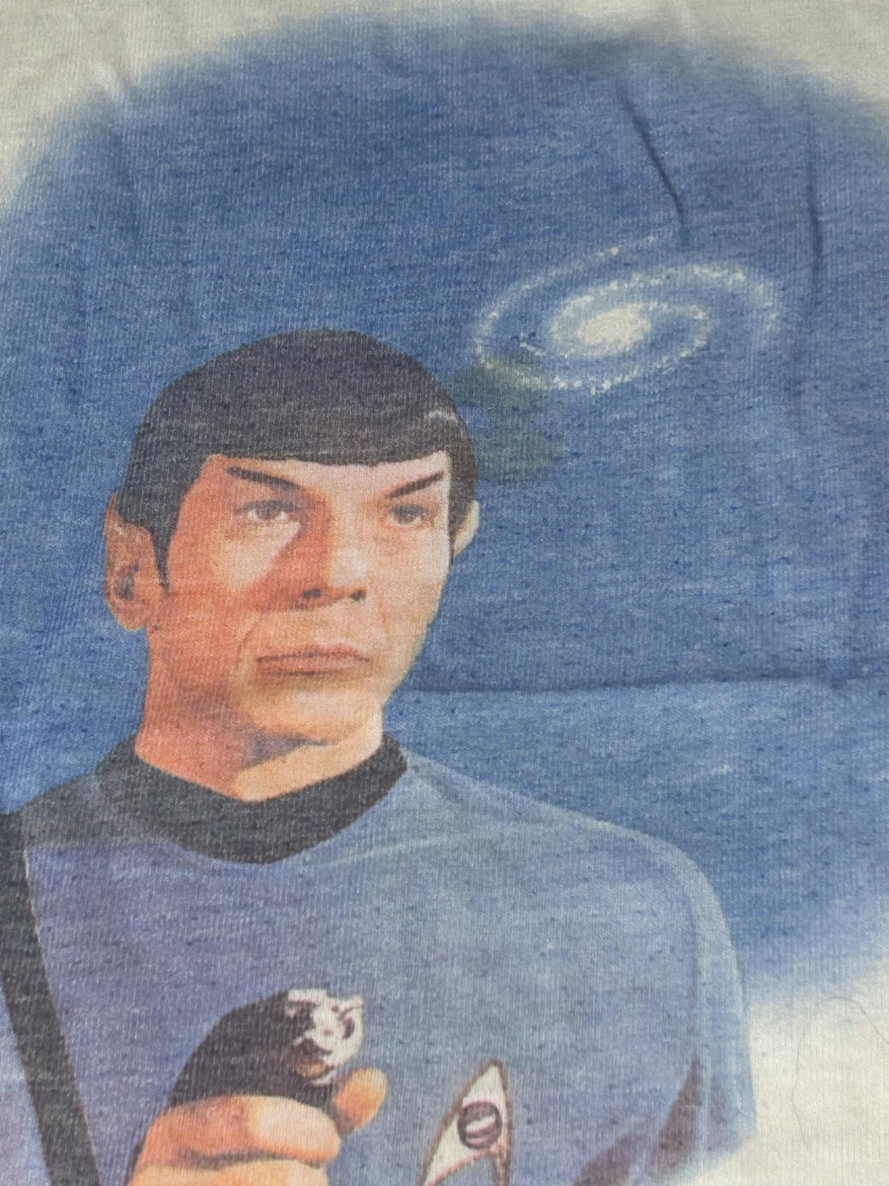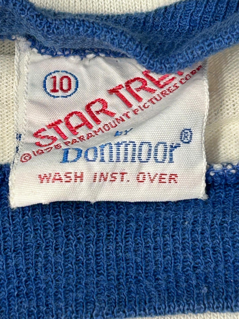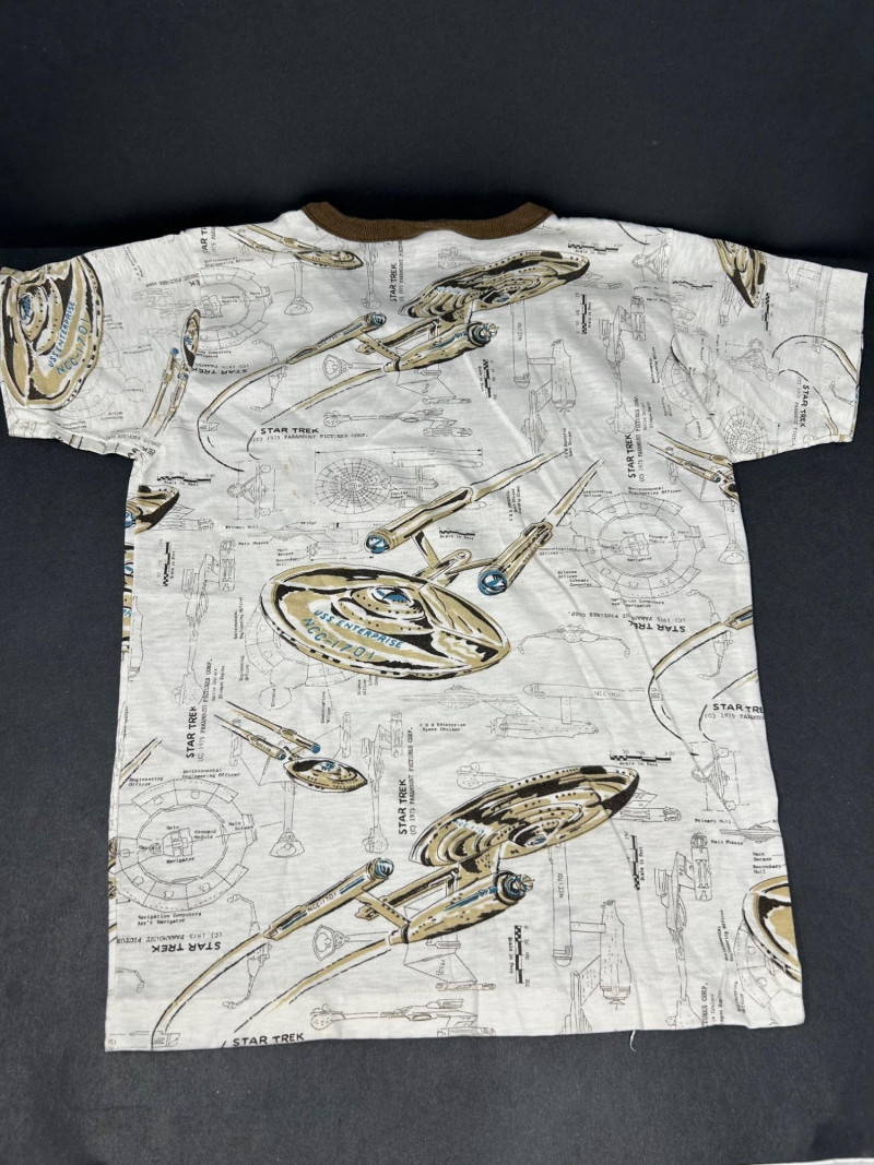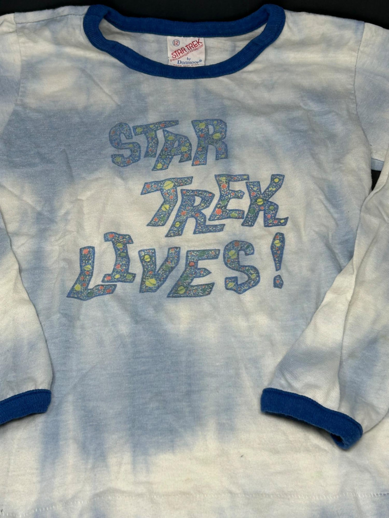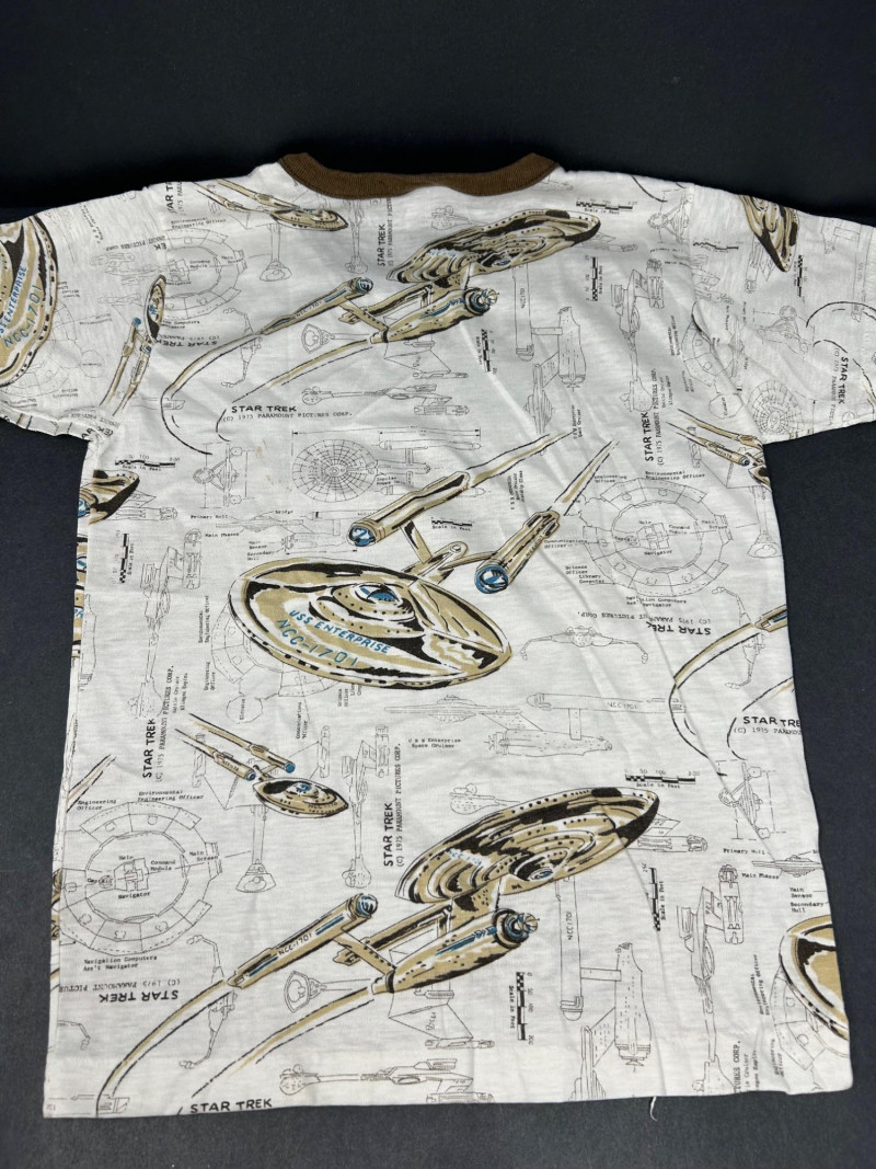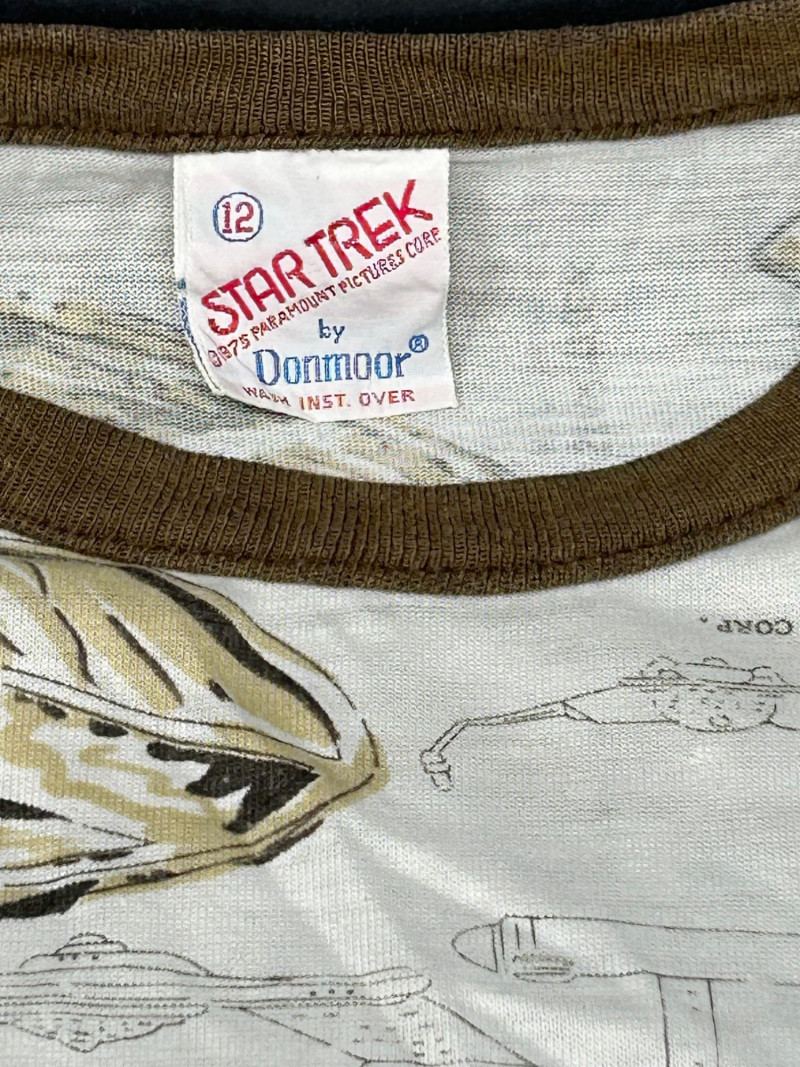 Lot of 3 vintage Star Trek kids t-shirts, featuring classic graphics and licensed designs from the 1970s. These shirts include rare Dormoor tags and iconic imagery from the original Star Trek series. Items Included: “Star Trek Lives!” Long Sleeve Shirt White shirt with blue collar and cuffs Colorful “Star Trek Lives!” graphic on the front Dormoor tag Marked size 10 Star Trek Enterprise All-Over Print Shirt Features starships and schematic-style illustrations across the shirt Brown collar Dormoor tag Marked size 12 Spock Graphic Raglan Shirt White body with blue raglan sleeves Large portrait graphic of Spock with galaxy background ©1973 Paramount Pictures Great vintage Star Trek collectible lot for fans, collectors, or display.