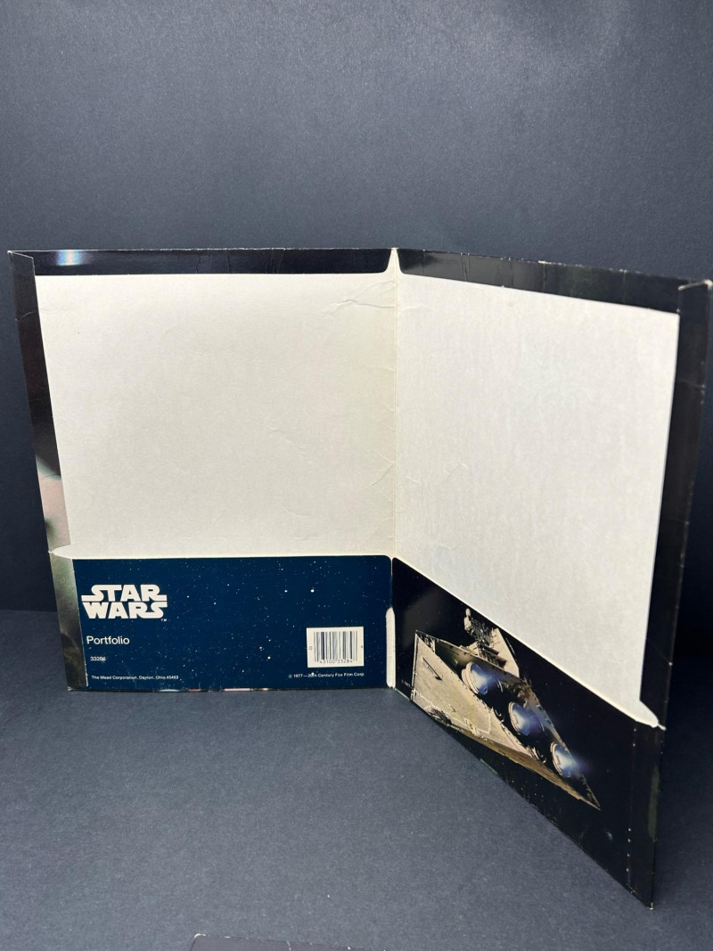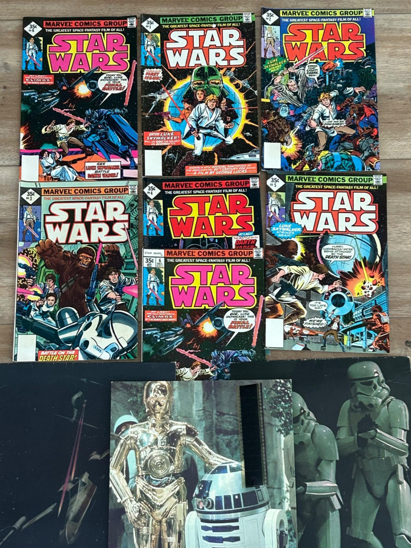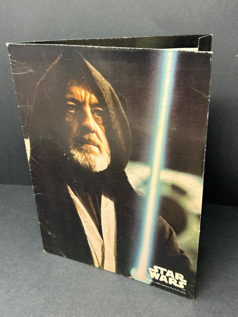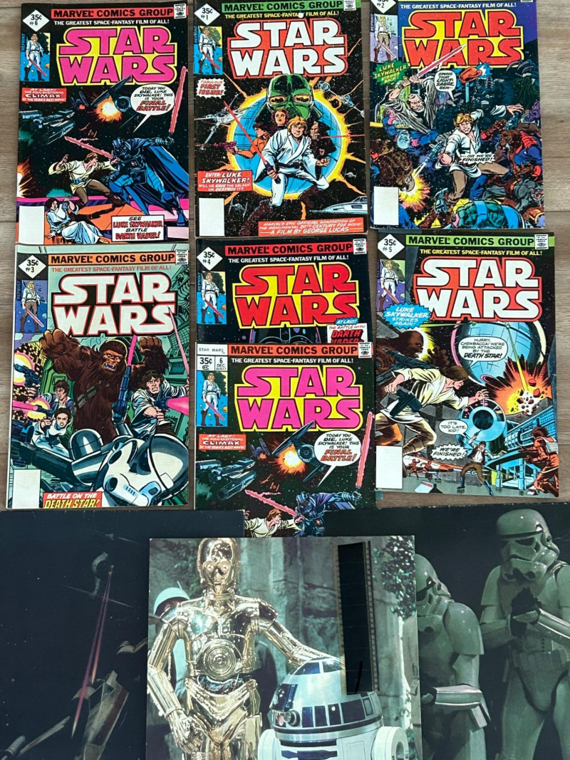 Up for auction is a Star Wars collectible lot featuring vintage Marvel comics along with Star Wars themed portfolio folders and a film strip display piece. A great set for collectors of classic Star Wars memorabilia. The comics showcase iconic characters such as Luke Skywalker, Darth Vader, Princess Leia, Chewbacca, and other classic Star Wars characters from the original trilogy era. Included in this lot are multiple Marvel Star Wars comic books (35¢ cover price era), Star Wars portfolio folders featuring Obi-Wan Kenobi, Stormtroopers, and C-3PO with R2-D2, and a Star Wars film strip collectible displaymounted in a protective case. The artwork and covers are colorful and highly collectible, making this lot a great addition to any Star Wars or vintage comic collection. Item Details: Franchise: Star Wars