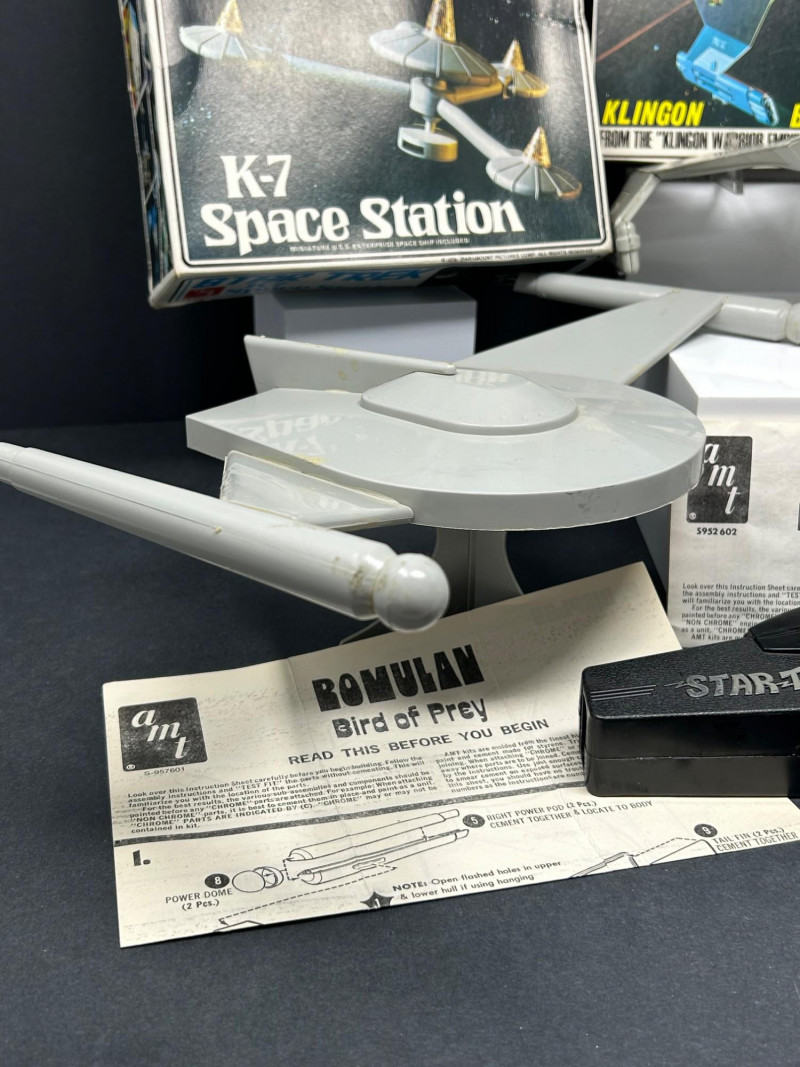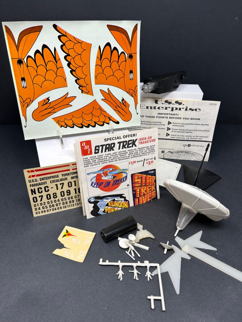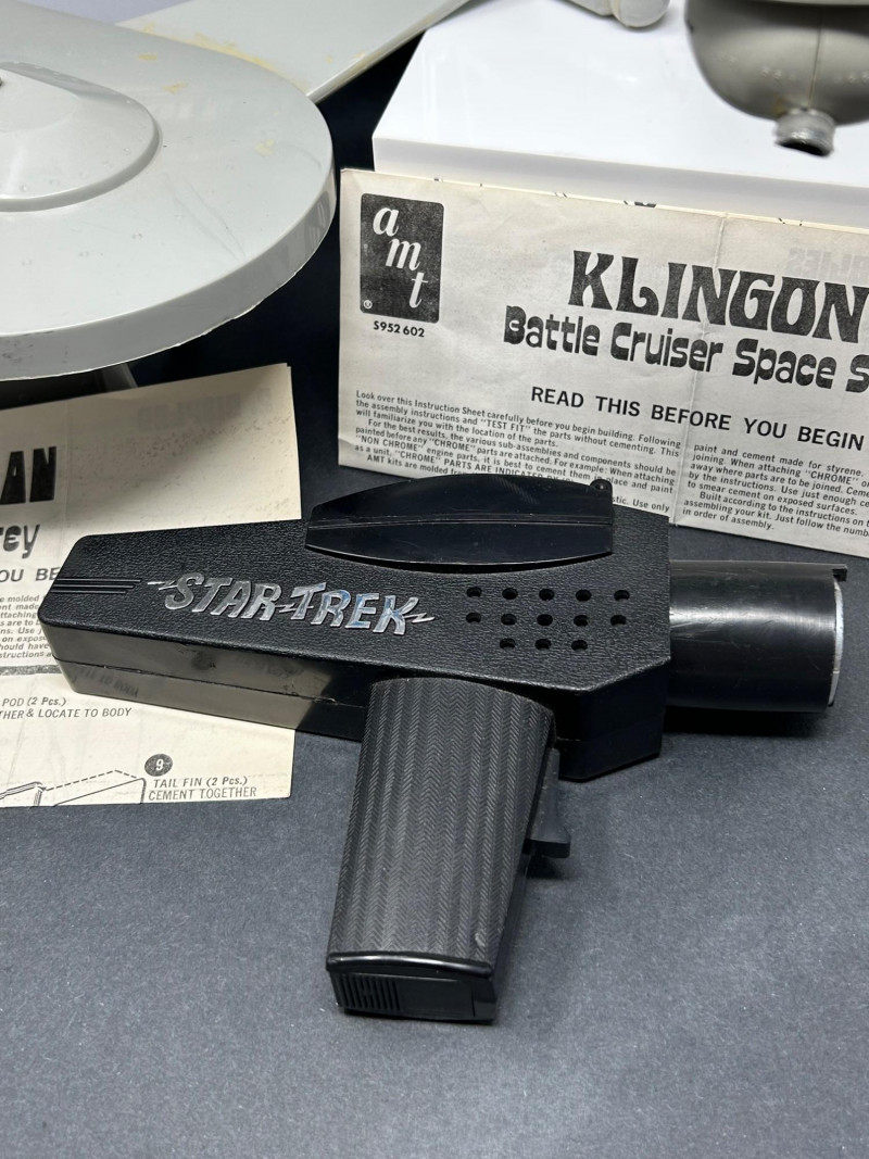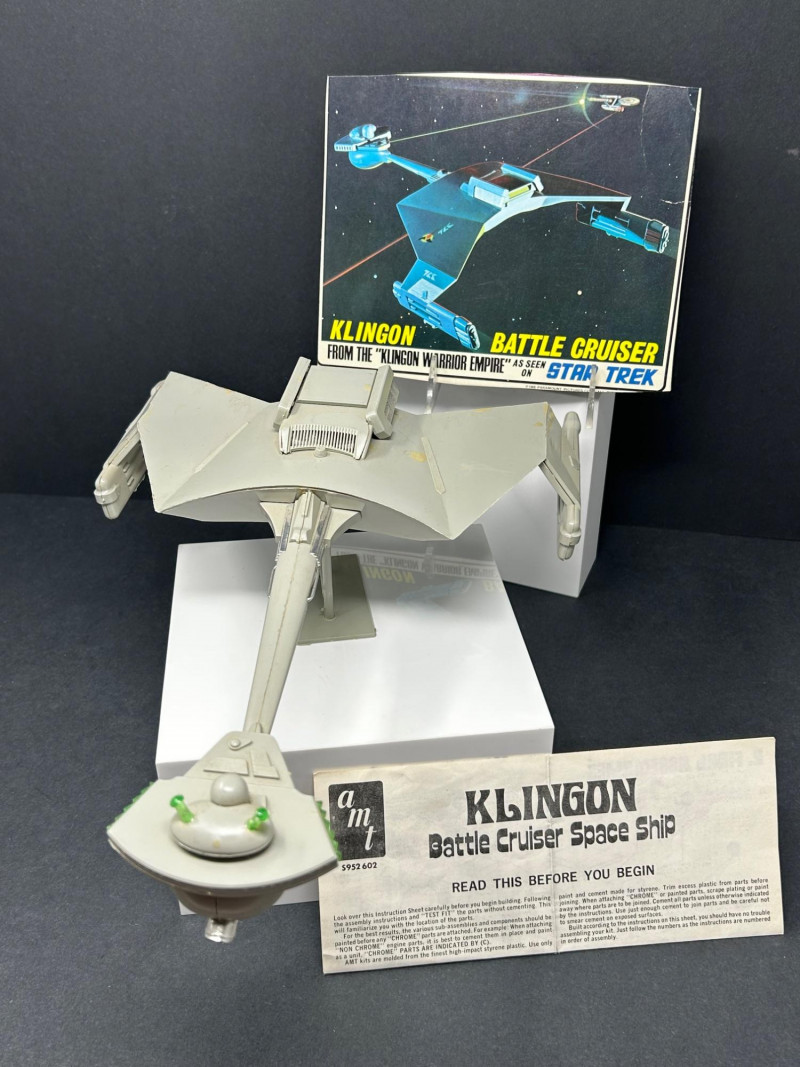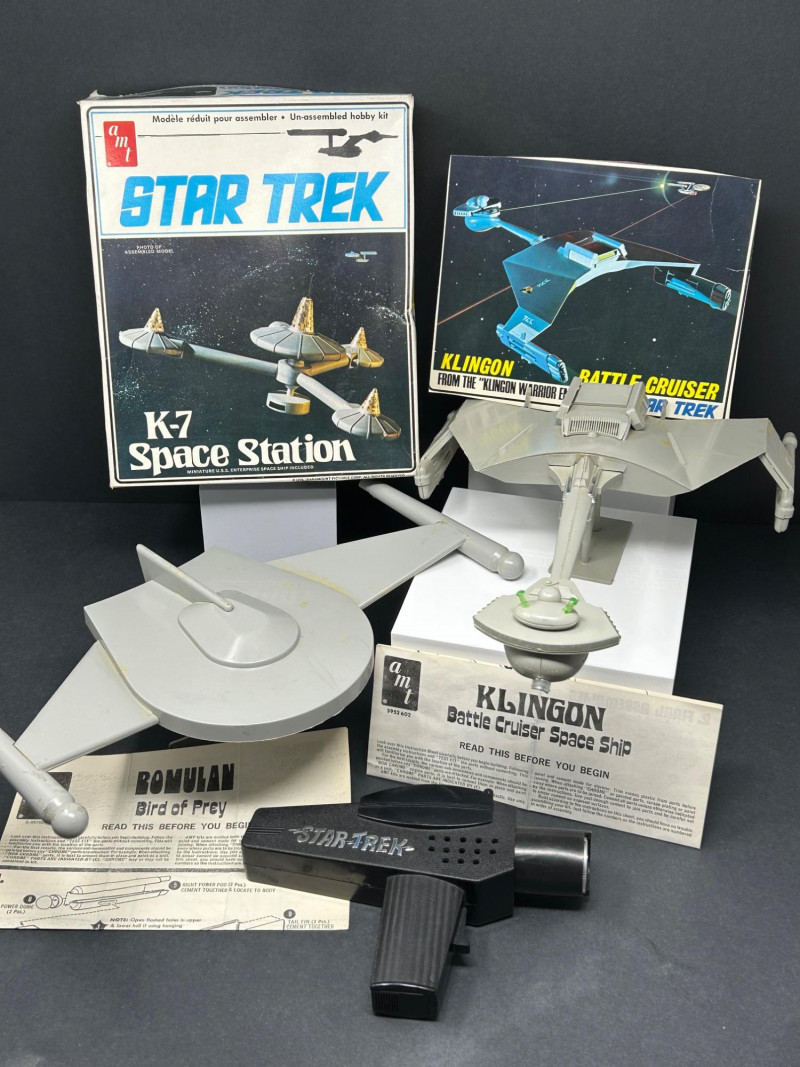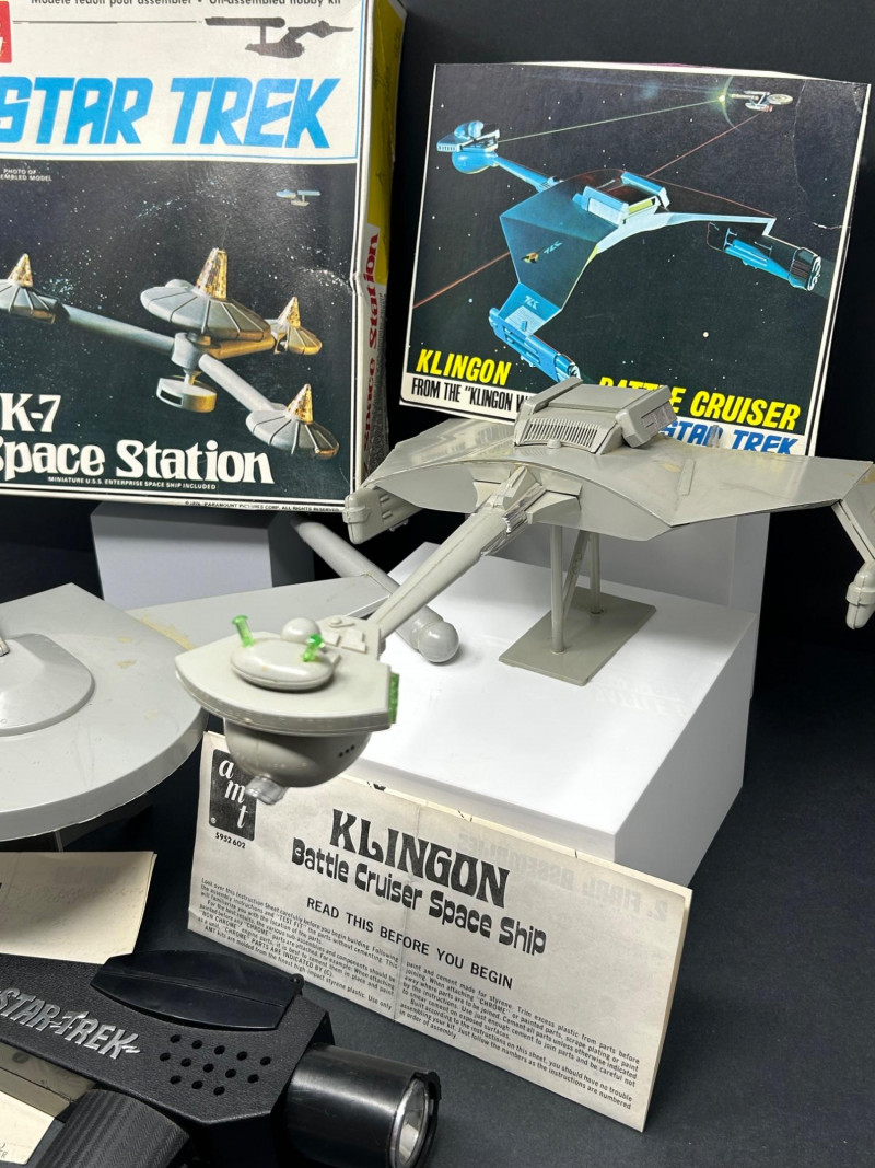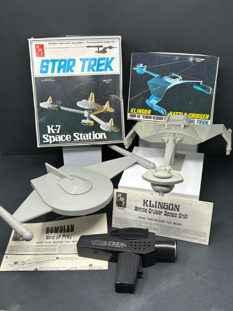 Vintage Star Trek model kit and memorabilia lot featuring several classic sci-fi collectibles and parts from AMT. Items include both assembled and unassembled pieces along with original paperwork and accessories. Item Details: • Klingon Battle Cruiser Space Ship – partially assembled model with display stand There are also additional small parts and miscellaneous pieces included in the lot as shown in the photos.