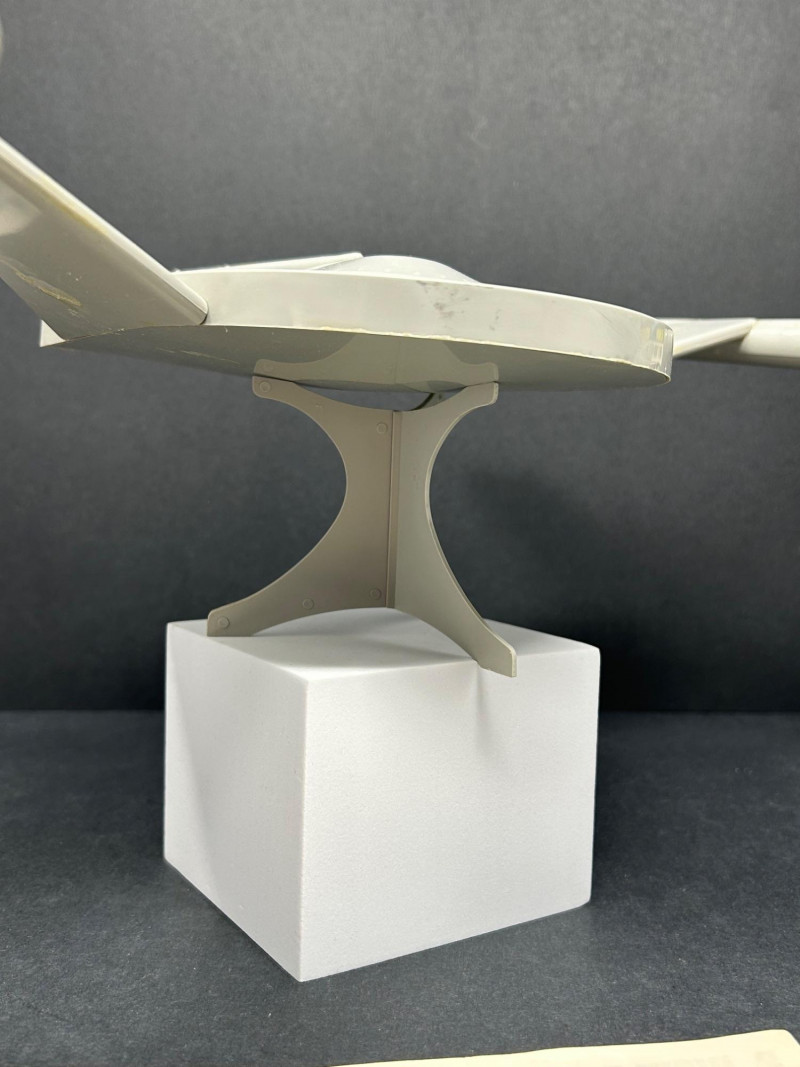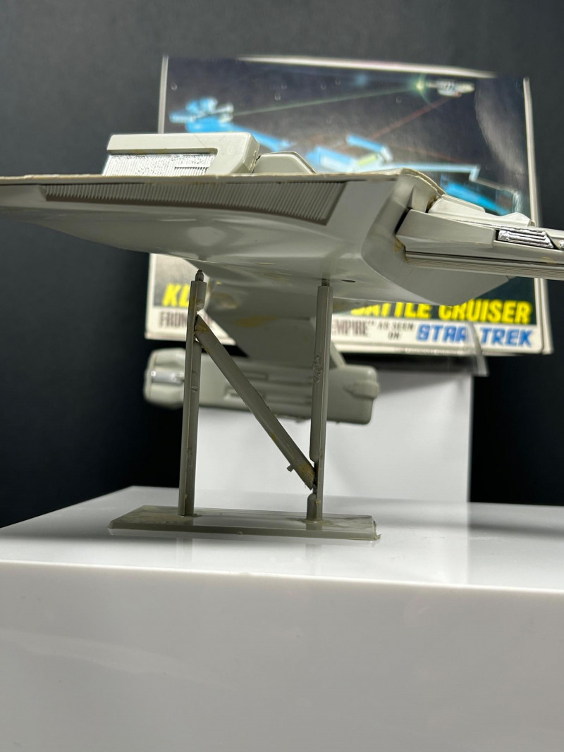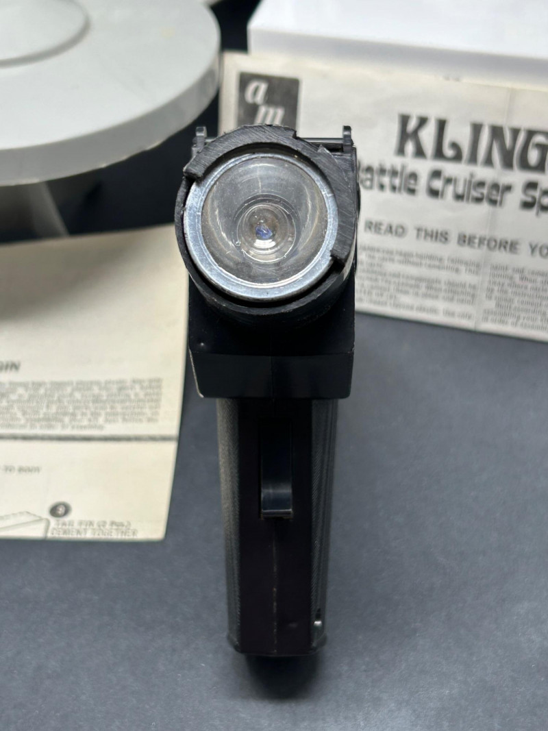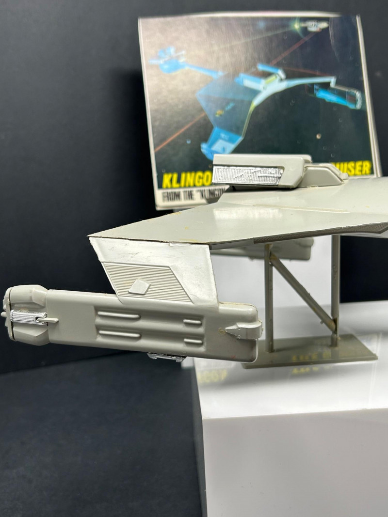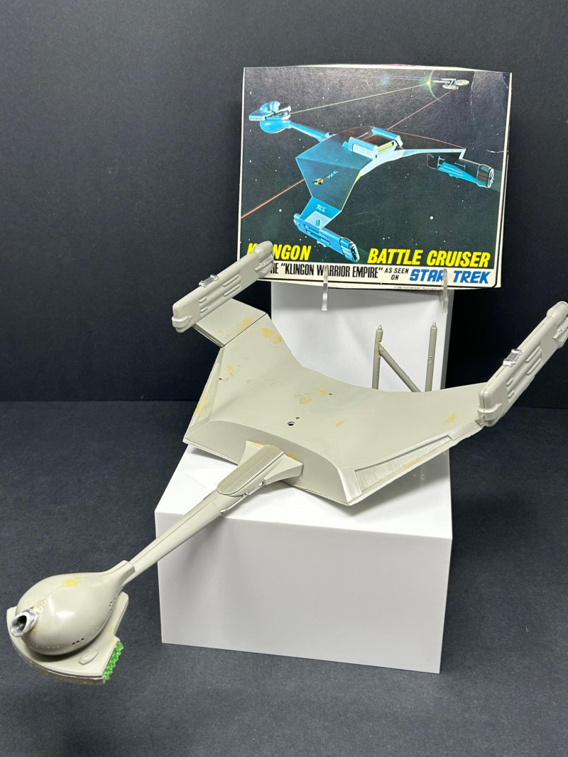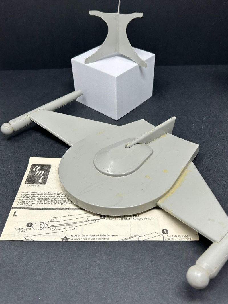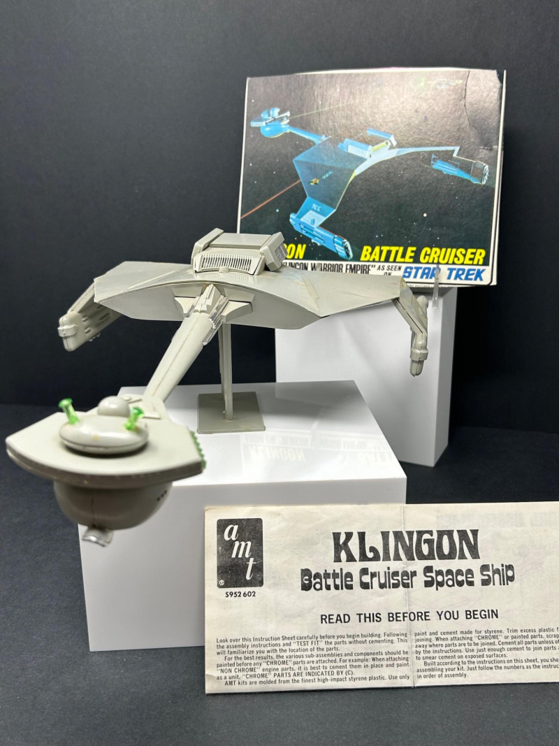 Vintage Star Trek model kit and memorabilia lot featuring several classic sci-fi collectibles and parts from AMT. Items include both assembled and unassembled pieces along with original paperwork and accessories. Item Details: • Klingon Battle Cruiser Space Ship – partially assembled model with display stand There are also additional small parts and miscellaneous pieces included in the lot as shown in the photos.