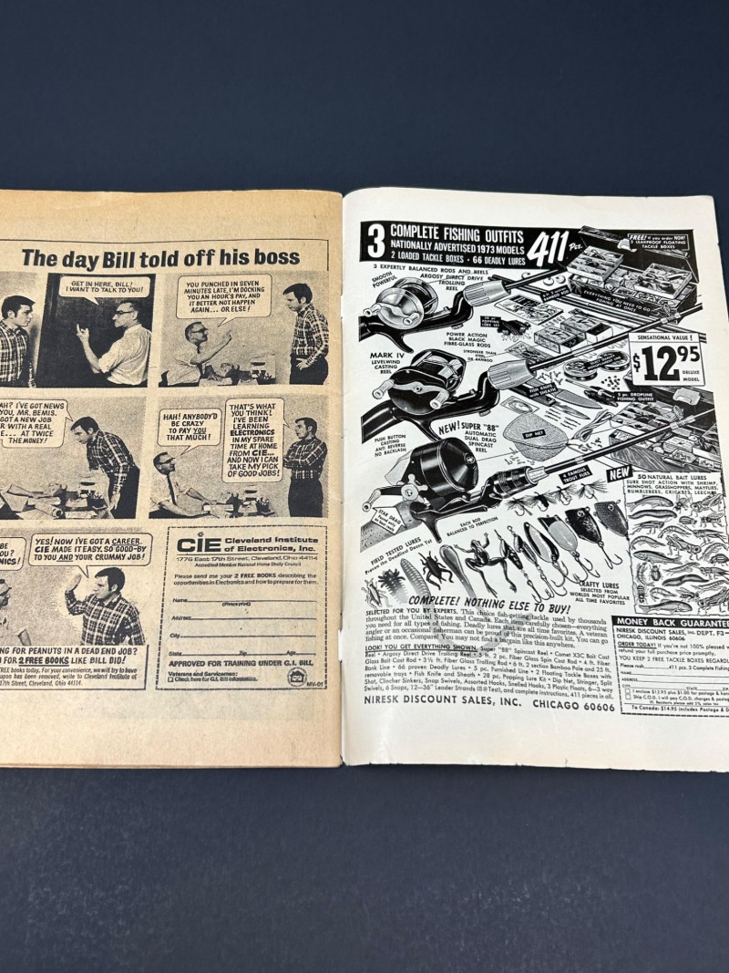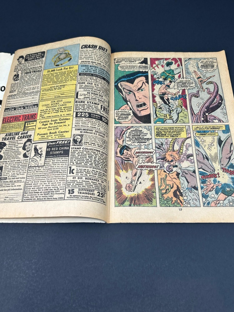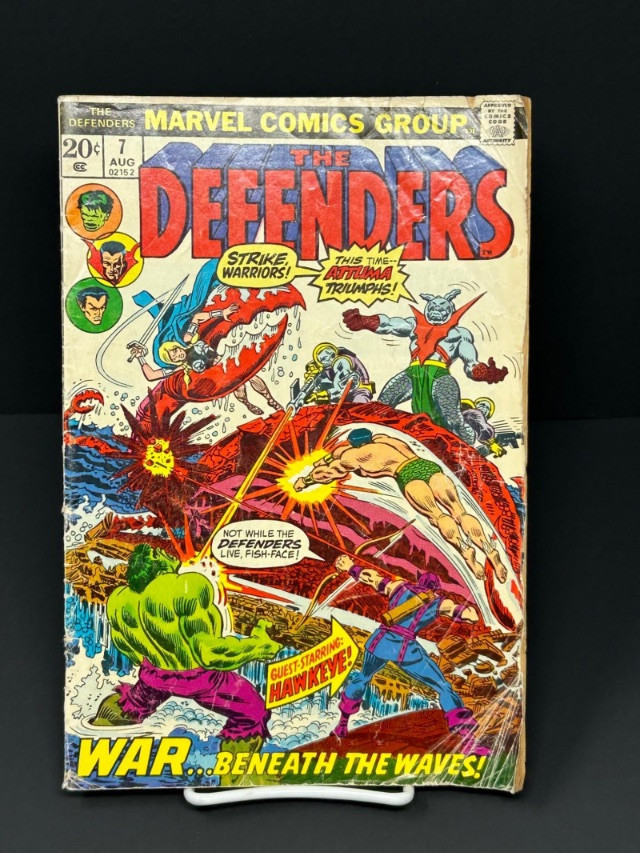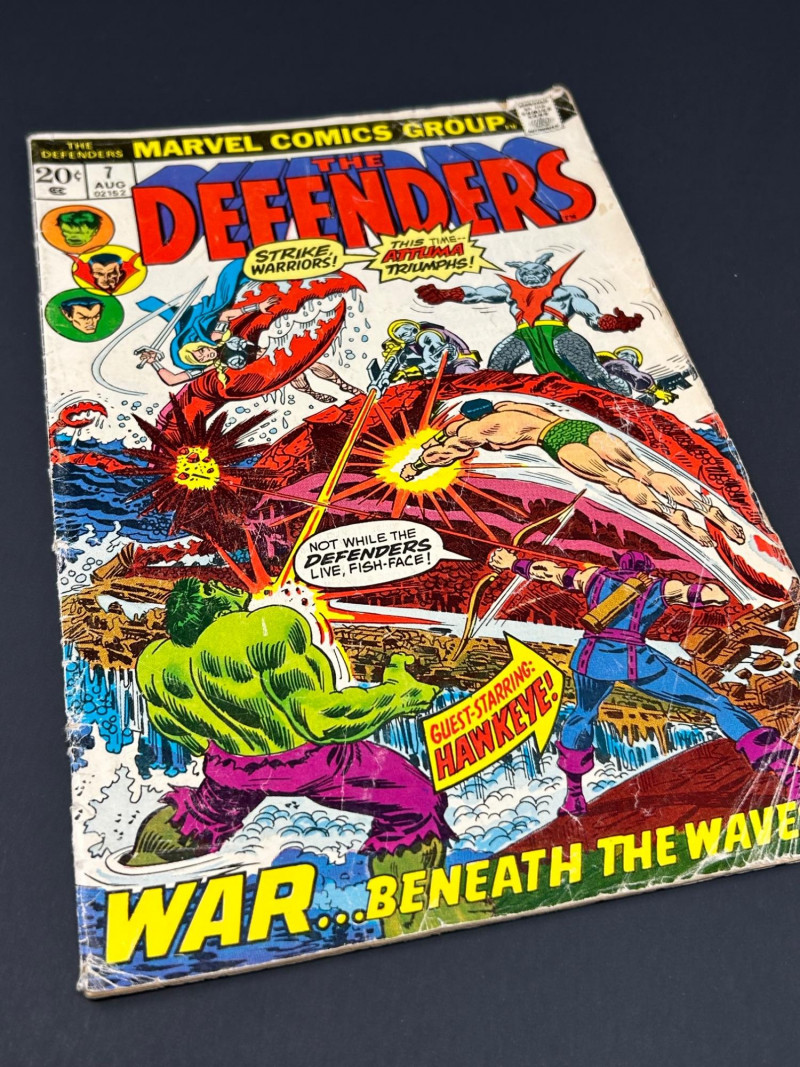 Classic Bronze Age Marvel comic featuring The Defenders #7, published by Marvel Comics in August 1973. This issue features the story “War… Beneath the Waves!” with the Defenders battling Attuma and his underwater forces, and includes a guest appearance by Hawkeye. The cover also highlights characters such as Hulk, Doctor Strange, and Namor. Inside pages include the full comic story along with vintage advertisements and Marvel promo pages typical of early-1970s issues. A great collectible for fans of classic Marvel comics and Bronze Age superhero titles. Details: Title: The Defenders Issue: #7 Publisher: Marvel Comics Group Date: August 1973 Price on cover: 20¢ Story title: “War… Beneath the Waves!” Guest starring Hawkeye Includes original ads and Marvel preview pages A nice vintage comic that would make a great addition to any Marvel, Hulk, or Defenders collection.