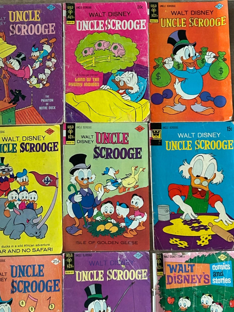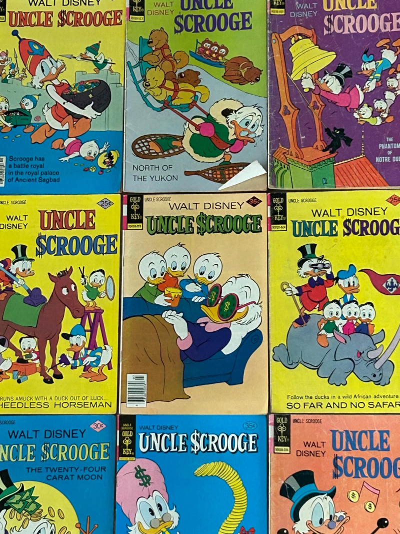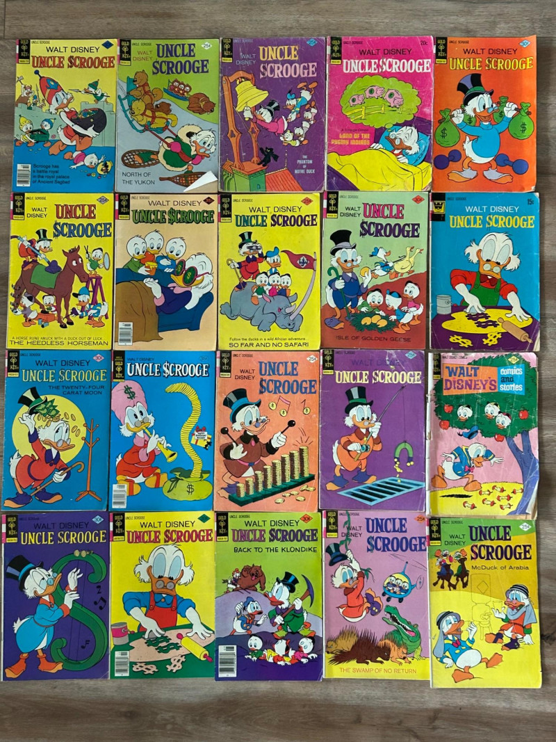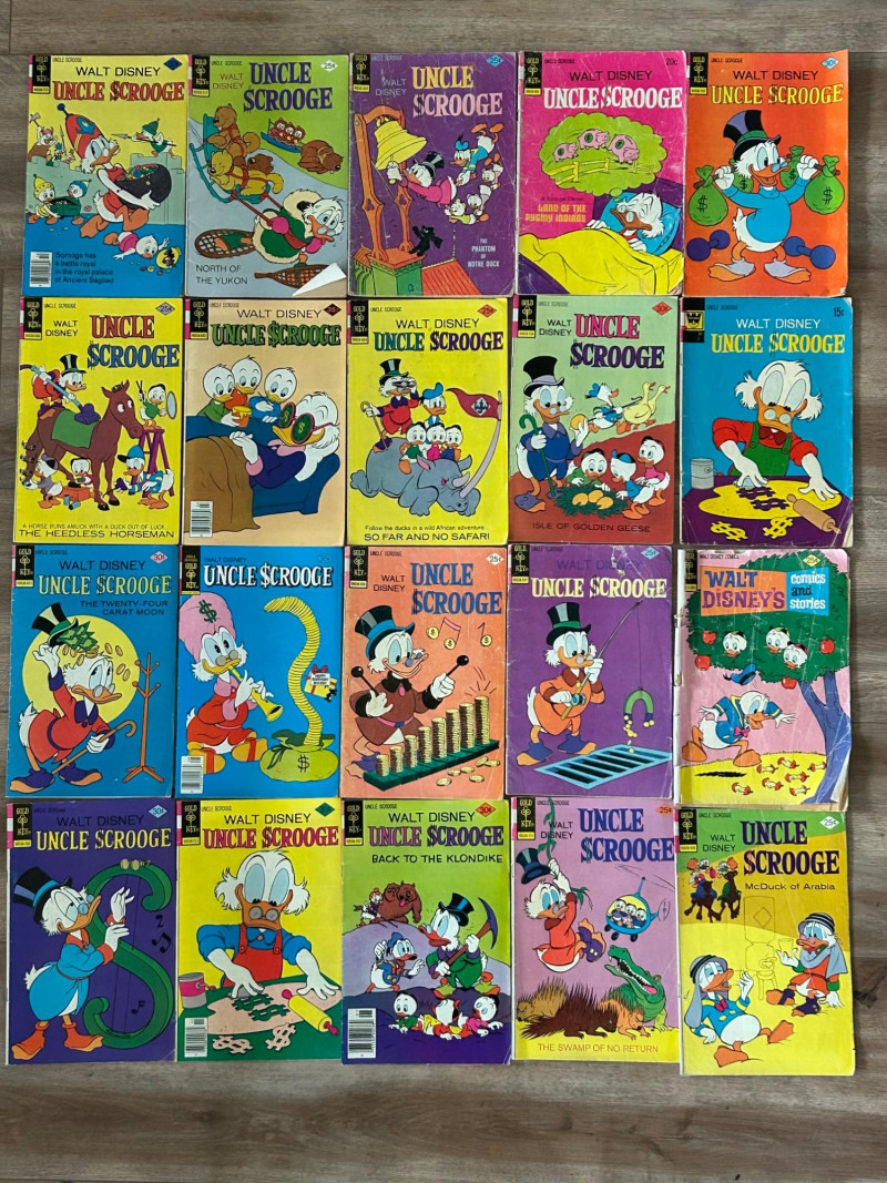 Up for auction is a lot of 20 vintage Walt Disney Uncle Scrooge comic books published by Gold Key Comics. These classic Disney comics feature the adventures of Uncle Scrooge, Donald Duck, and Huey, Dewey & Louie, with colorful artwork and fun treasure-hunting stories. These vintage Disney comics make a great addition for collectors, readers, or fans of classic Disney adventures. Included Stories / Titles: Back to the Klondike McDuck of Arabia Isle of Golden Geese The Swamp of No Return The Twenty-Four Carat Moon So Far and No Safari The Heel-less Horseman North of the Yukon Land of the Pygmy Indians Phantom of the Note Duck Walt Disney’s Comics and Stories (Scrooge appearance) Plus additional Uncle Scrooge adventures