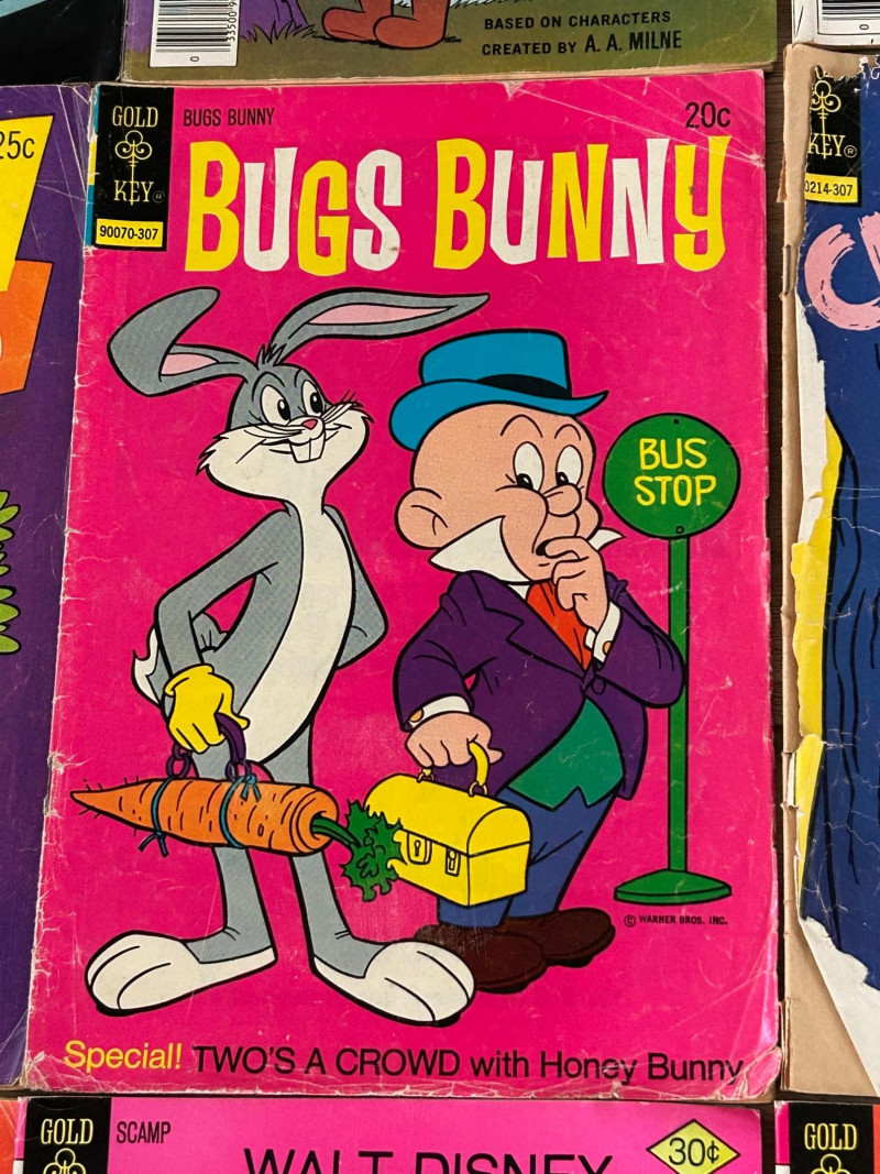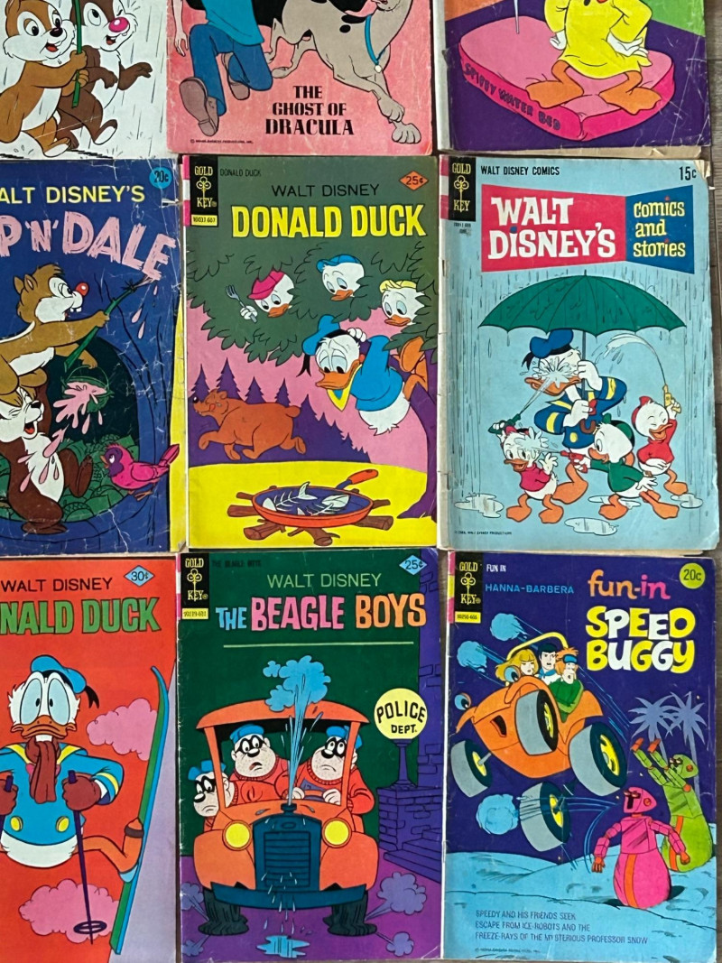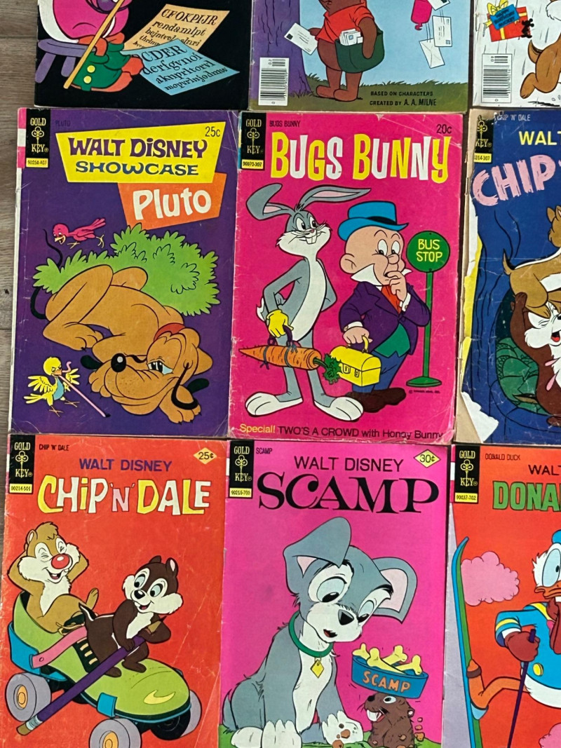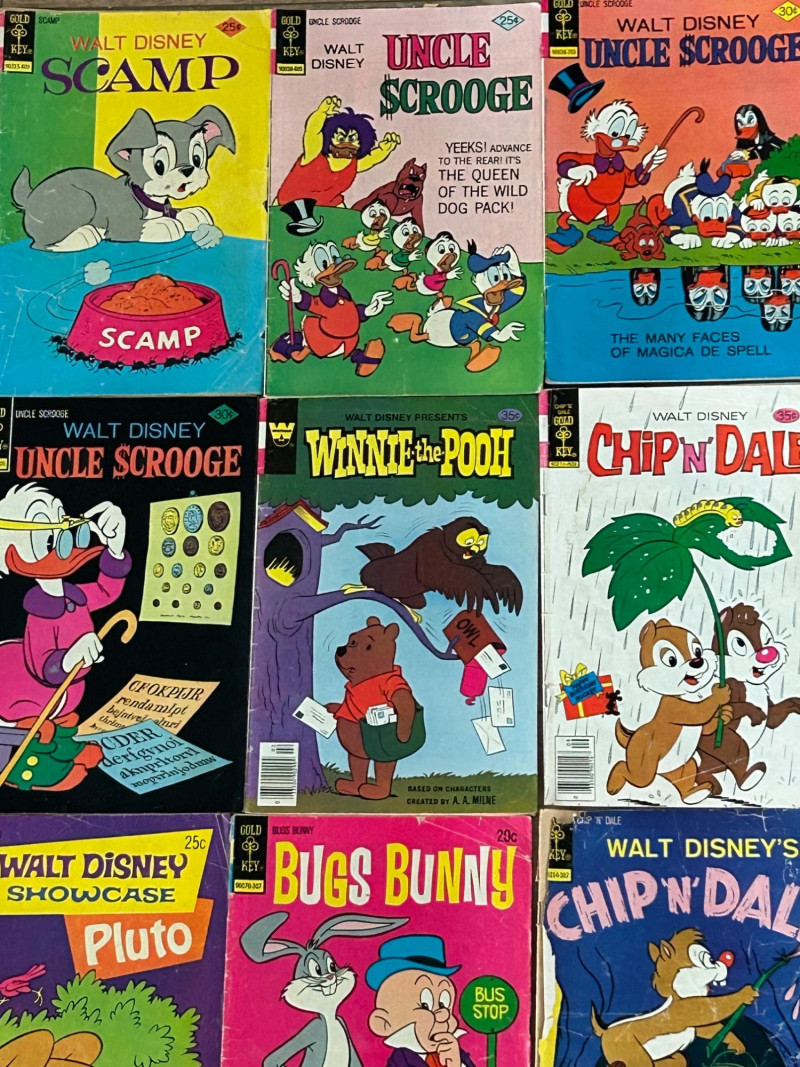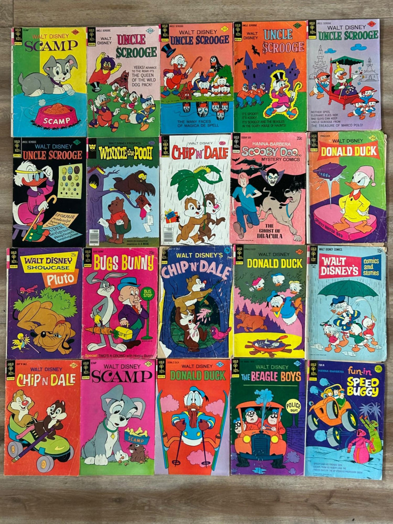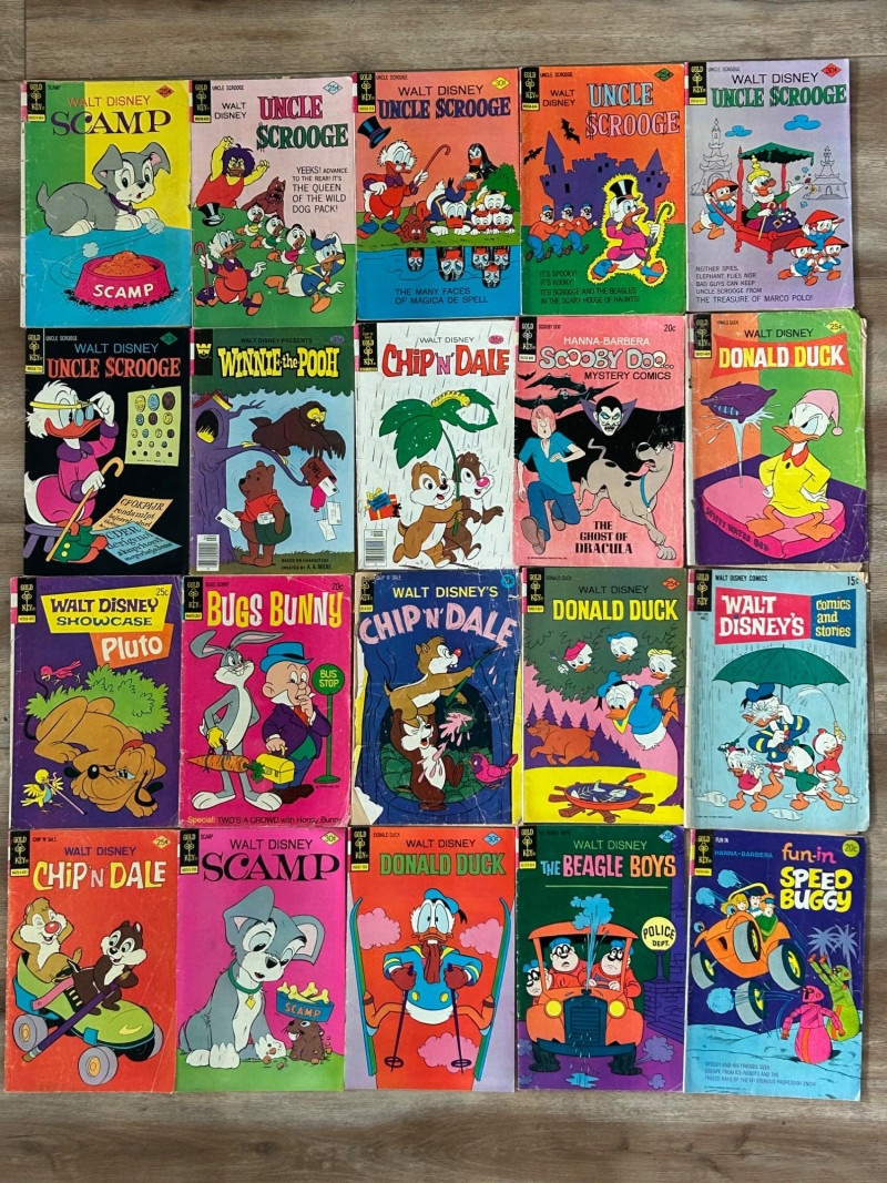 Up for auction is a colorful lot of 20 vintage comic books featuring classic Disney and cartoon characters. This collection includes popular titles such as Donald Duck, Uncle Scrooge, Chip ‘n’ Dale, Scamp, Walt Disney’s Comics and Stories, Winnie the Pooh, The Beagle Boys, Bugs Bunny, Pluto, and Hanna-Barbera Scooby-Doo Mystery Comics. These comics showcase the fun and nostalgic artwork from the classic Disney and cartoon era. A great lot for collectors, vintage comic enthusiasts, or anyone who enjoys classic cartoon characters. Included Titles / Characters: Walt Disney’s Donald Duck Walt Disney’s Uncle Scrooge Chip ‘n’ Dale Scamp Walt Disney’s Comics and Stories Winnie the Pooh The Beagle Boys Bugs Bunny Pluto Scooby-Doo Mystery Comics Fun-In Speed Buggy