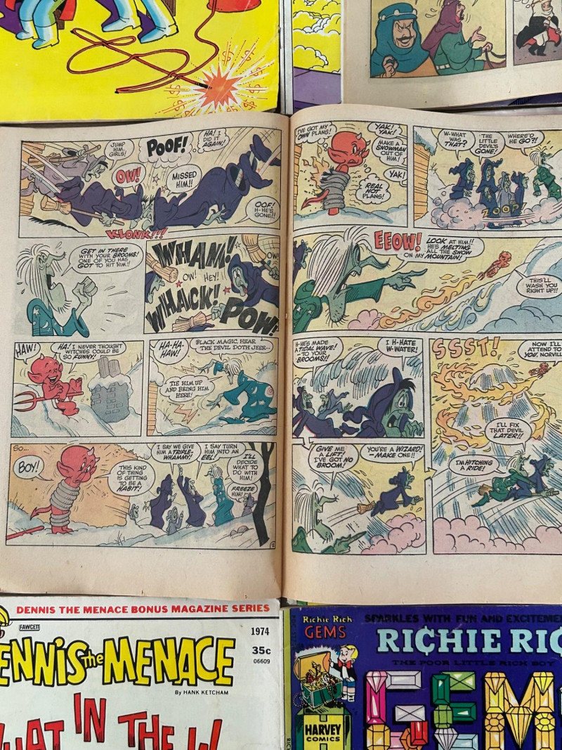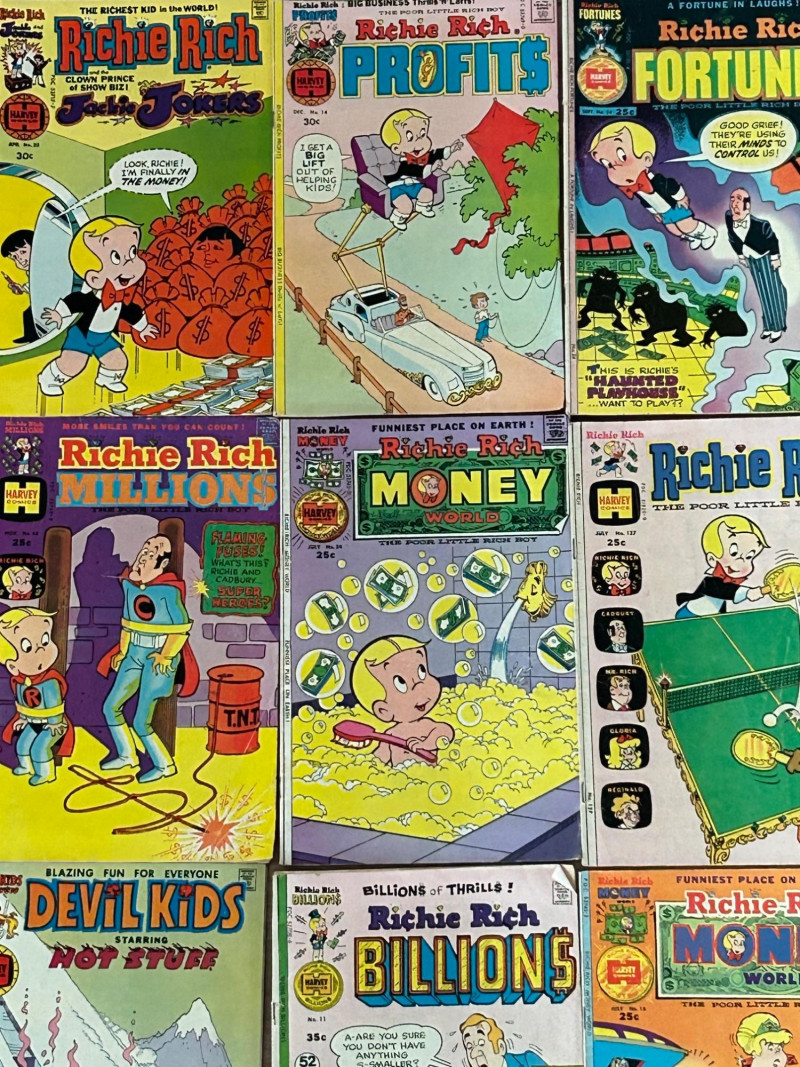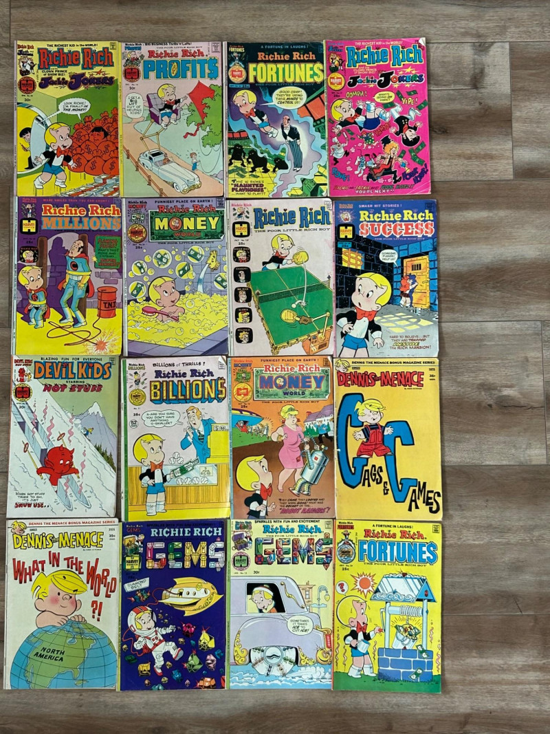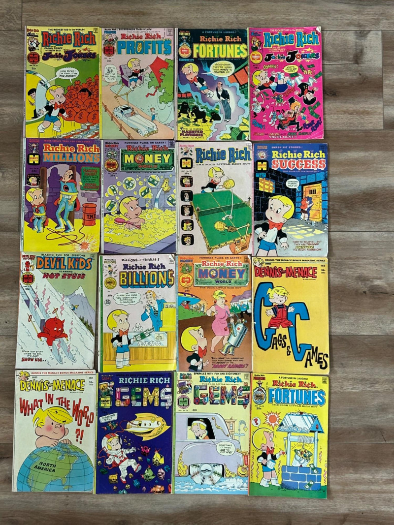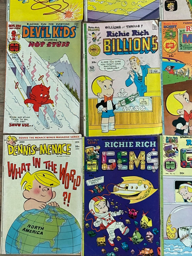 Up for auction is a colorful lot of 16 vintage comic books, mostly featuring Richie Rich titles from Harvey Comics, along with a few Dennis the Menace and Devil Kids issues. These classic comics showcase the fun, light-hearted stories that made Harvey characters so popular. Included titles feature: Richie Rich (various series including Money World, Fortunes, Profits, Success, Gems, Billions, Millions, and Jokes & Jokers) Dennis the Menace Devil Kids Starring Hot Stuff These comics appear to be vintage newsstand copies with bright covers and classic advertisements inside. Condition varies from issue to issue, with typical signs of age such as edge wear, spine stress, small creases, or light handling marks. They remain great collectible reading copies and display nicely with vibrant artwork. Lot Details: Total: 16 comic books Publisher: Harvey Comics Characters: Richie Rich, Dennis the Menace, Hot Stuff (Devil Kids) Format: Vintage single issues Sold as a lot A fun bundle for vintage comic collectors, Richie Rich fans, or Harvey Comics enthu