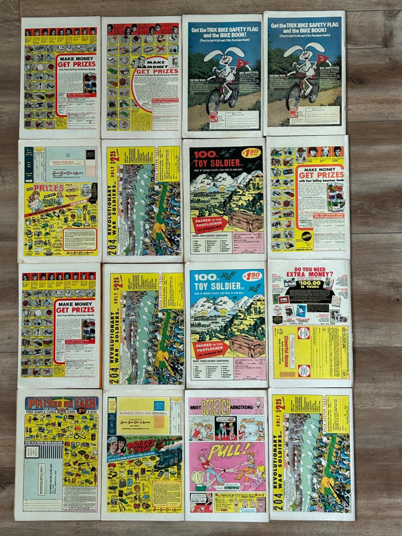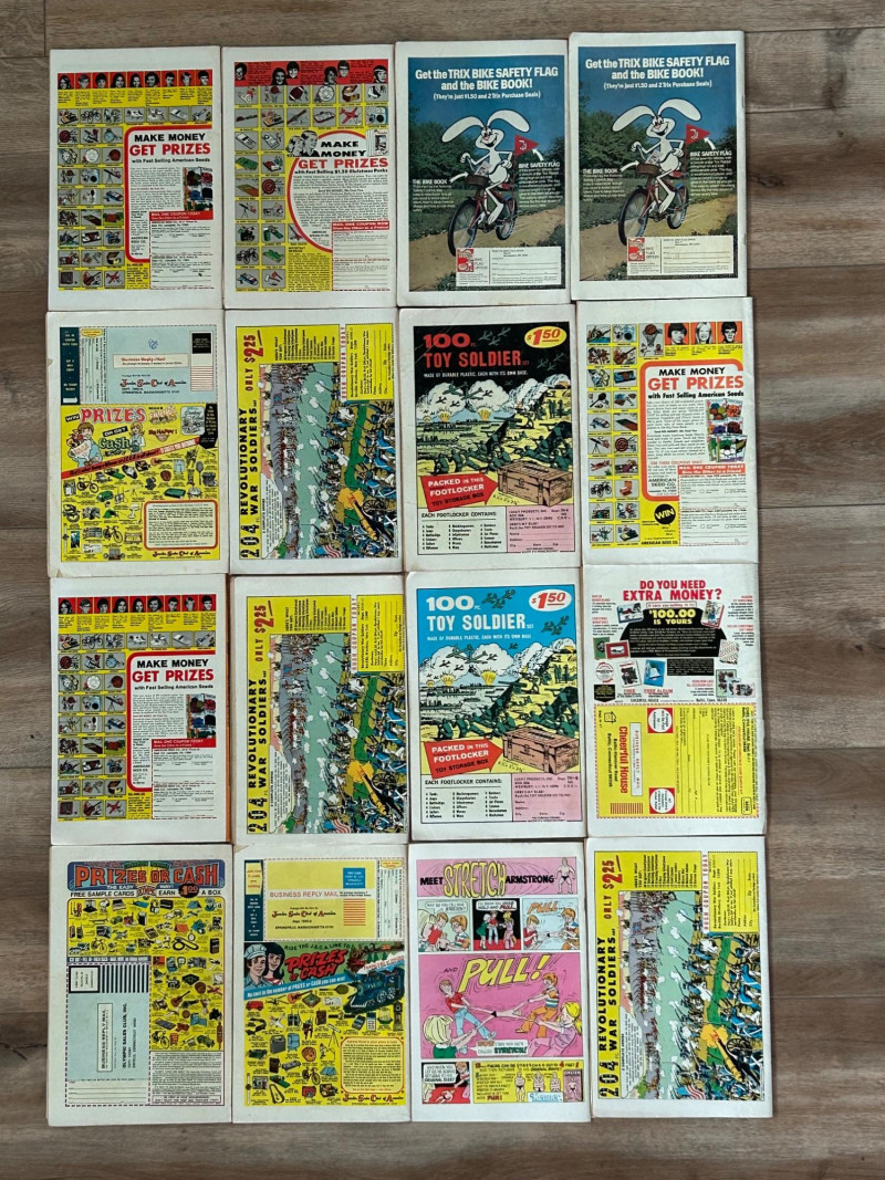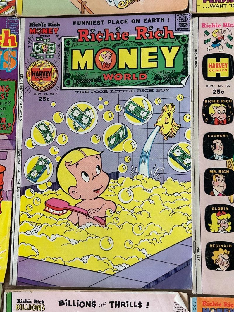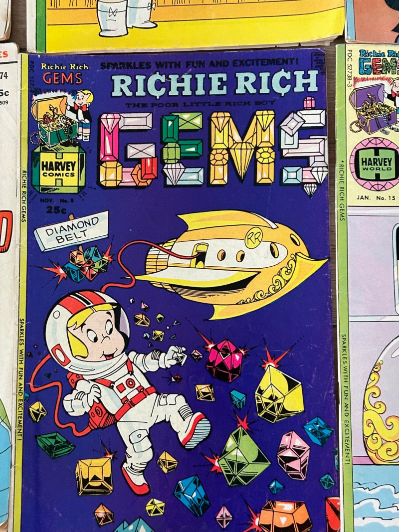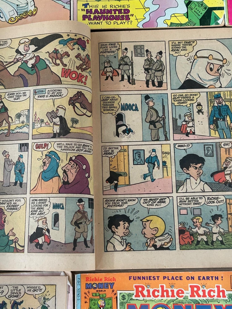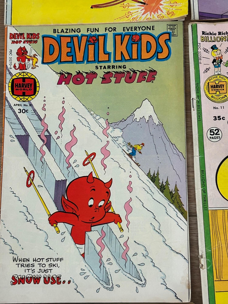 Up for auction is a colorful lot of 16 vintage comic books, mostly featuring Richie Rich titles from Harvey Comics, along with a few Dennis the Menace and Devil Kids issues. These classic comics showcase the fun, light-hearted stories that made Harvey characters so popular. Included titles feature: Richie Rich (various series including Money World, Fortunes, Profits, Success, Gems, Billions, Millions, and Jokes & Jokers) Dennis the Menace Devil Kids Starring Hot Stuff These comics appear to be vintage newsstand copies with bright covers and classic advertisements inside. Condition varies from issue to issue, with typical signs of age such as edge wear, spine stress, small creases, or light handling marks. They remain great collectible reading copies and display nicely with vibrant artwork. Lot Details: Total: 16 comic books Publisher: Harvey Comics Characters: Richie Rich, Dennis the Menace, Hot Stuff (Devil Kids) Format: Vintage single issues Sold as a lot A fun bundle for vintage comic collectors, Richie Rich fans, or Harvey Comics enthu