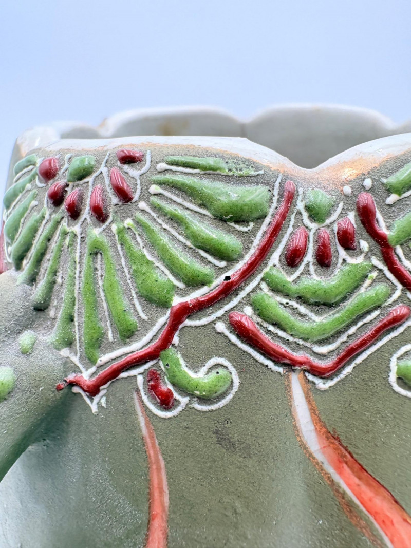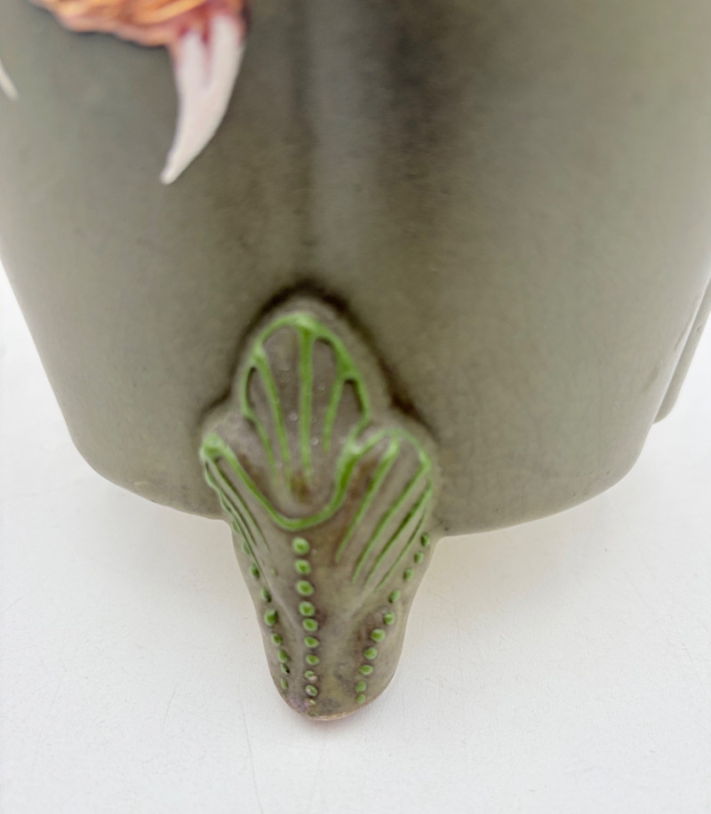 dull olive green background. Scalloped upper edge and 3 small legs. Slight