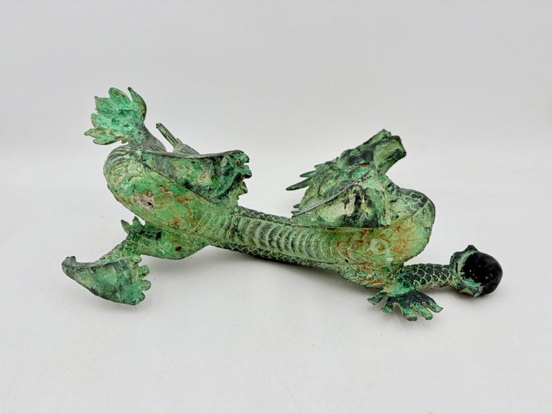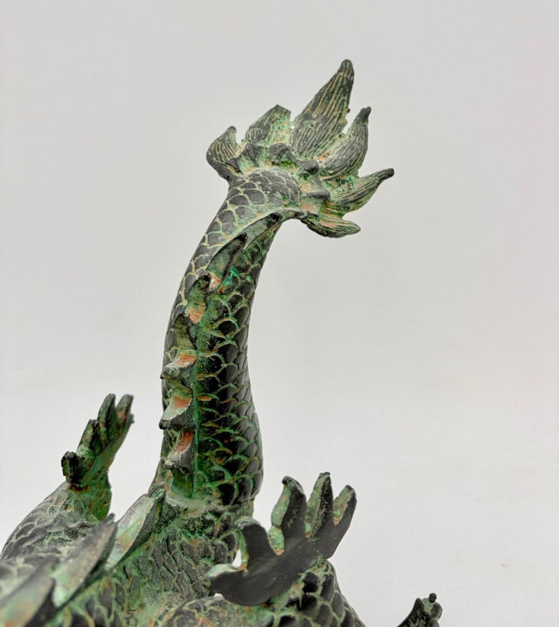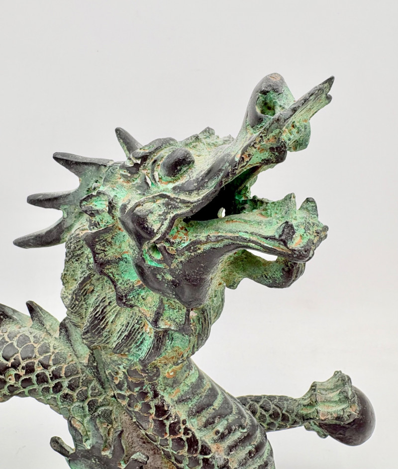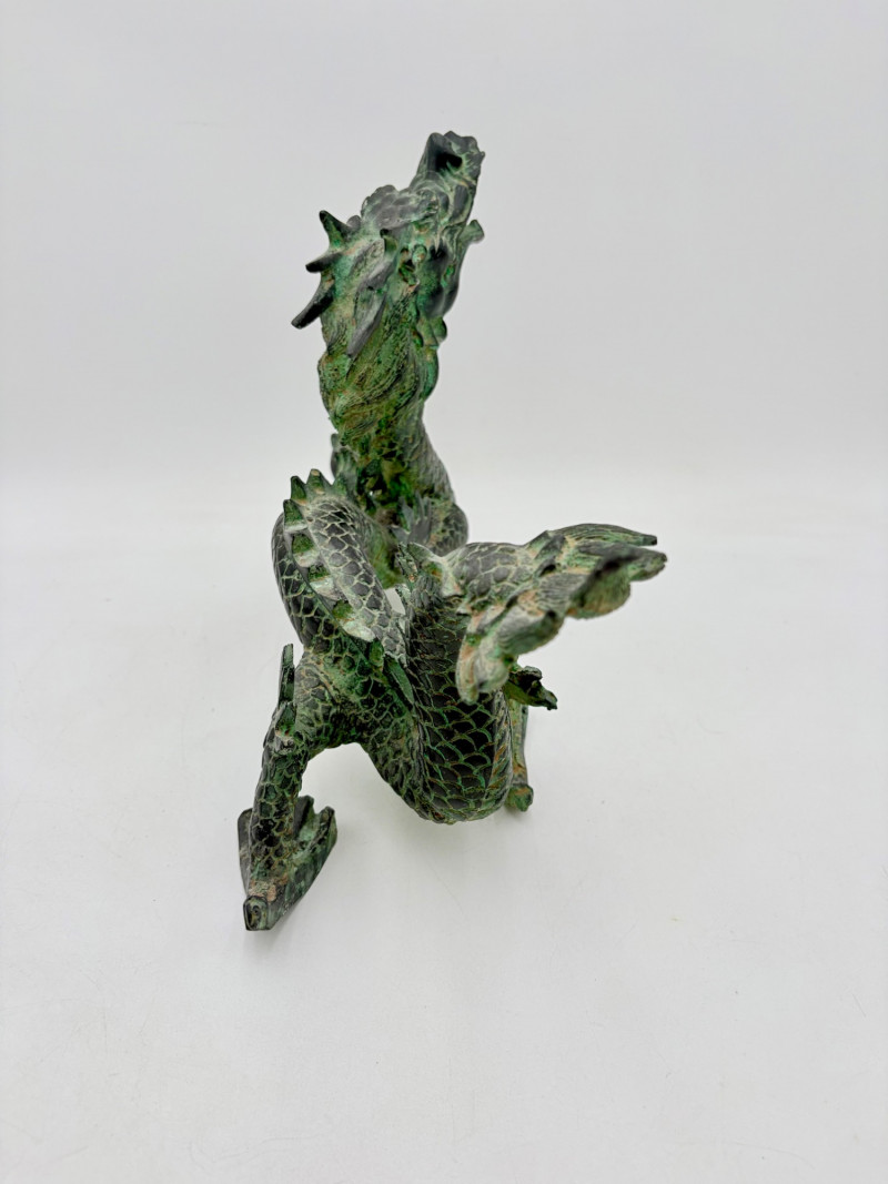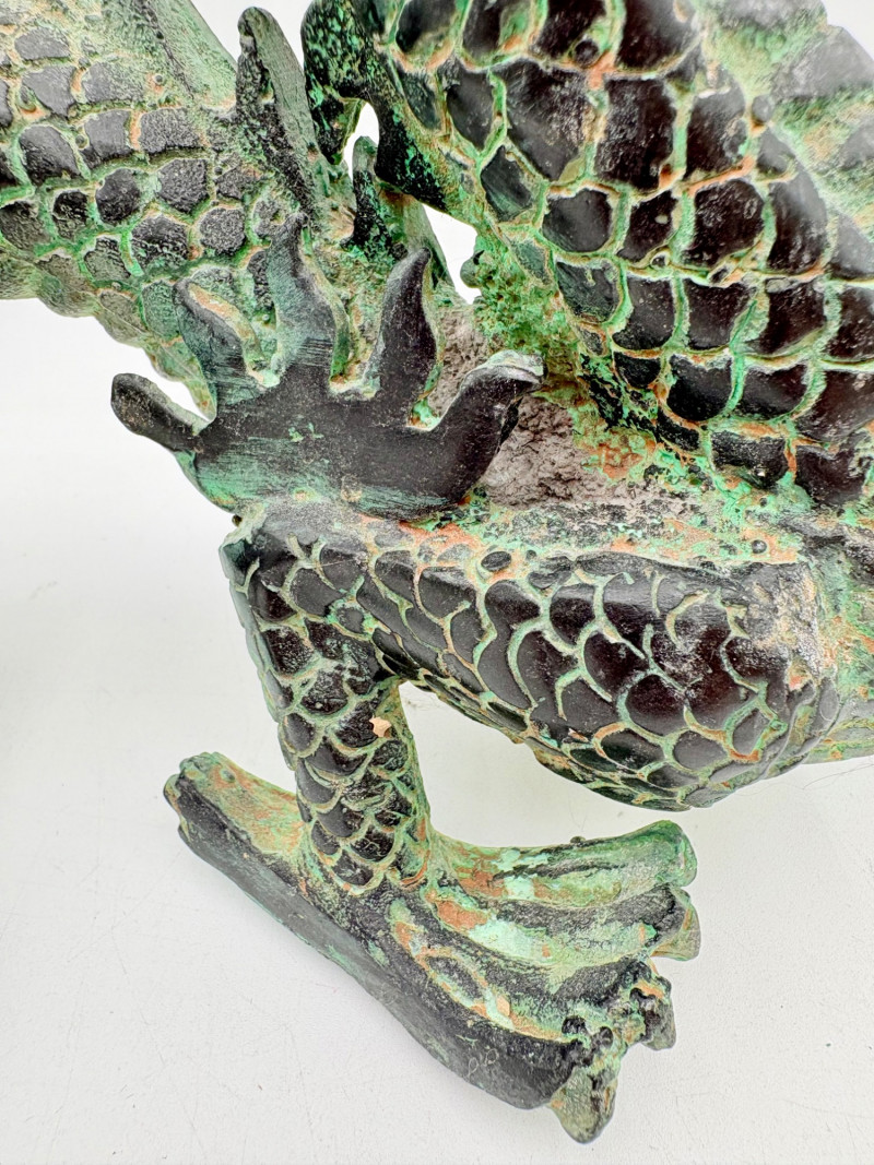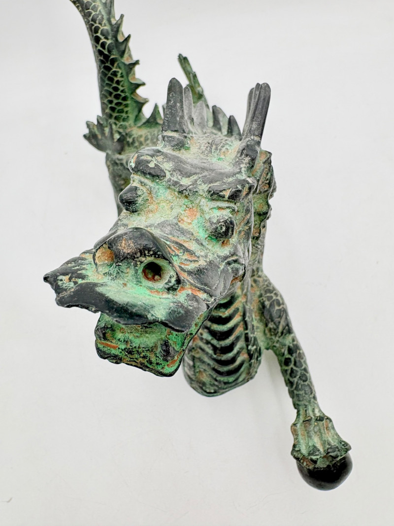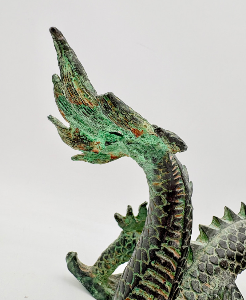 Lovely greenish patina on this dragon figure that appears to be cast metal on the exterior. Substantial