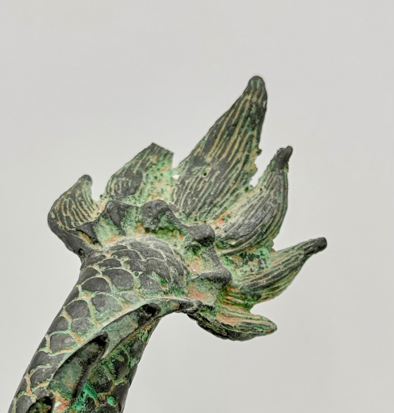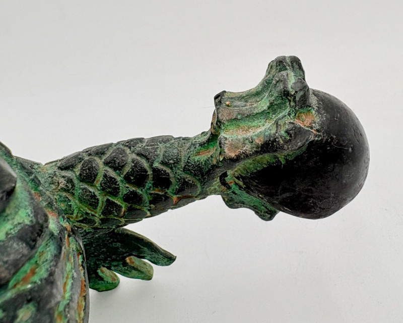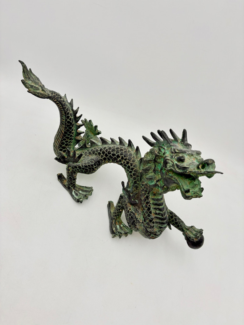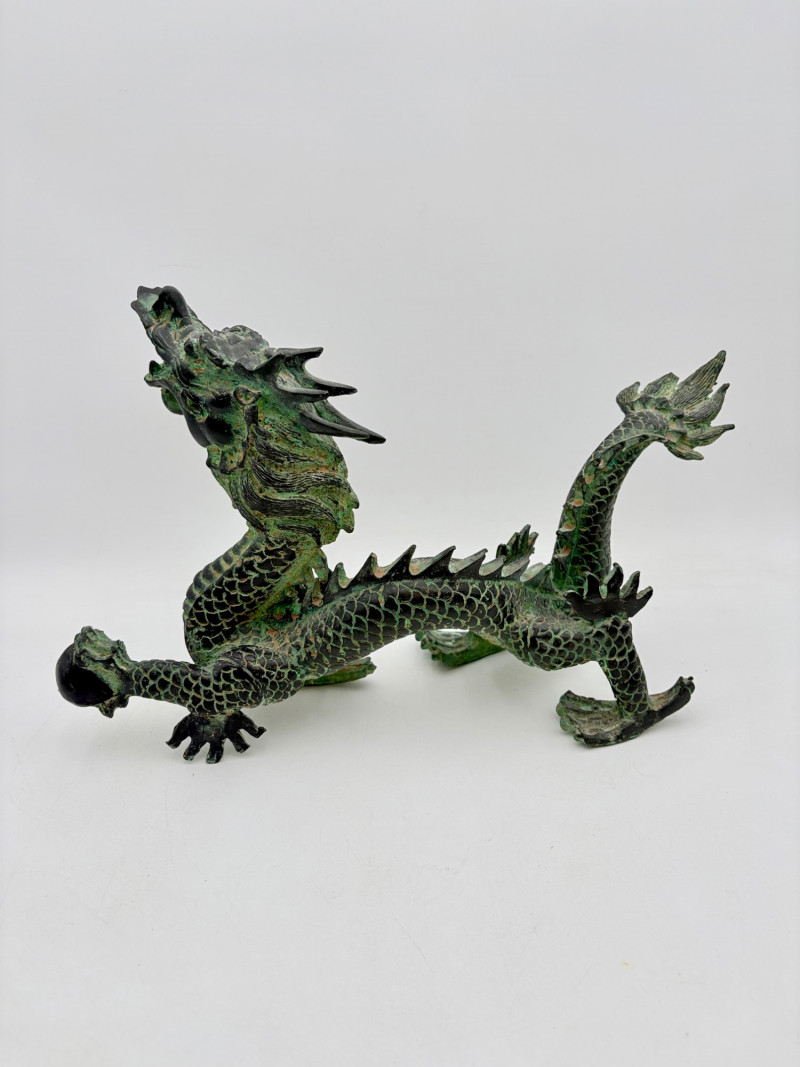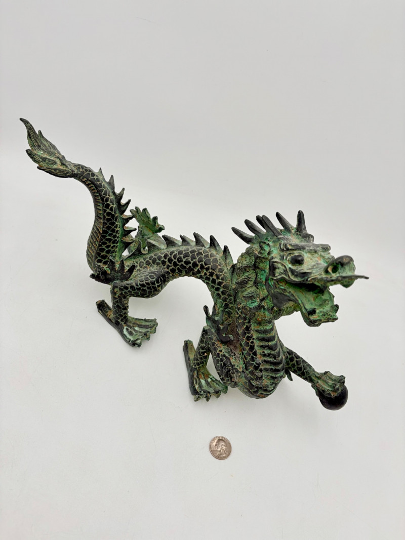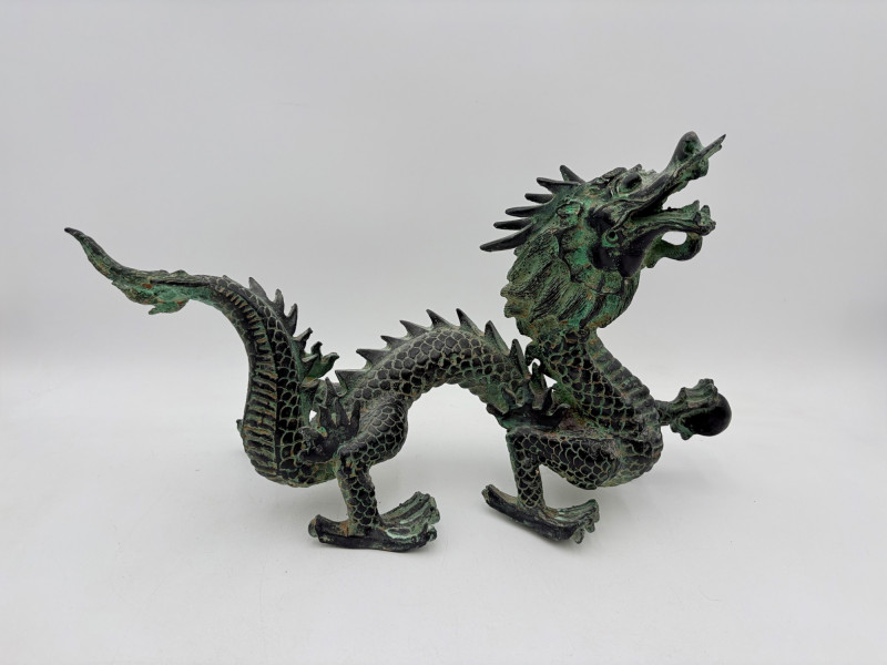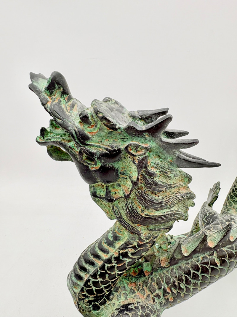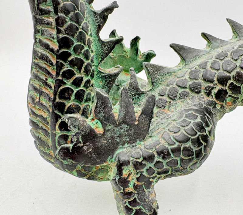 Lovely greenish patina on this dragon figure that appears to be cast metal on the exterior. Substantial