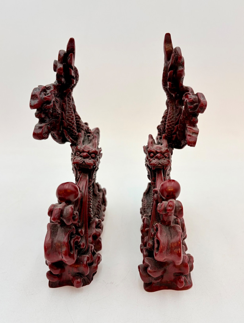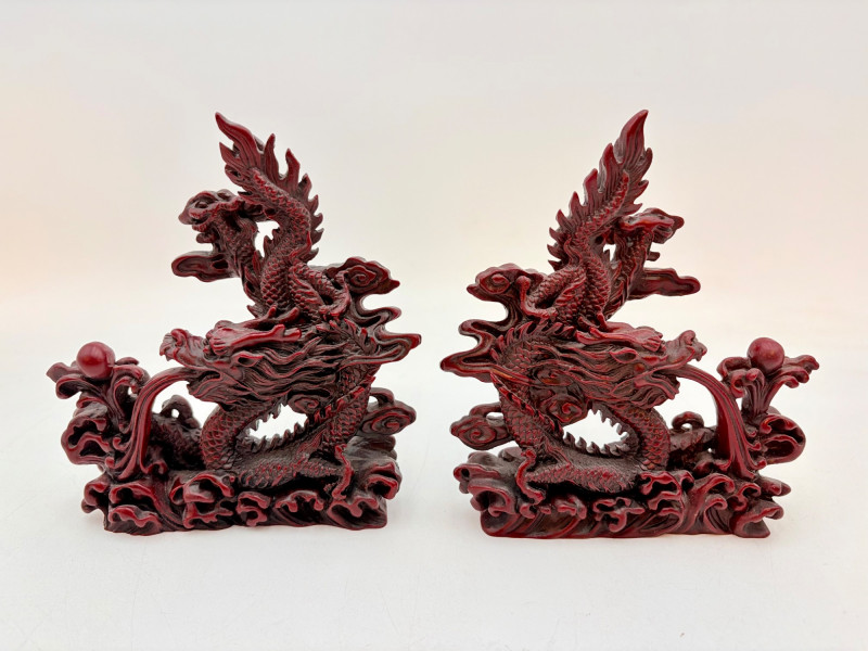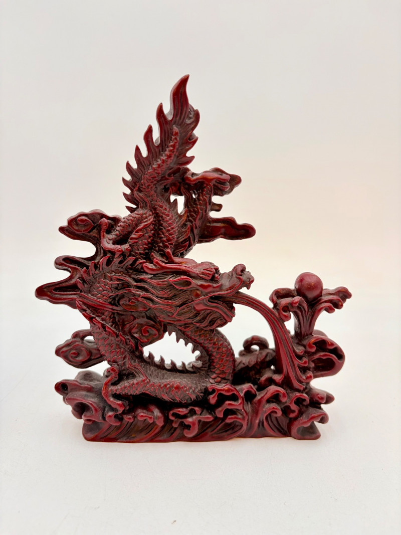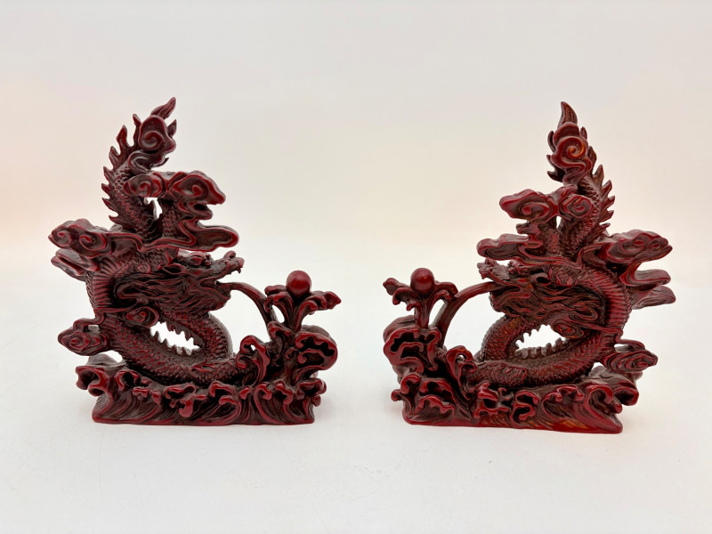 - 2 mirror-image dragons with intricate waves and orb on a waterspout. Measure 6.25” H x 6” L x 2” D.