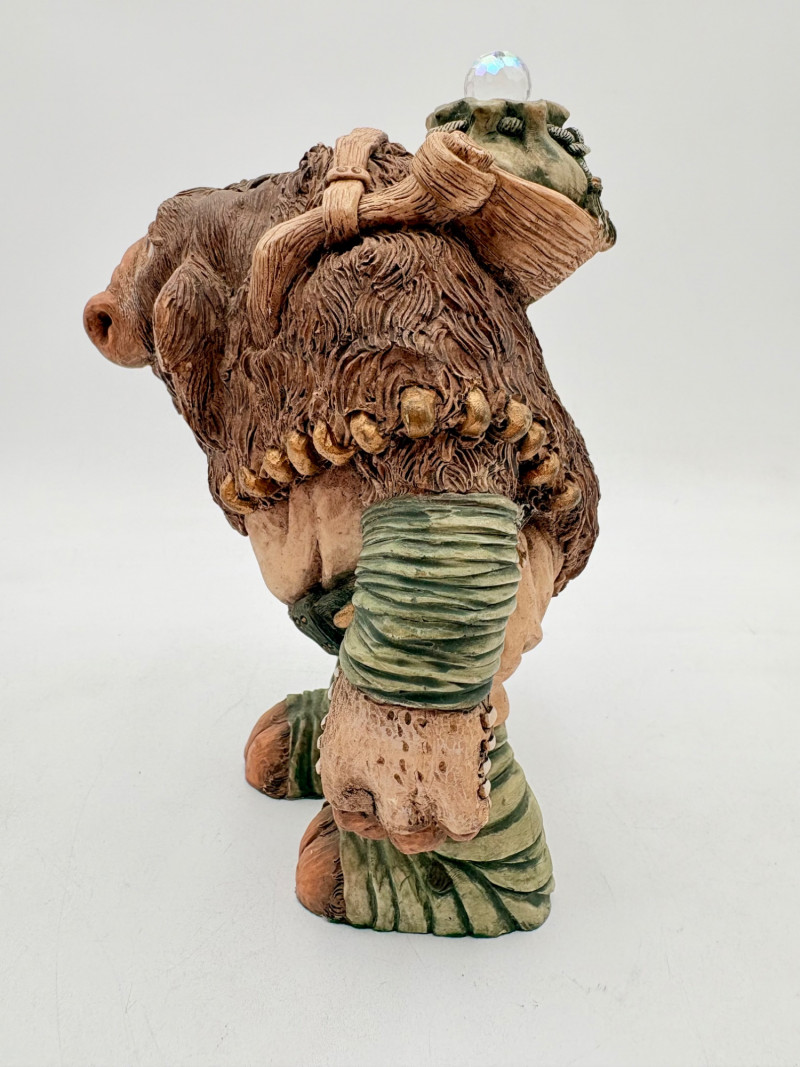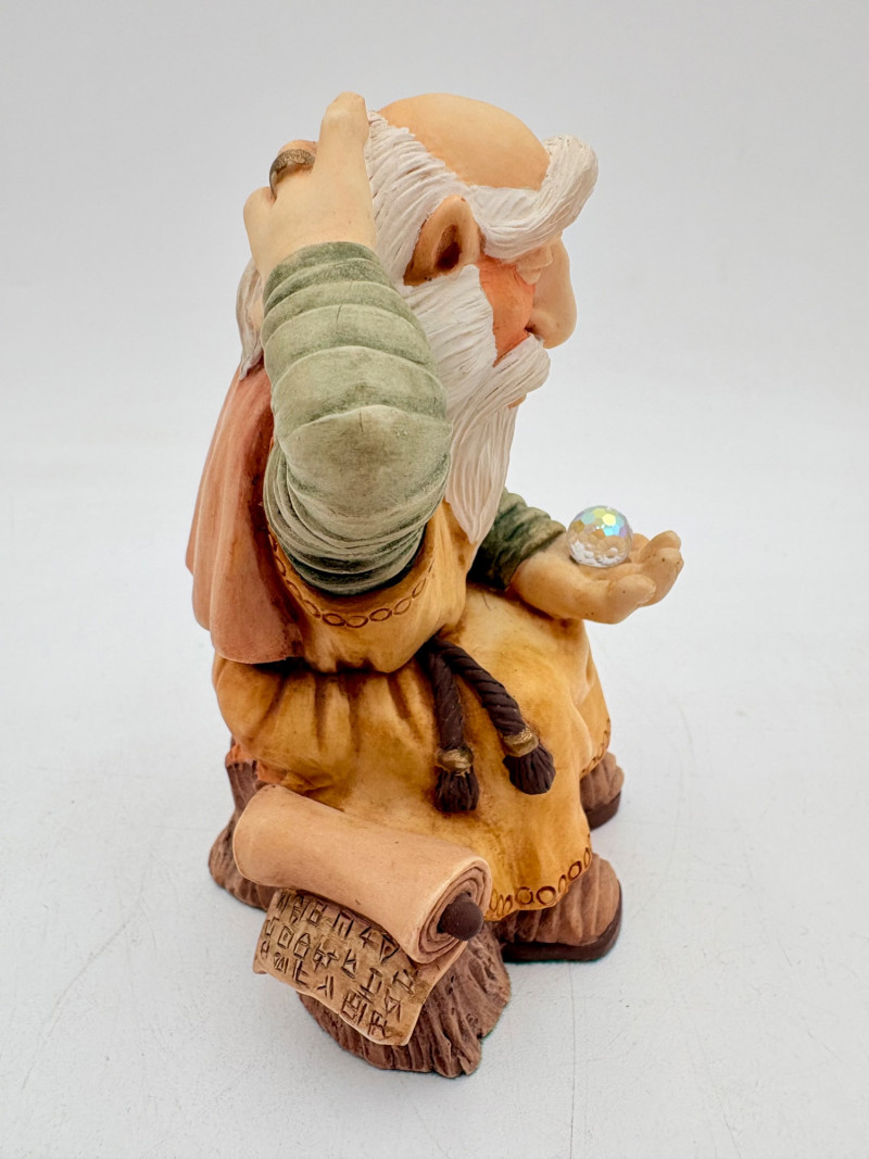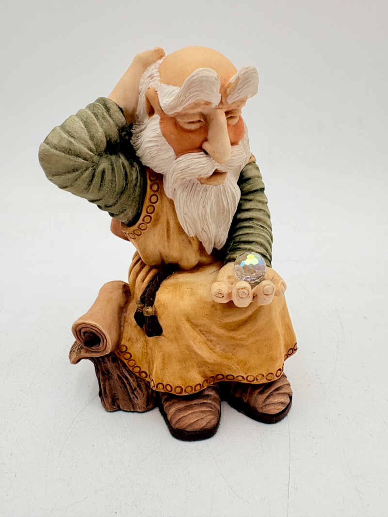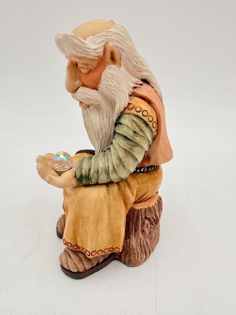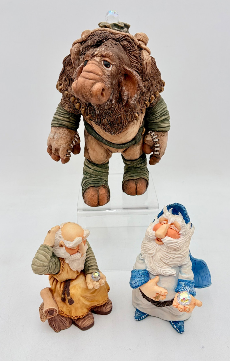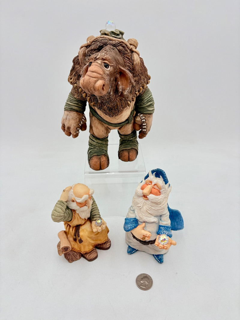 All of these characters are from the World of Krystonia and were produced in the 1980s by Panton of England. They are of cold-cast porcelain and hand-painted. - Moplos has stitched fingerless gloves and an orb atop his knapsack. Measures 8.5" H. - Kephren wizard figure scratches his head as he stares at the orb in his hand. Measures just under 5" H. - Shepf wizard figure has his hand on his belly and holds his orb out. Measures 5" H. Please note that there are several lots with Krystonia figures/themes: Lots #15, 24, 62, 94, & 113.