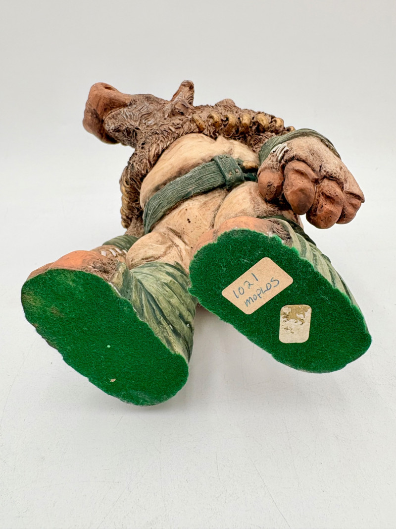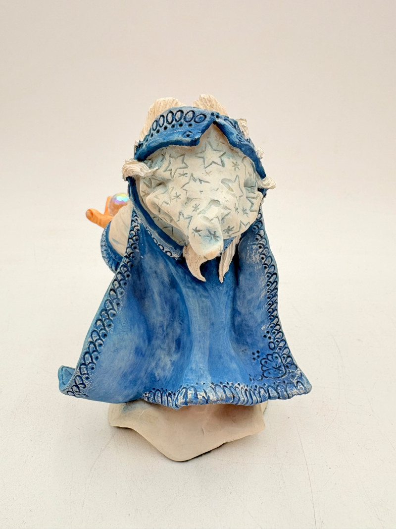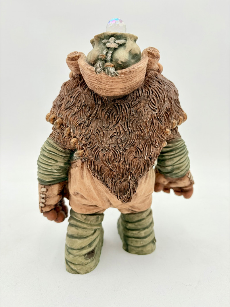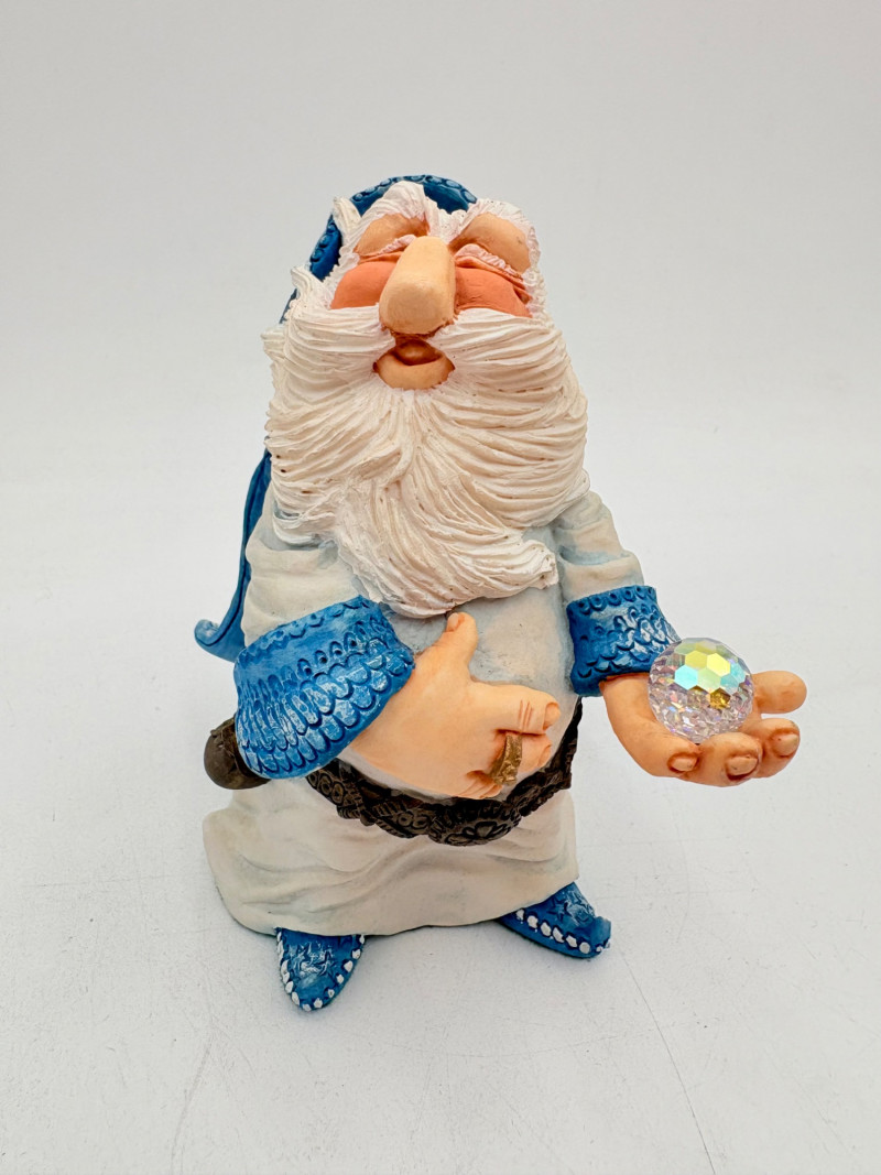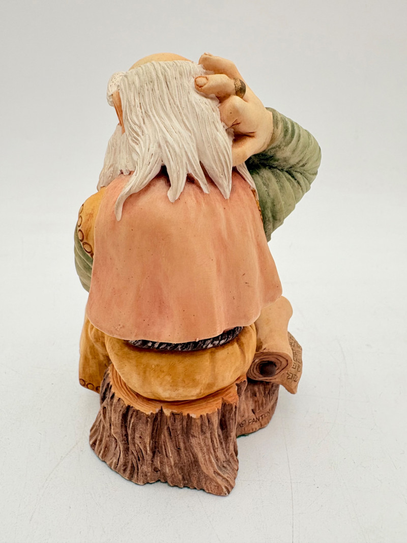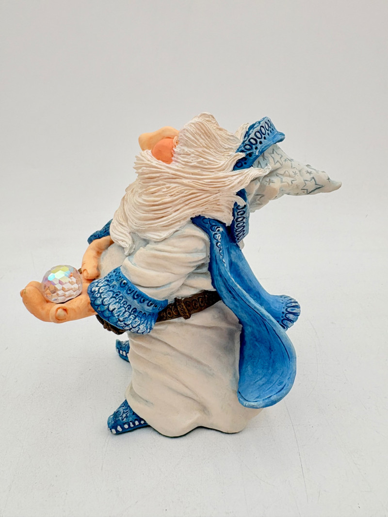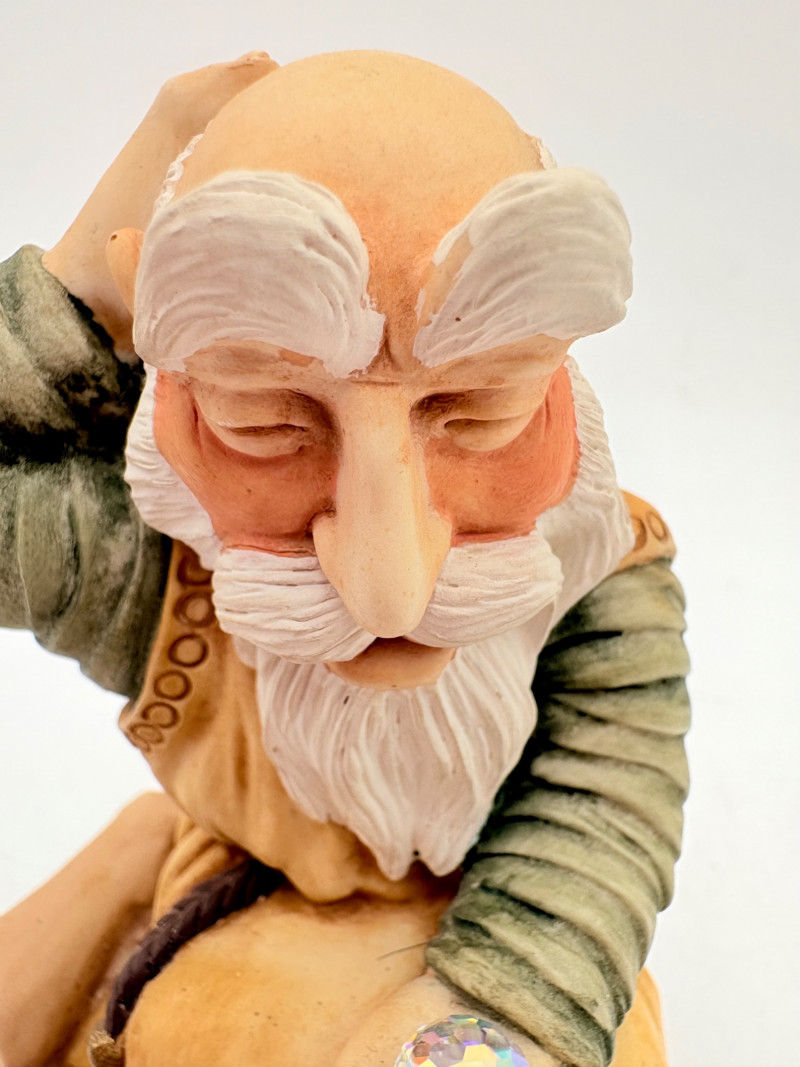 All of these characters are from the World of Krystonia and were produced in the 1980s by Panton of England. They are of cold-cast porcelain and hand-painted. - Moplos has stitched fingerless gloves and an orb atop his knapsack. Measures 8.5" H. - Kephren wizard figure scratches his head as he stares at the orb in his hand. Measures just under 5" H. - Shepf wizard figure has his hand on his belly and holds his orb out. Measures 5" H. Please note that there are several lots with Krystonia figures/themes: Lots #15, 24, 62, 94, & 113.