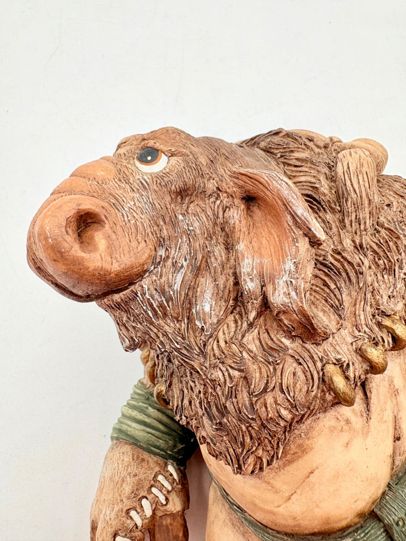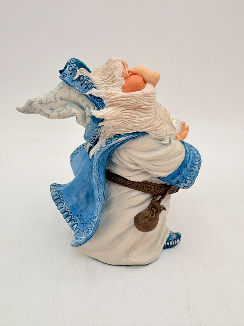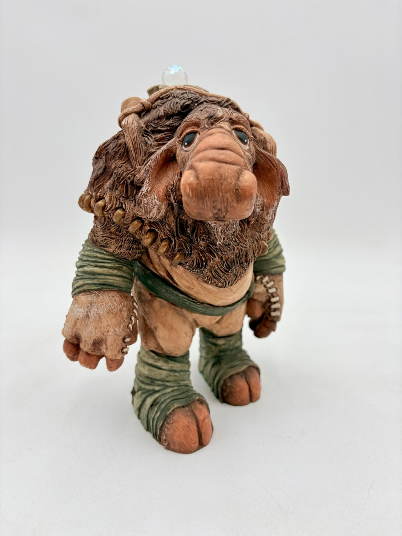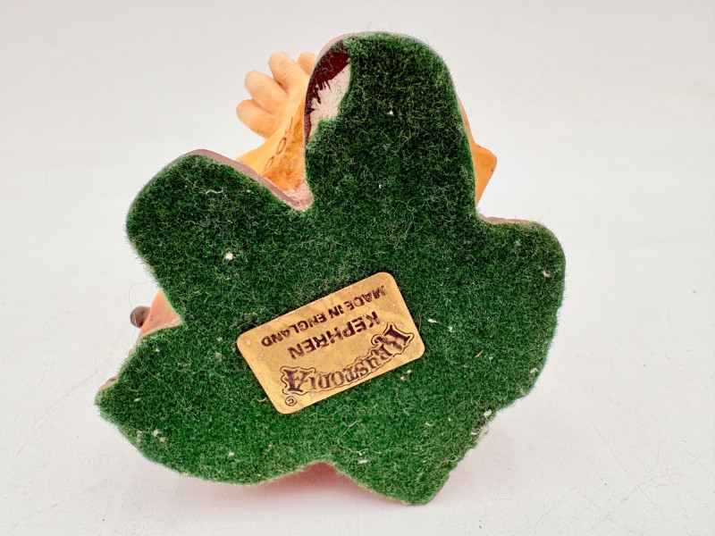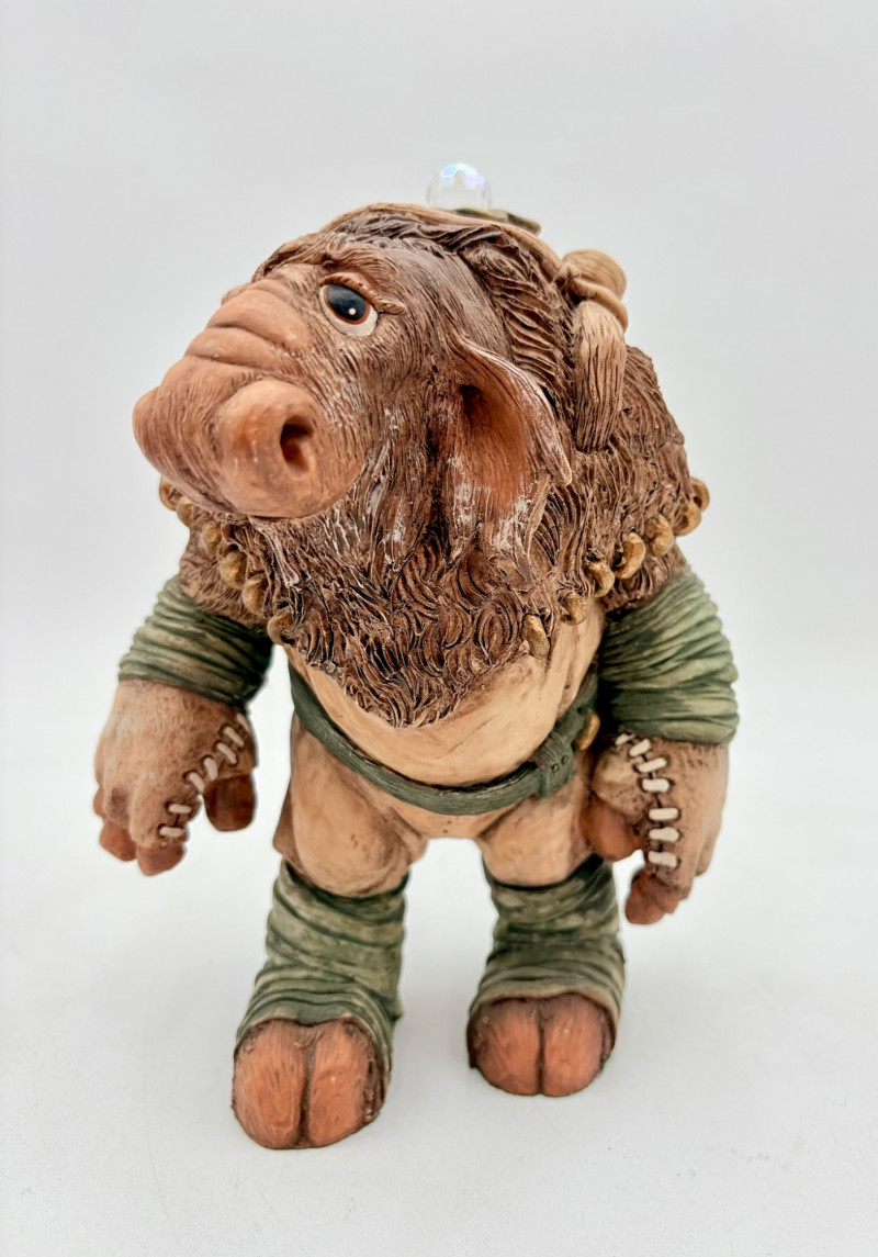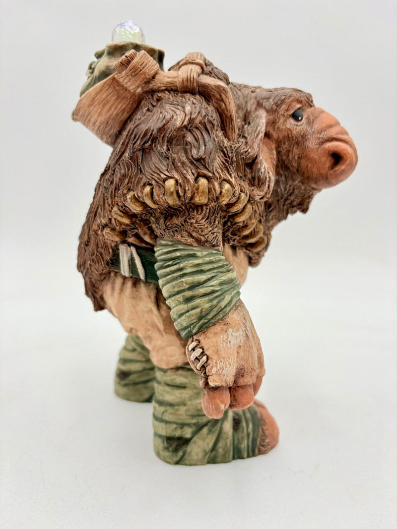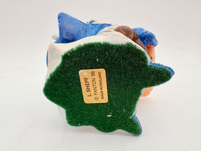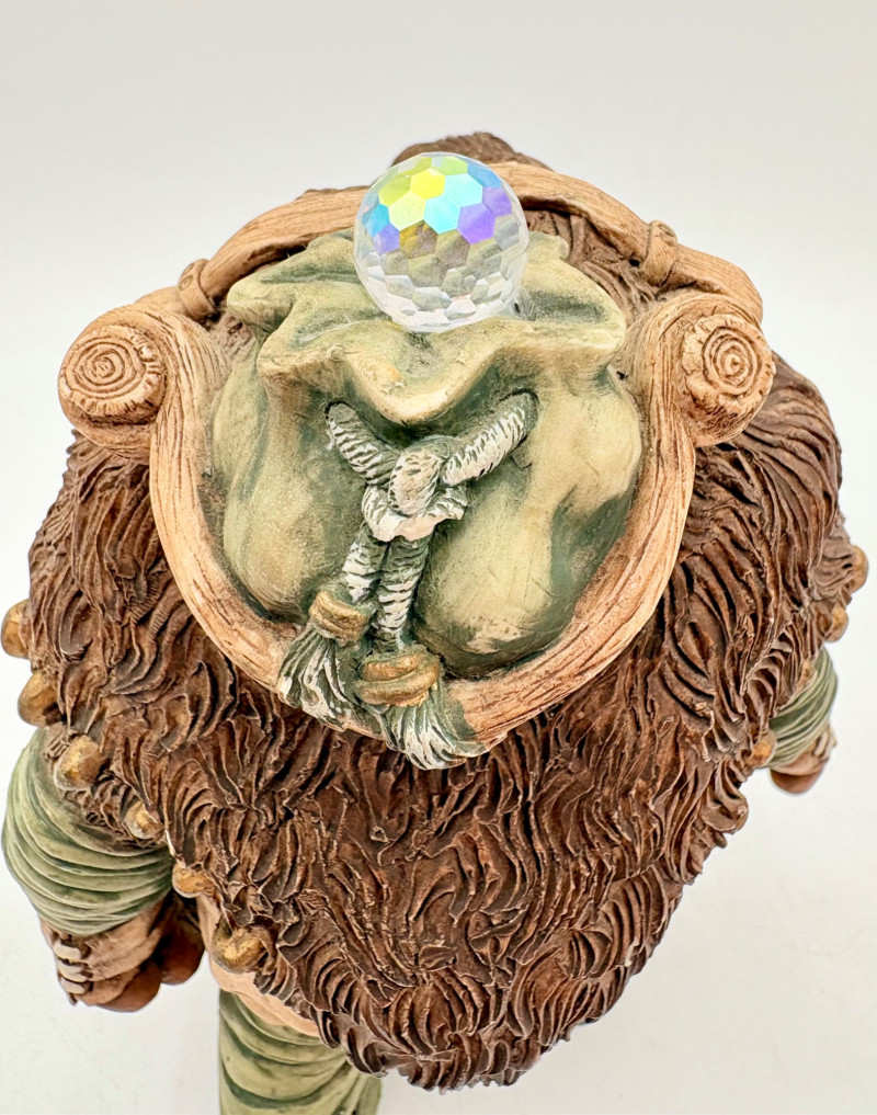All of these characters are from the World of Krystonia and were produced in the 1980s by Panton of England. They are of cold-cast porcelain and hand-painted. - Moplos has stitched fingerless gloves and an orb atop his knapsack. Measures 8.5" H. - Kephren wizard figure scratches his head as he stares at the orb in his hand. Measures just under 5" H. - Shepf wizard figure has his hand on his belly and holds his orb out. Measures 5" H. Please note that there are several lots with Krystonia figures/themes: Lots #15, 24, 62, 94, & 113.