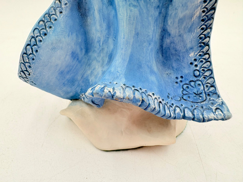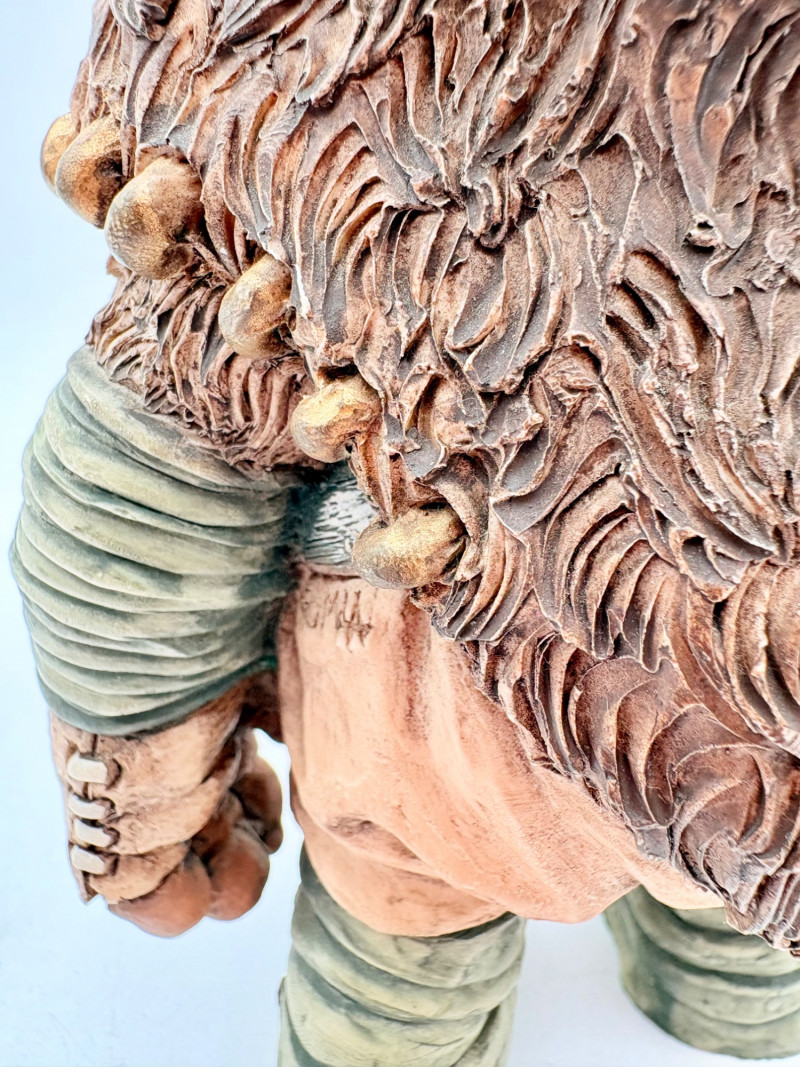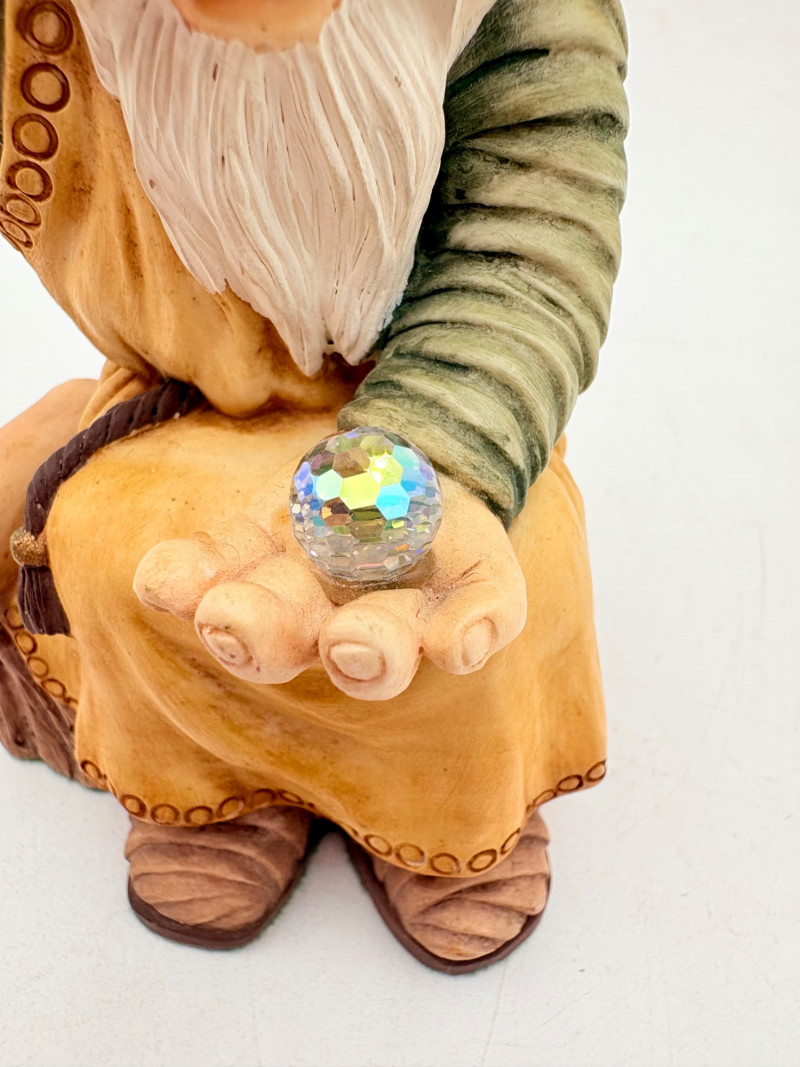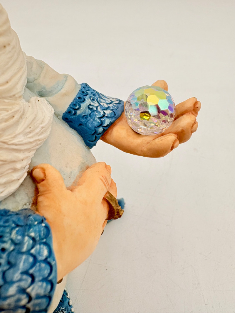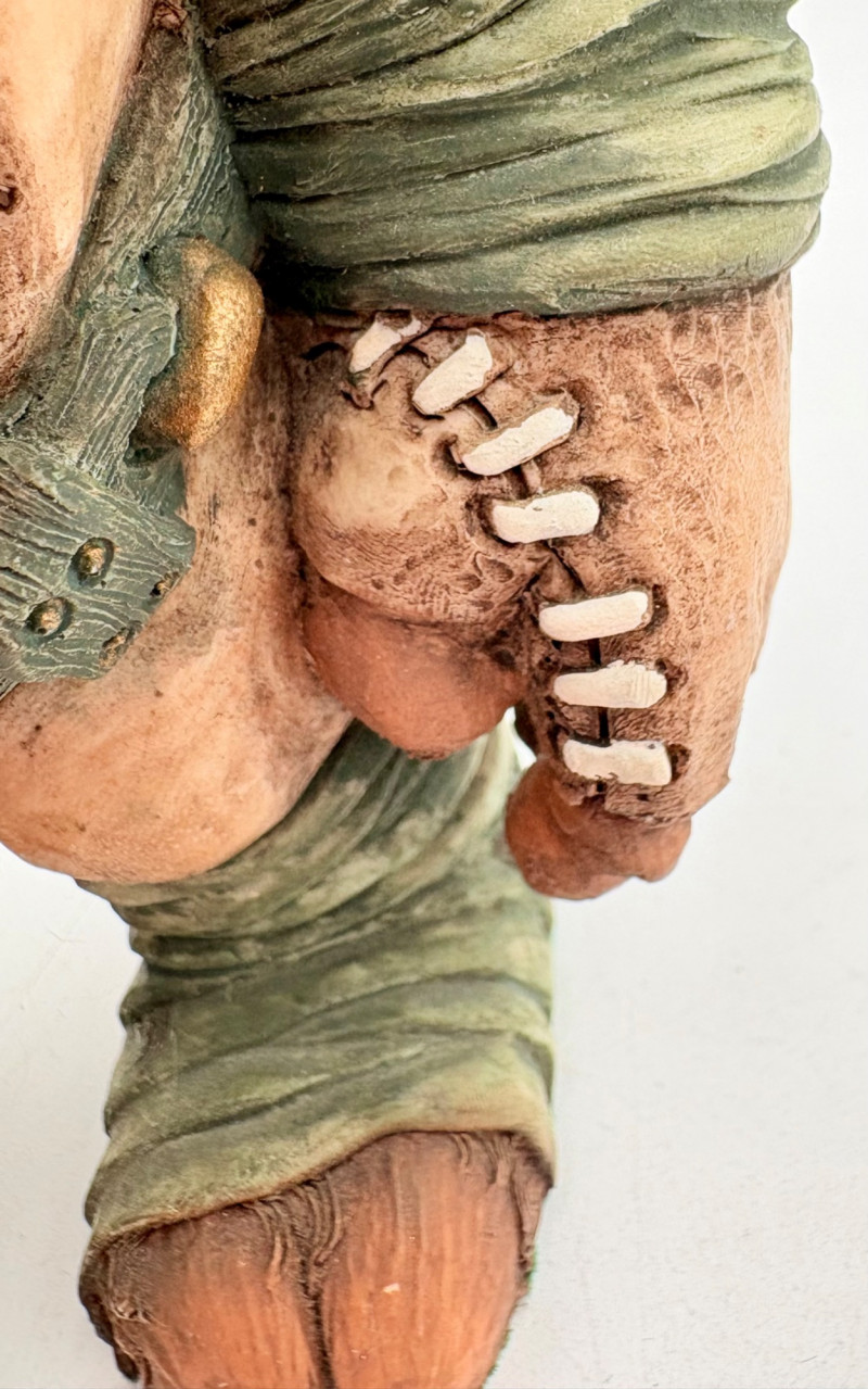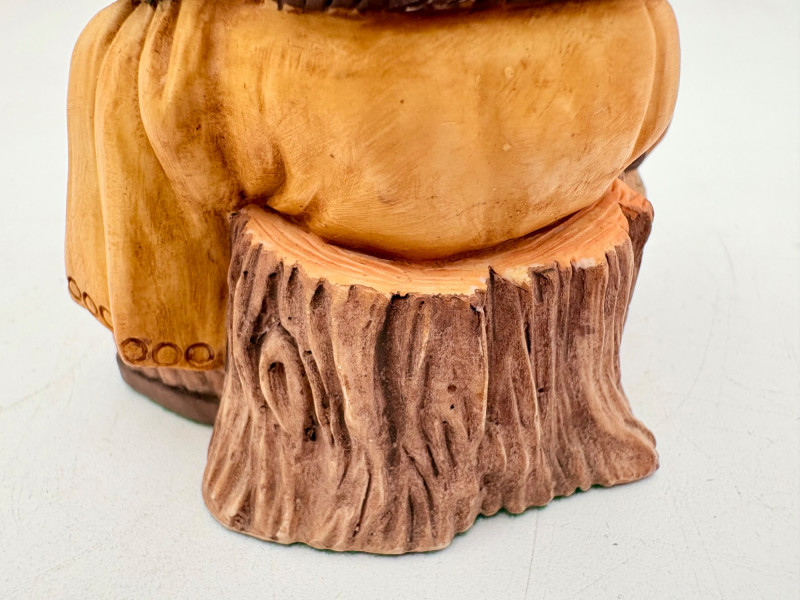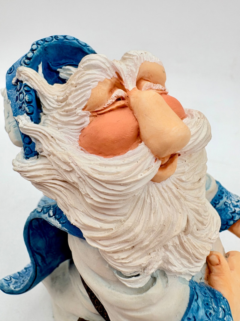 All of these characters are from the World of Krystonia and were produced in the 1980s by Panton of England. They are of cold-cast porcelain and hand-painted. - Moplos has stitched fingerless gloves and an orb atop his knapsack. Measures 8.5" H. - Kephren wizard figure scratches his head as he stares at the orb in his hand. Measures just under 5" H. - Shepf wizard figure has his hand on his belly and holds his orb out. Measures 5" H. Please note that there are several lots with Krystonia figures/themes: Lots #15, 24, 62, 94, & 113.