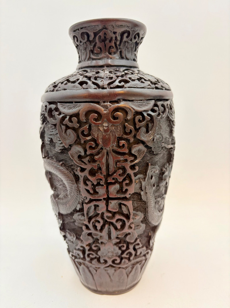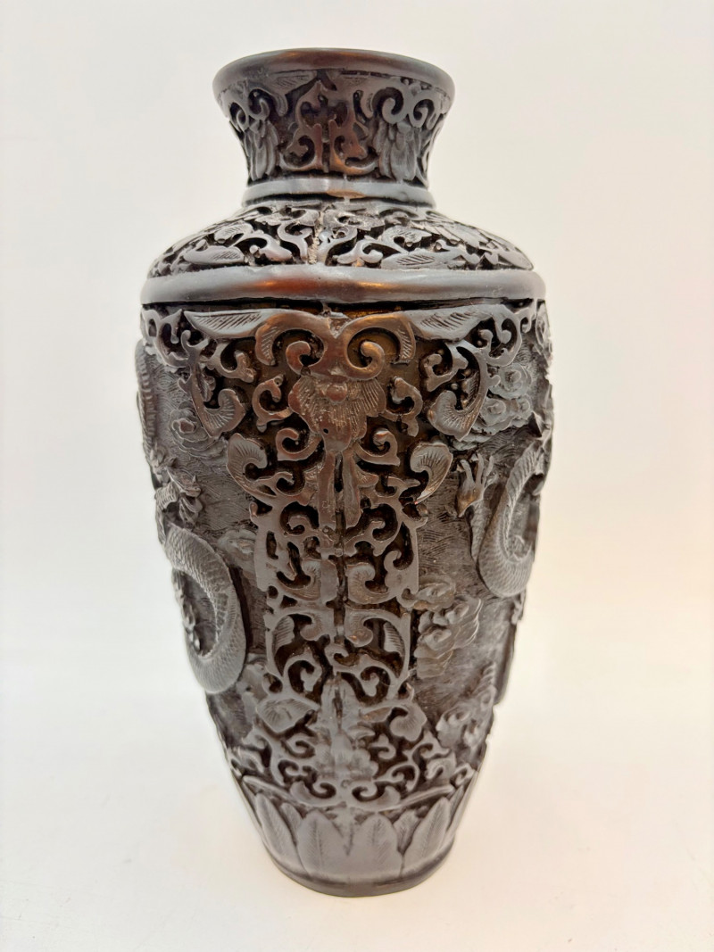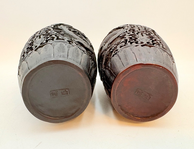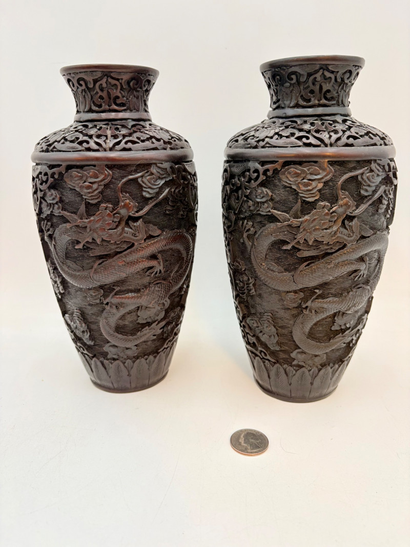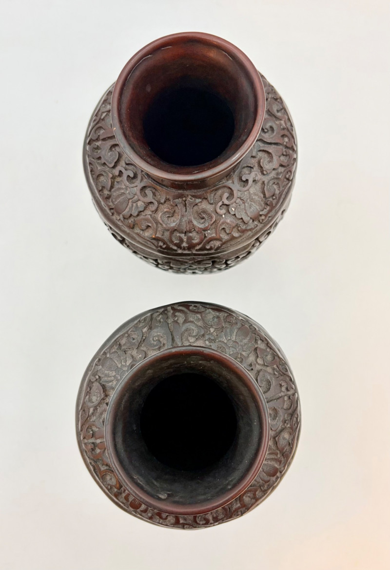These 2 vases are identical with only slight variation. We think the finish is supposed to be dark wood or cinnabar – we leave that determination to their