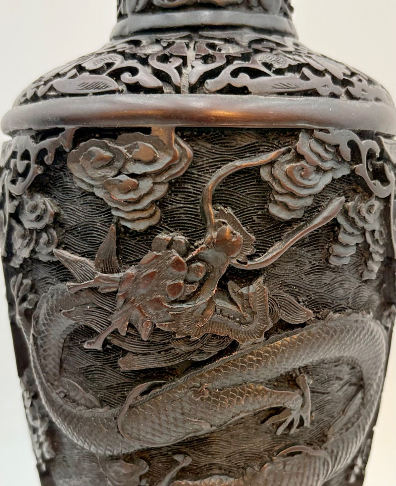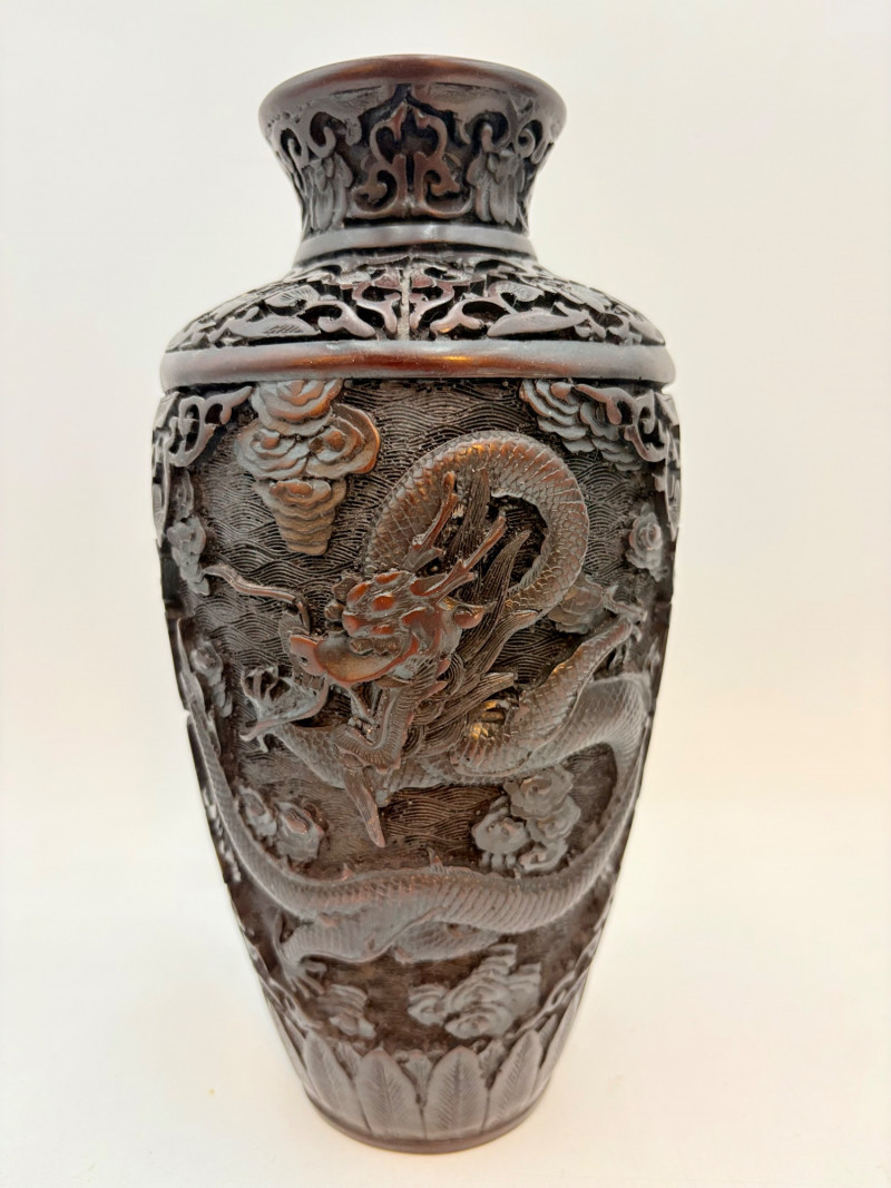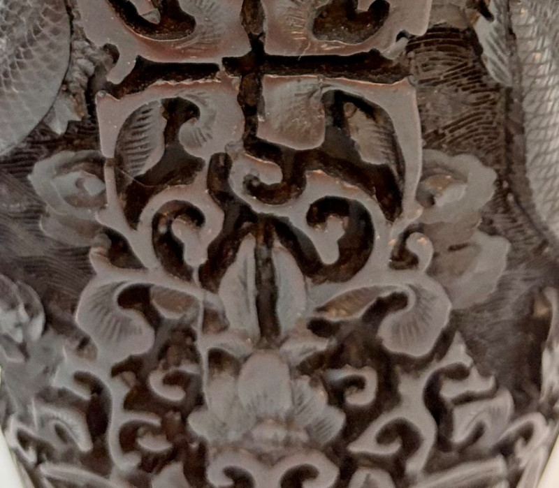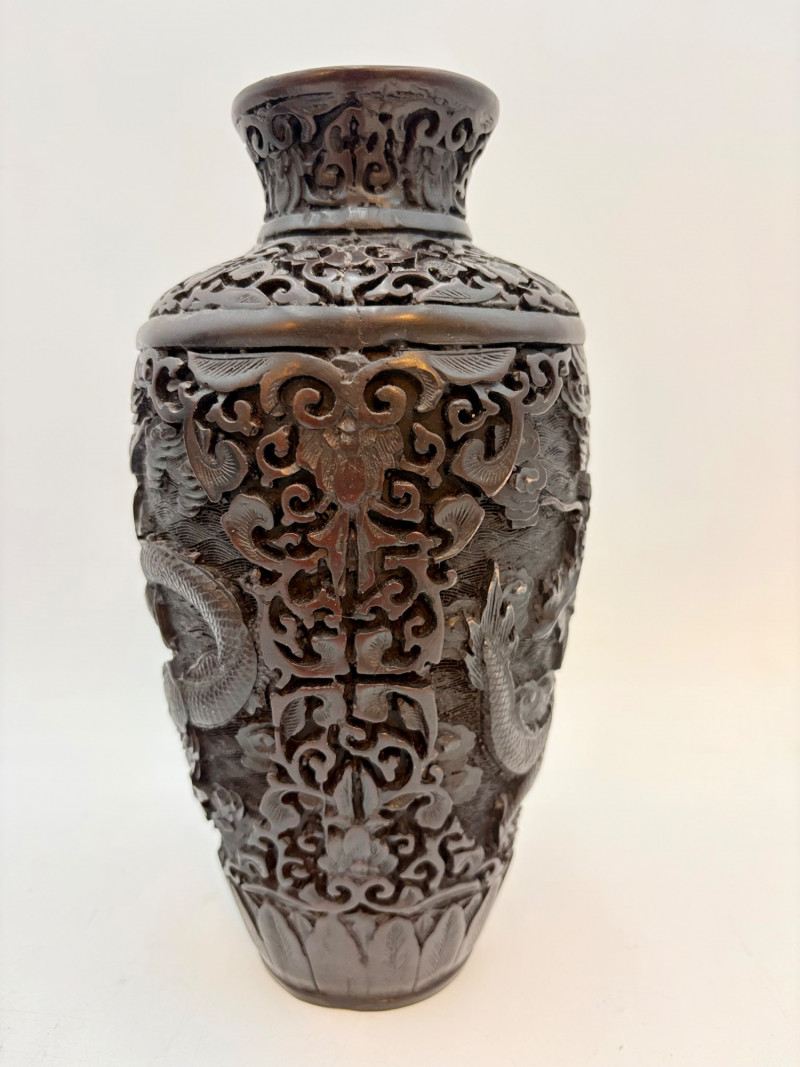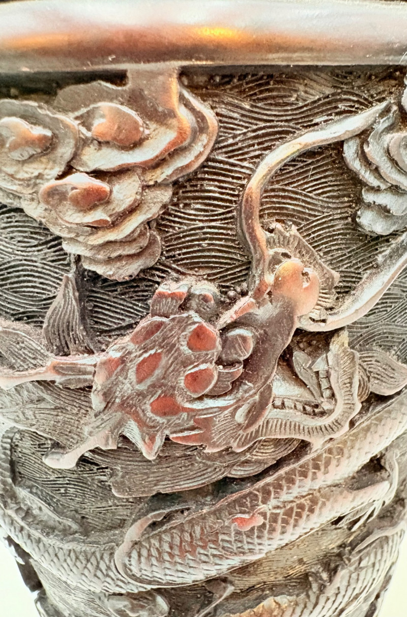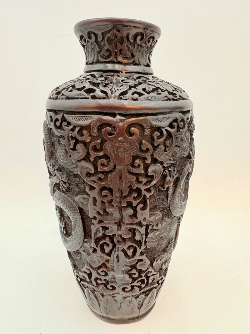 These 2 vases are identical with only slight variation. We think the finish is supposed to be dark wood or cinnabar – we leave that determination to their