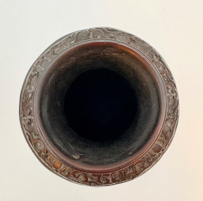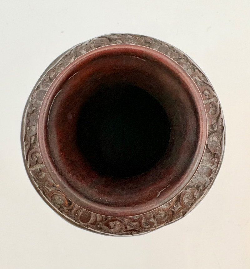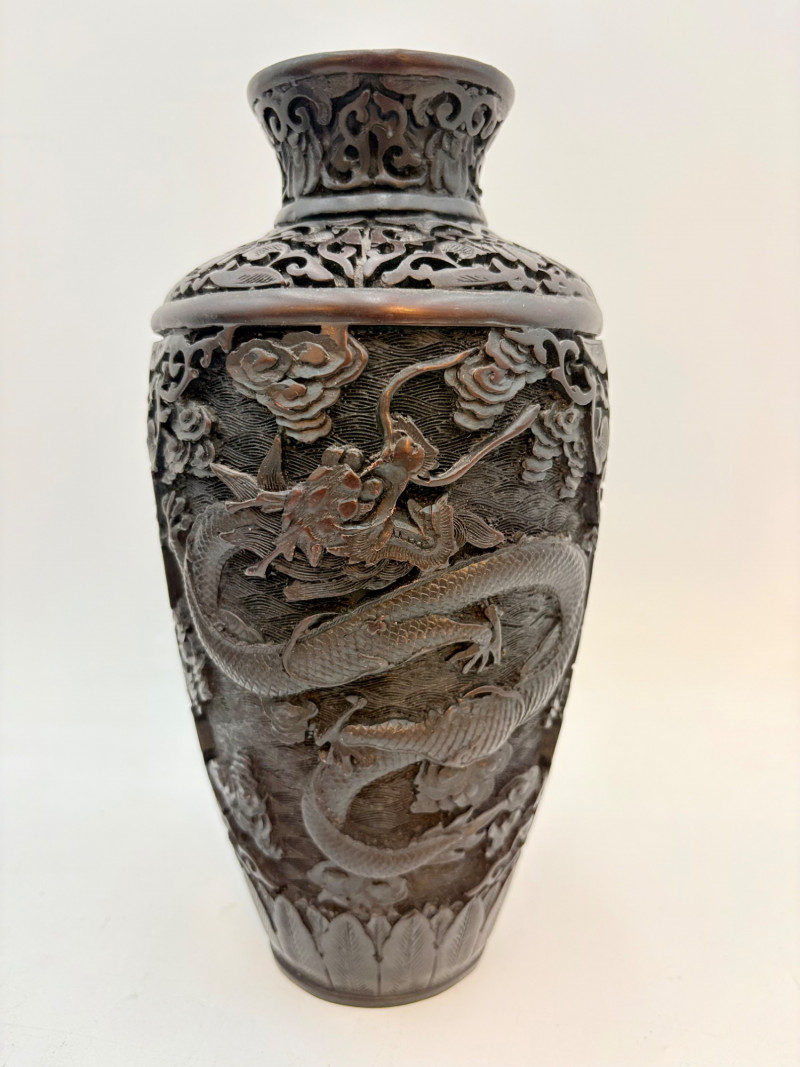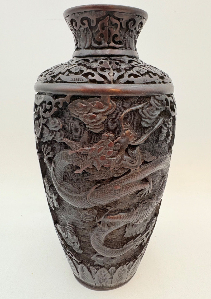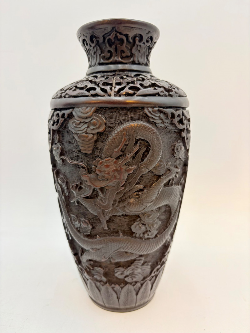 These 2 vases are identical with only slight variation. We think the finish is supposed to be dark wood or cinnabar – we leave that determination to their
