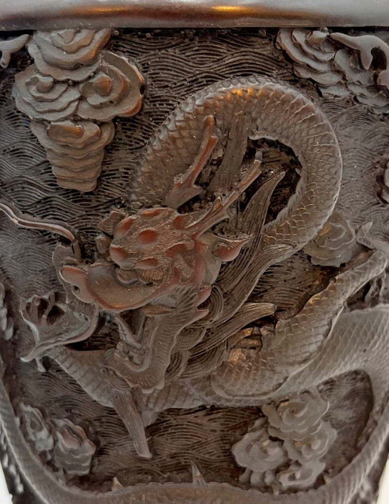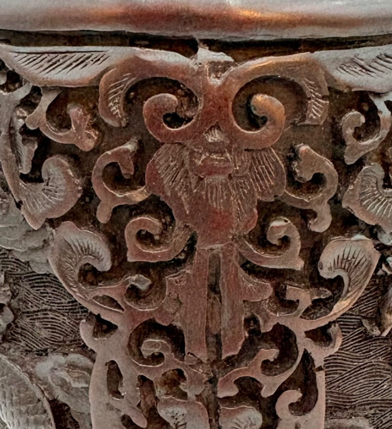 inward to the swirling dragon figure surrounded by filigree. Measure 9” H.