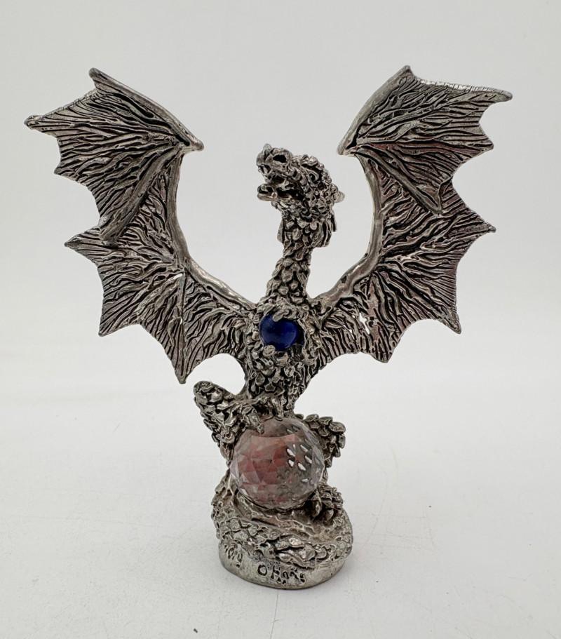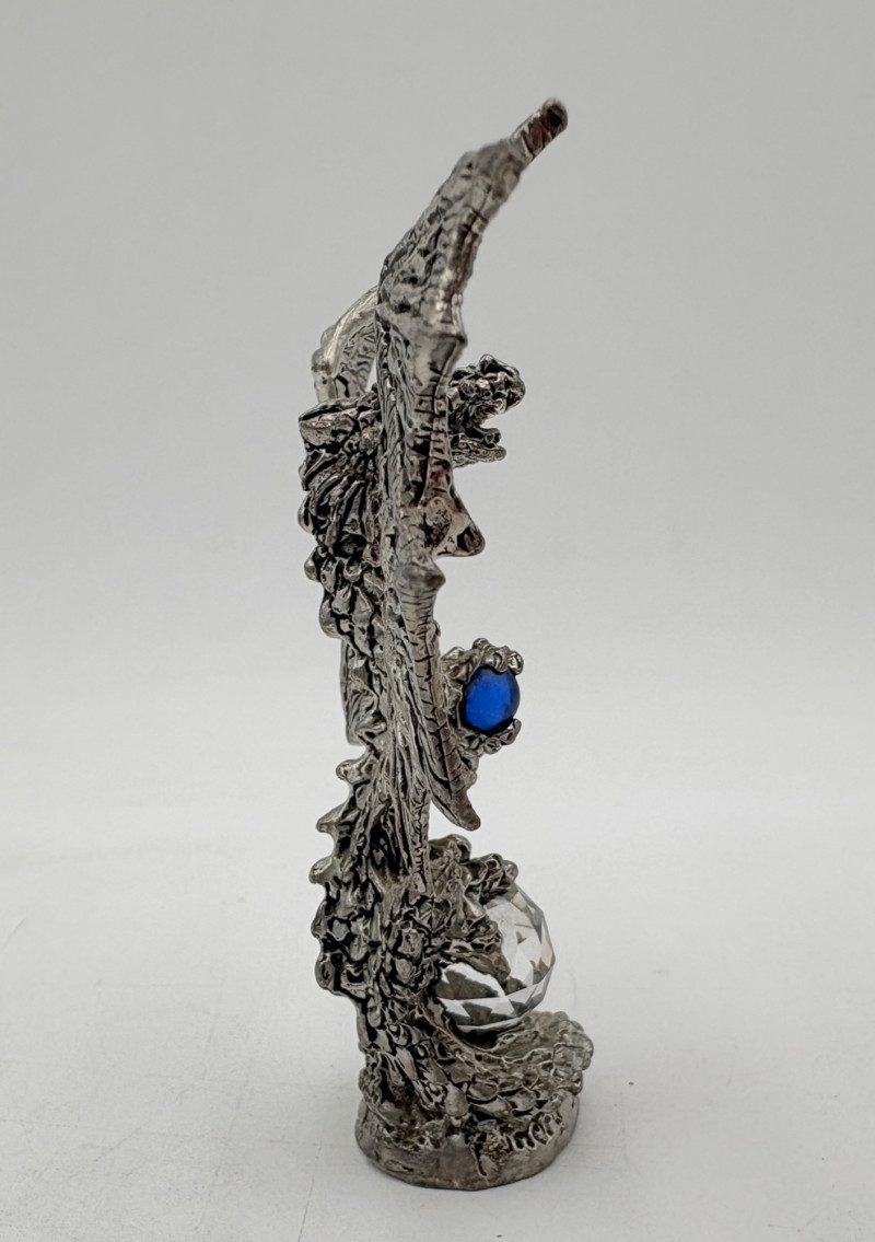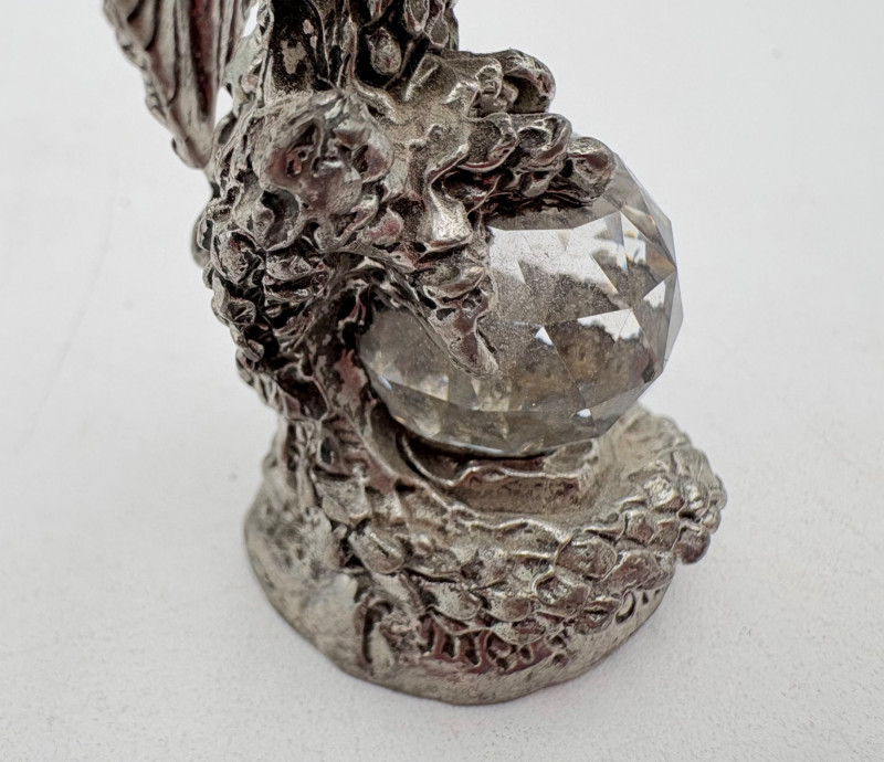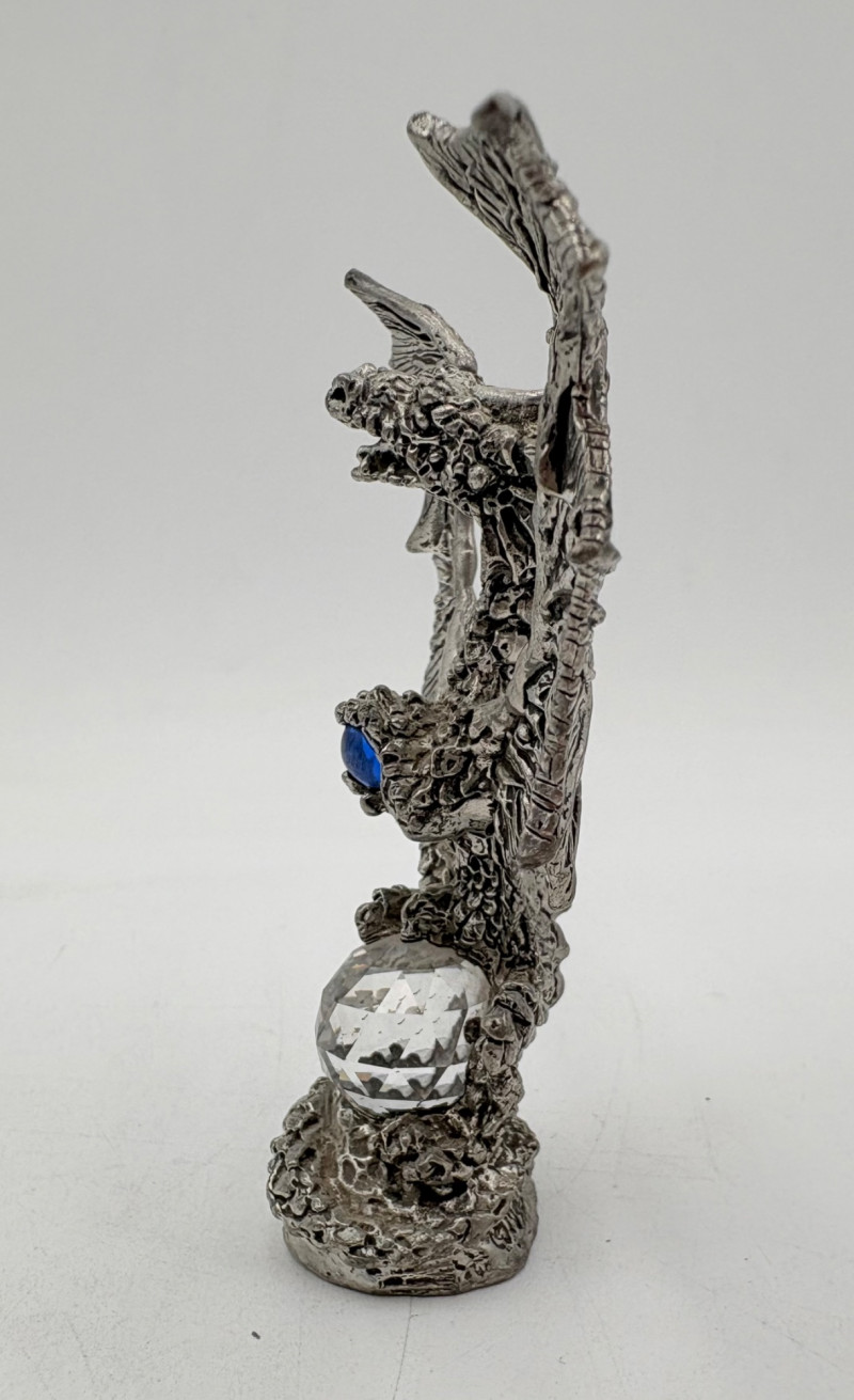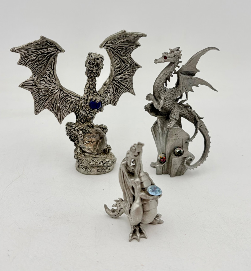 Pewter dragon trio: - Heavily incised dragon on clear orb grasping a