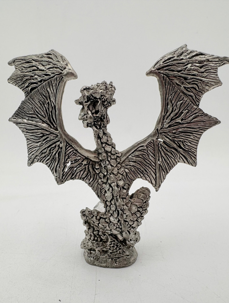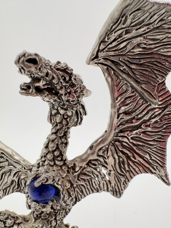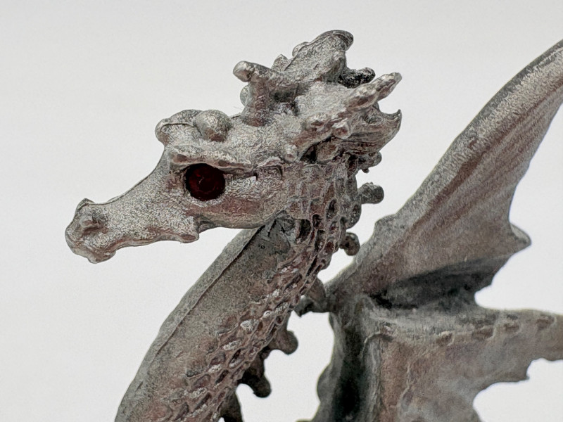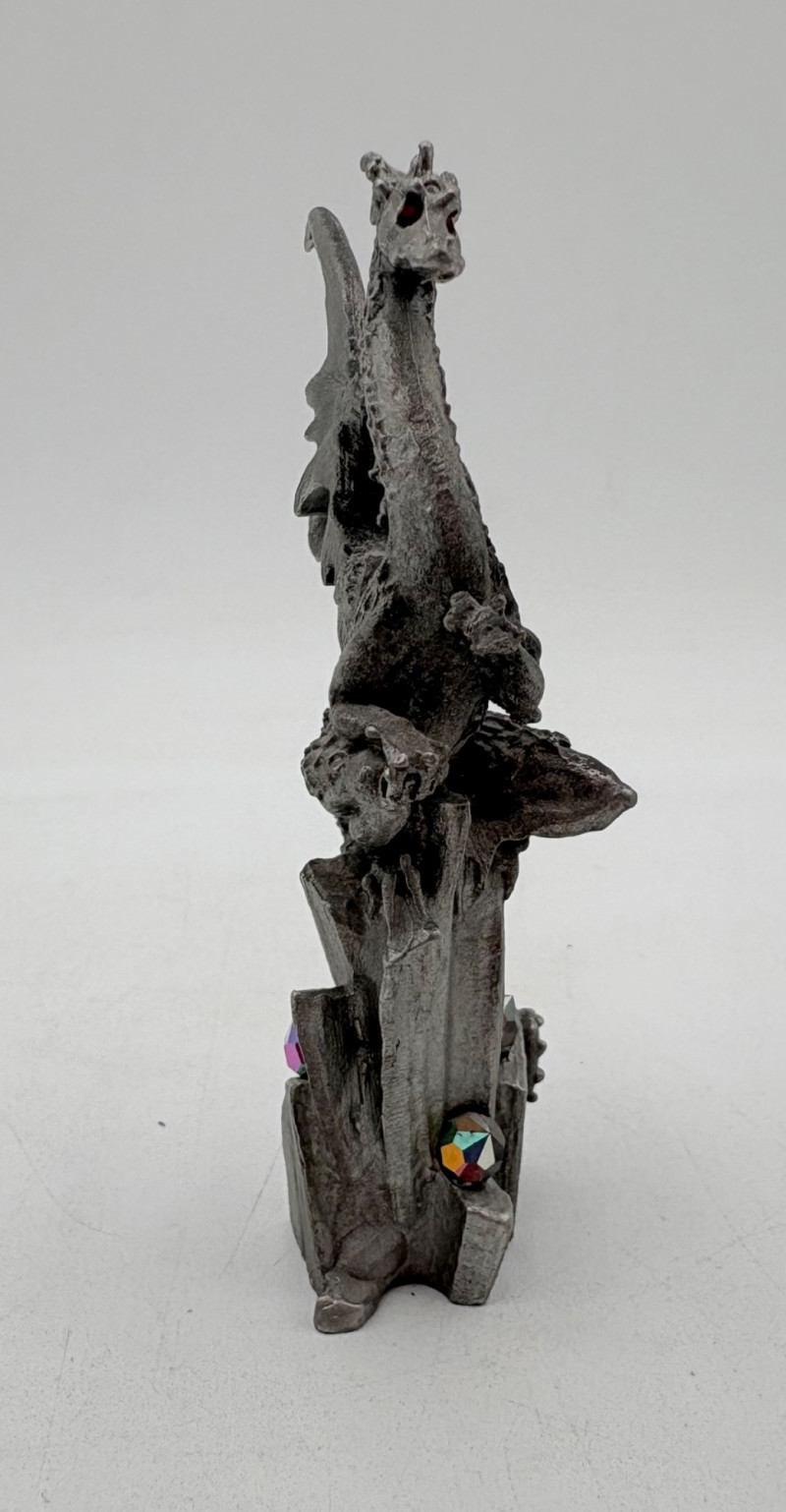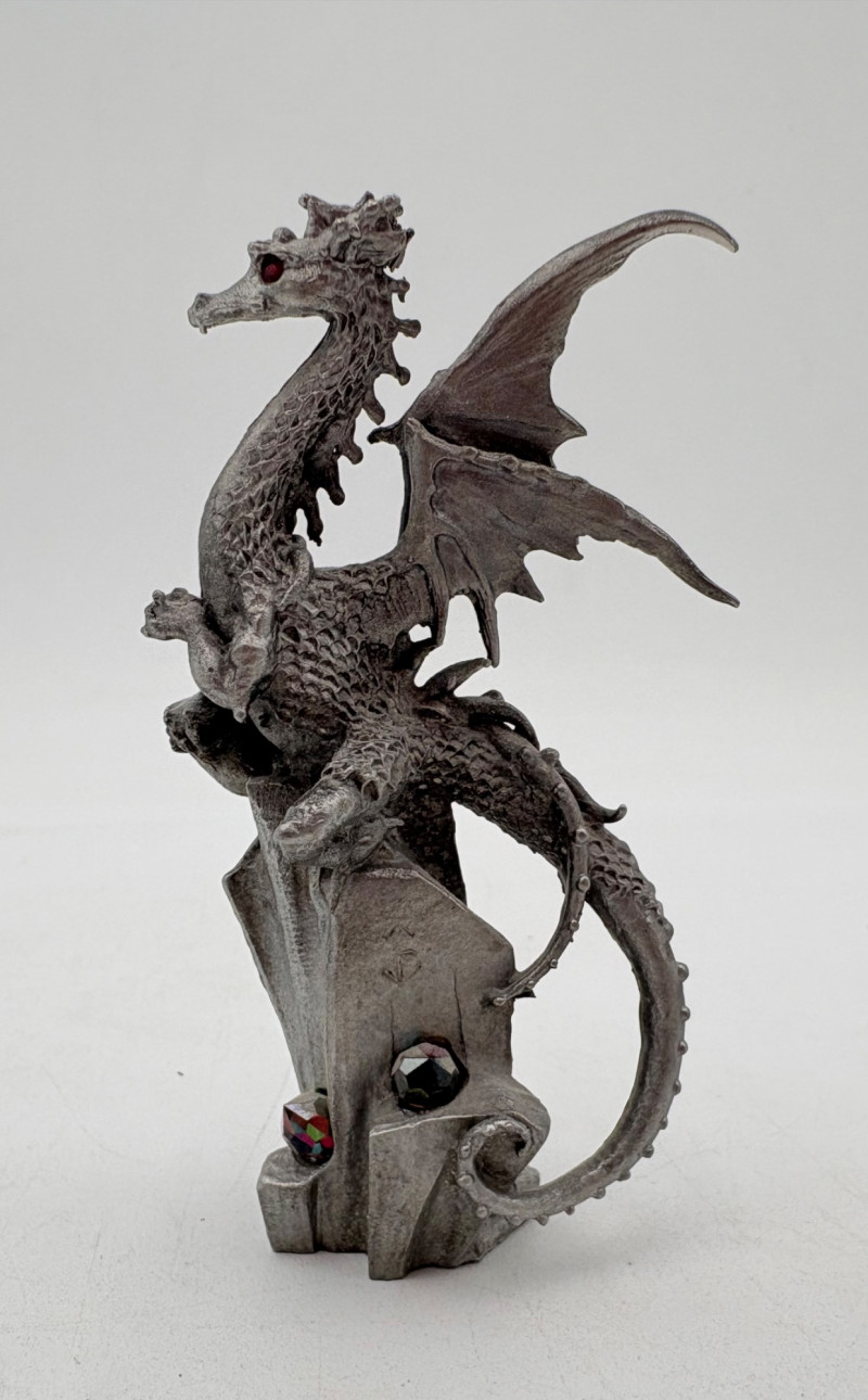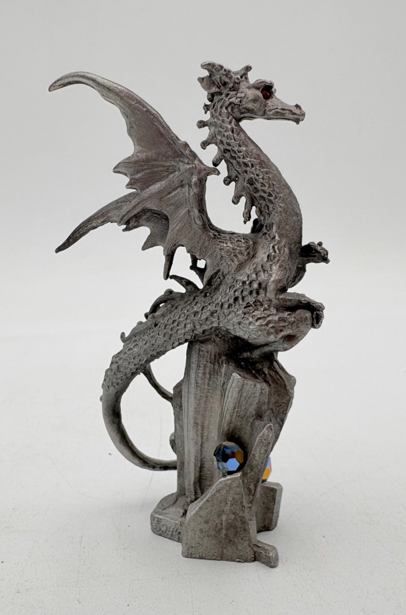 Pewter dragon trio: - Heavily incised dragon on clear orb grasping a