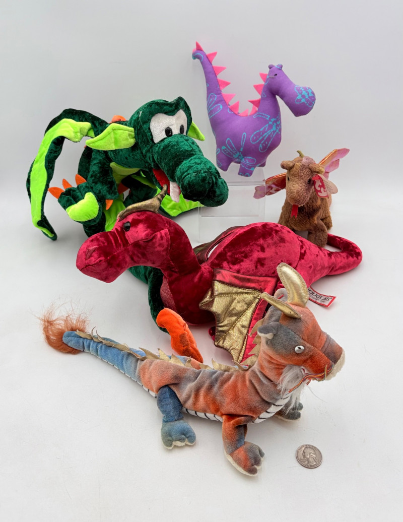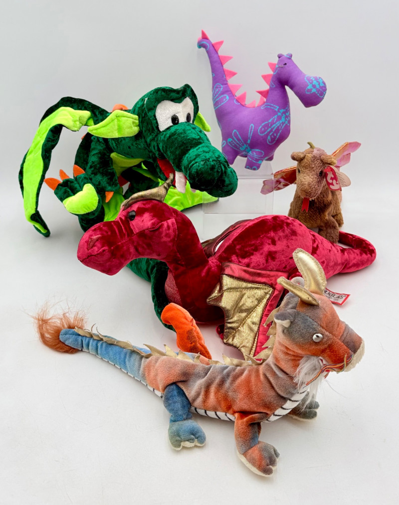 5 plushie dragons of different styles and sizes. What you see is what you get! Note - the green dragon needs some Spray and Wash on his tail - see last photo.