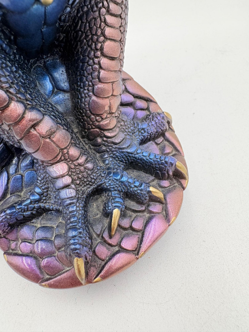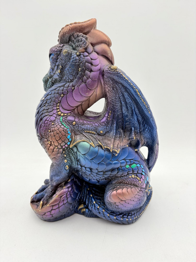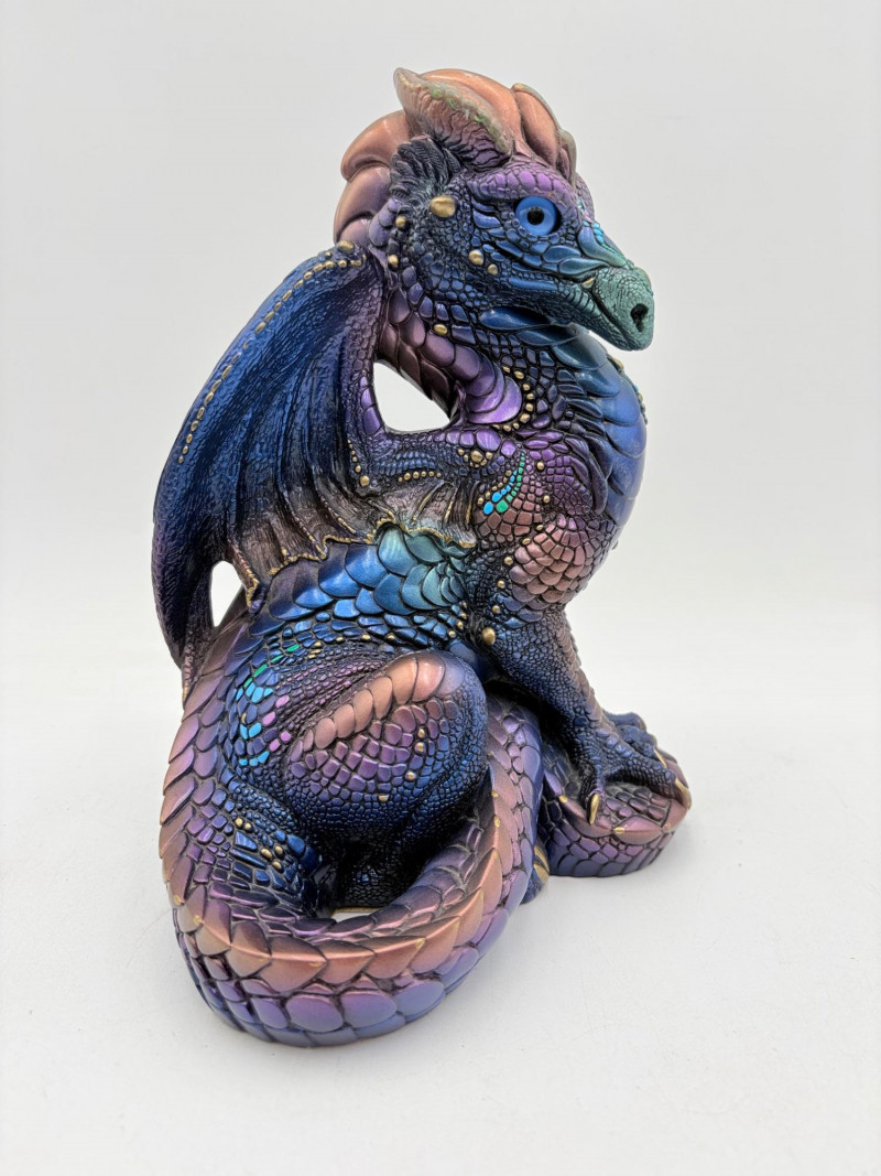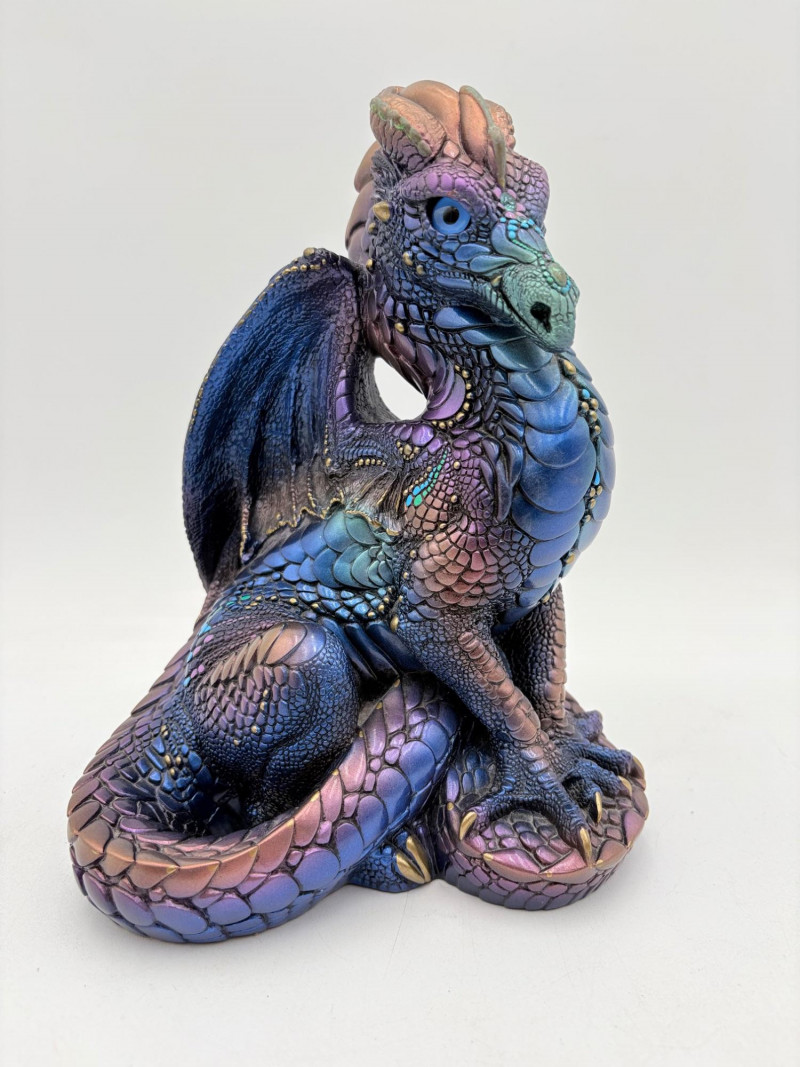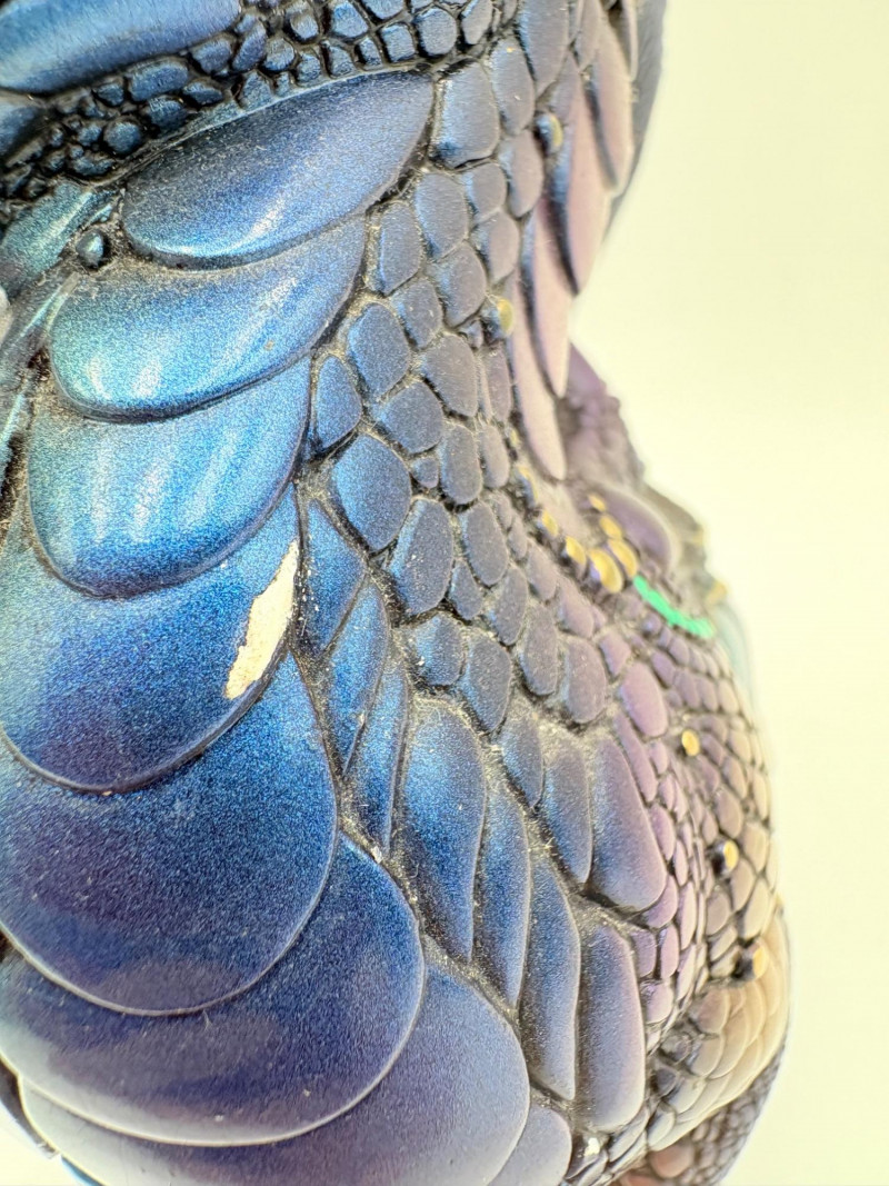 Really gorgeous iridescent purple, green, & blue peacock dragon from Windstone Editions. This was handmade in the USA and this colorway was retired in the mid-1980s. Quite heavy. measures 9" H. Note there are two small flaws on the paint - see last 2 photos.