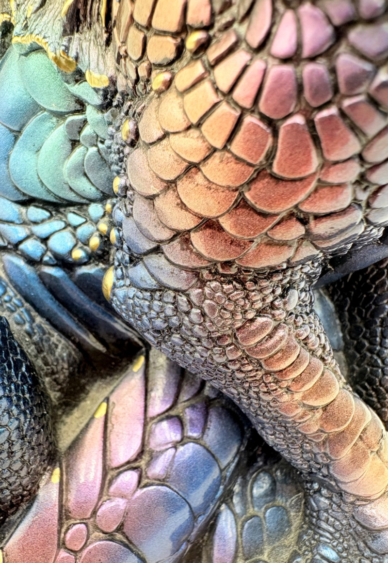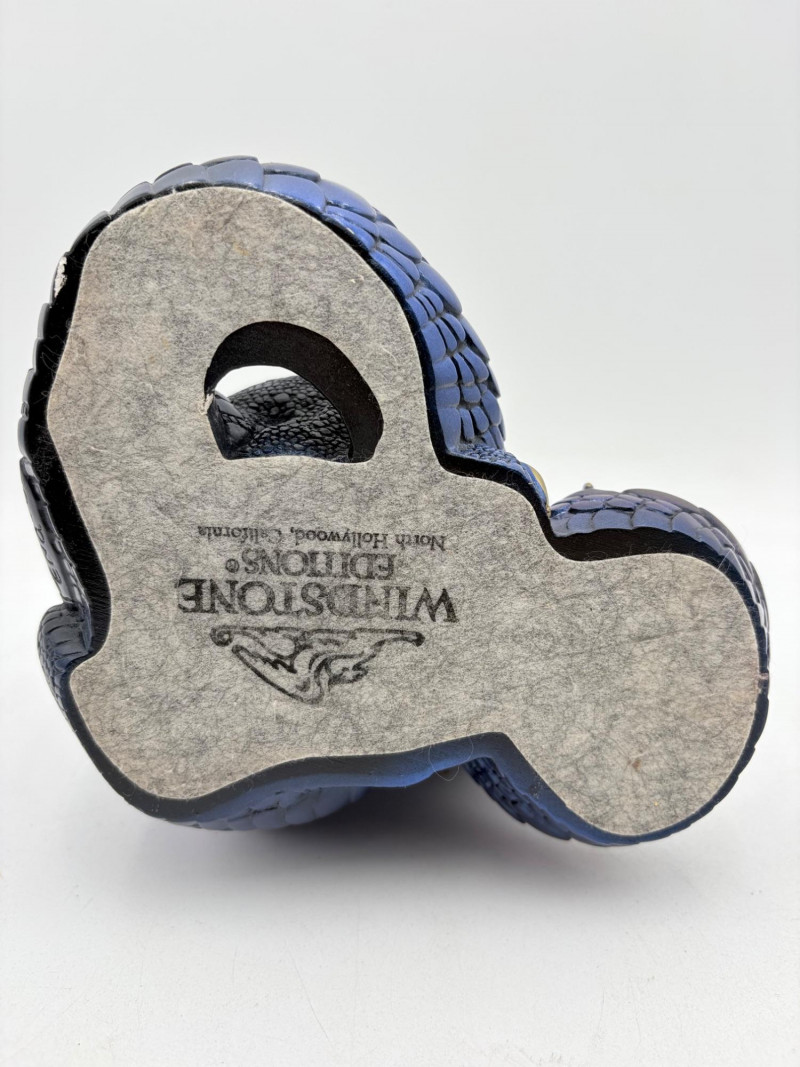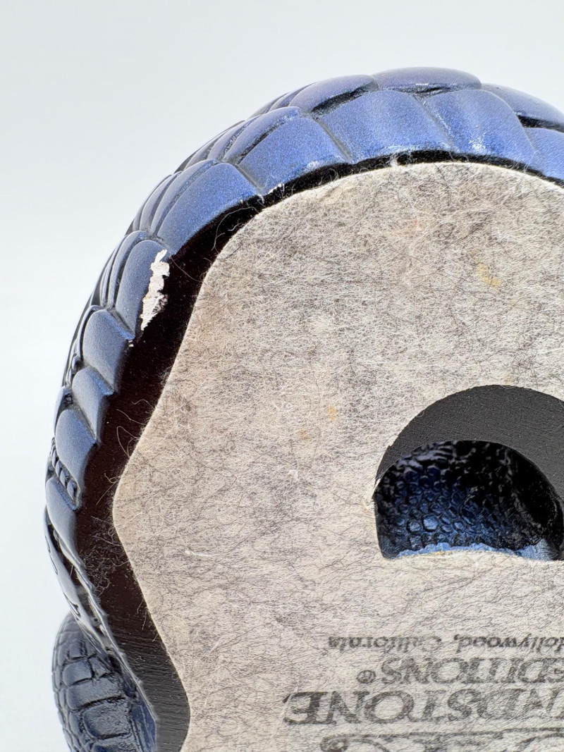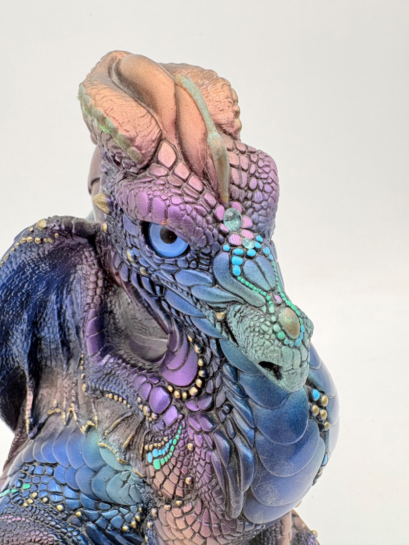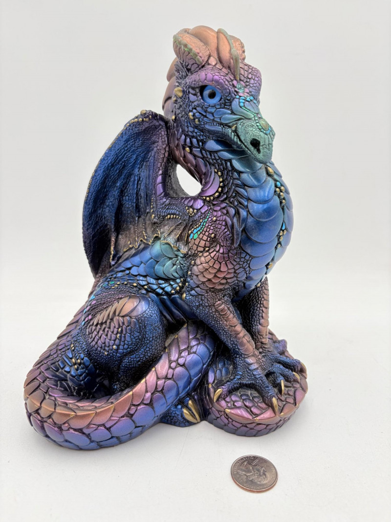 Really gorgeous iridescent purple, green, & blue peacock dragon from Windstone Editions. This was handmade in the USA and this colorway was retired in the mid-1980s. Quite heavy. measures 9" H. Note there are two small flaws on the paint - see last 2 photos.