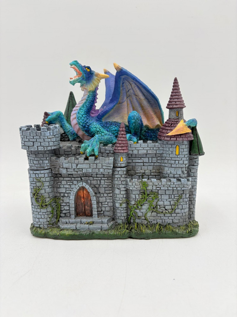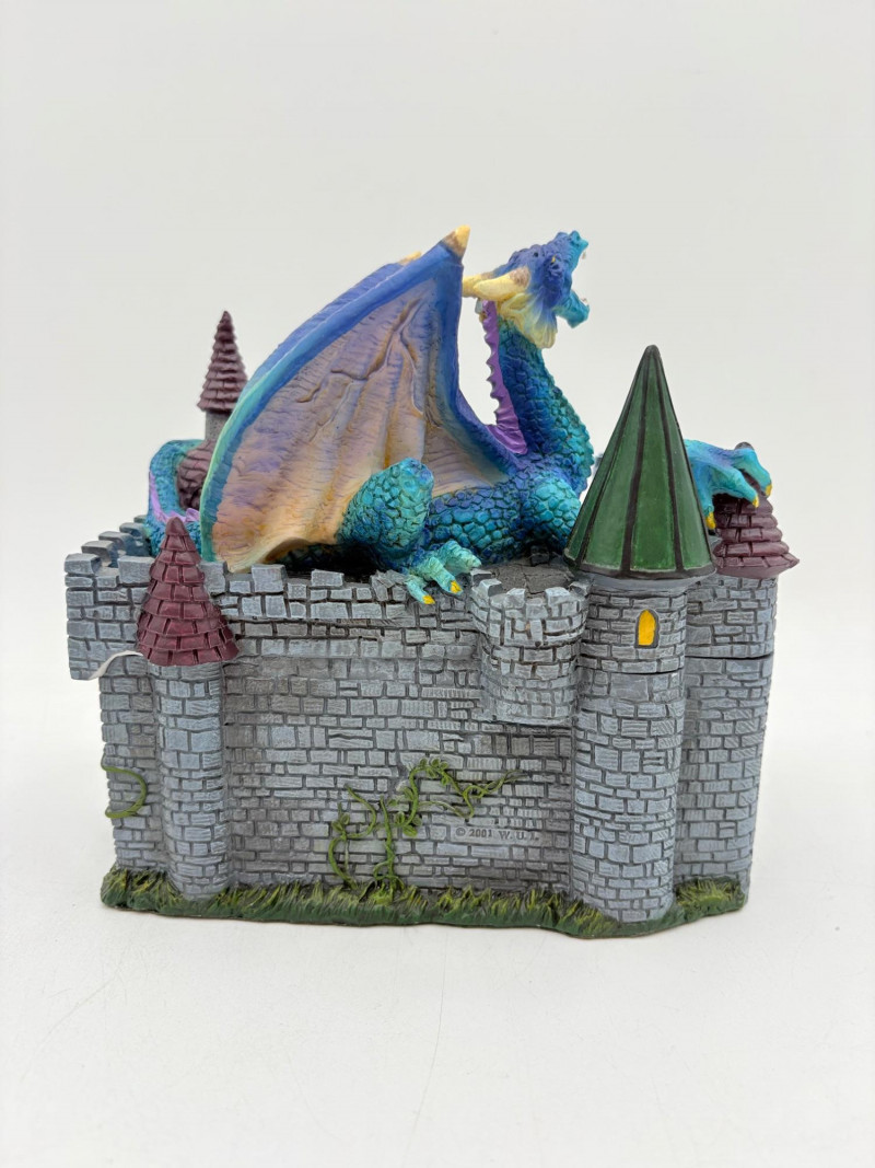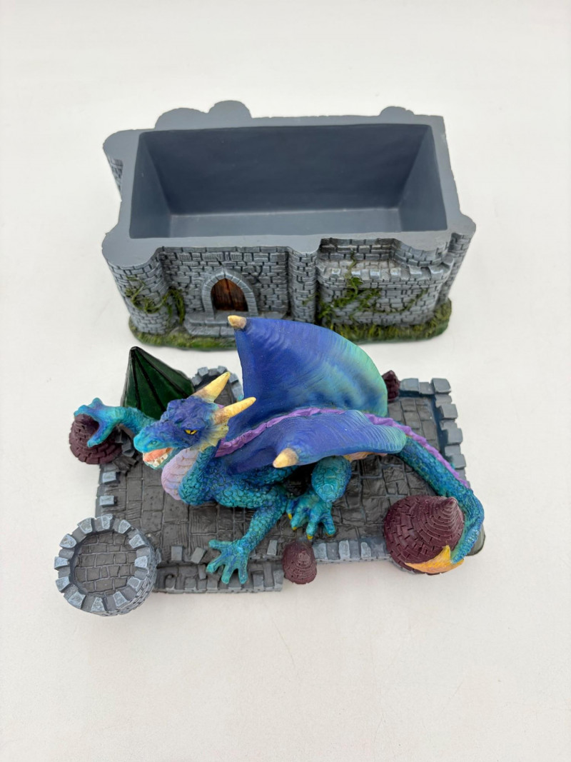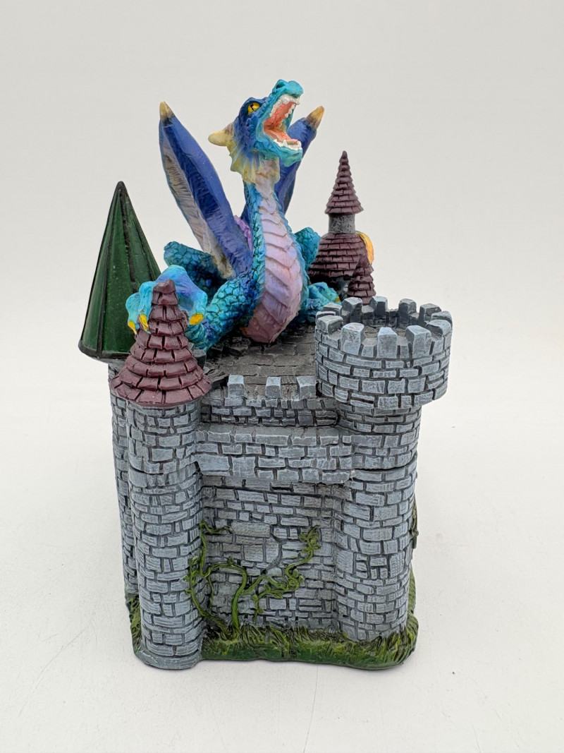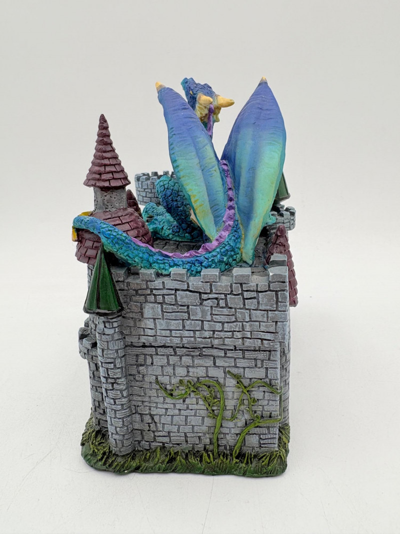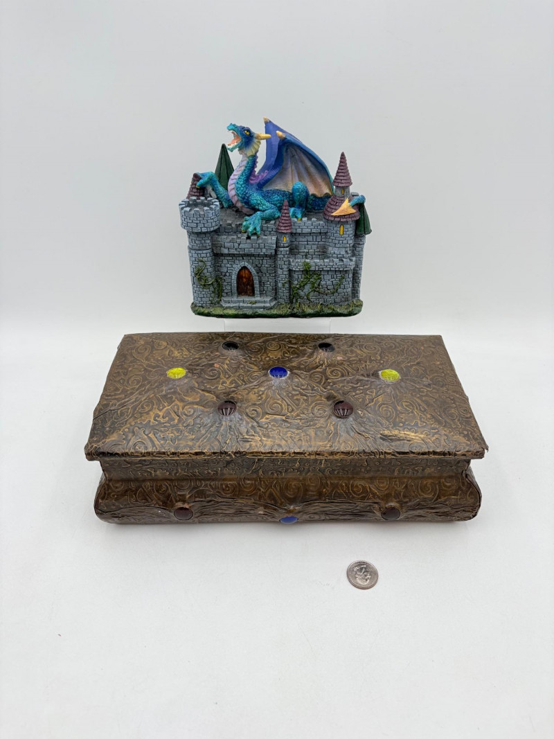 Two fun boxes with a dragon theme! While they aren't especially precious, they are fun! - Metal-covered box resembling dragon skin with colored glass insets. Bottom is actual wood, but under the lid is pressboard - much of the box needs some regluing on the metal skin - see last photos. Measures 4" H x 12.5" W x 6.5" D. While kids would love this, if you give it to them make sure you glue it beforehand as some of the metal edges are sharp. - Resin box in the shape of a castle has a blue dragon on the lid. Measures 6.5" H x 6.75" L x 3.25" D.
