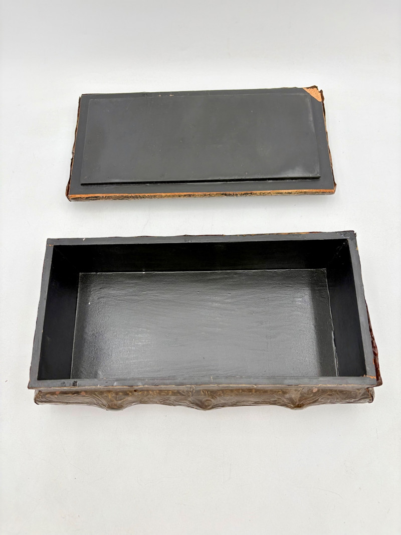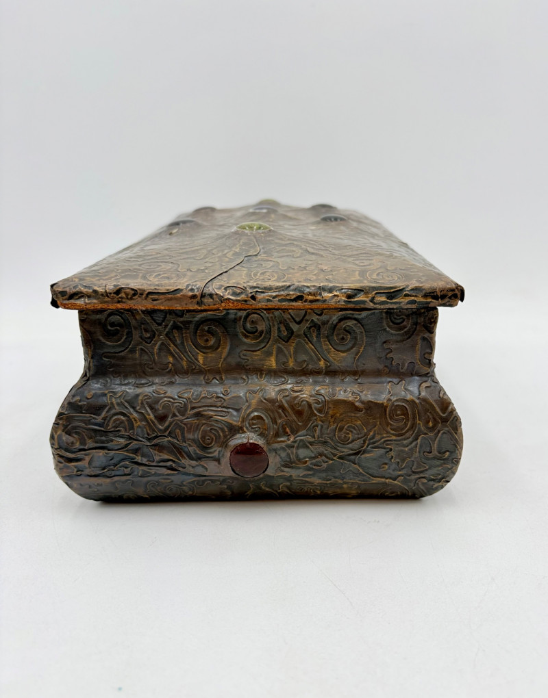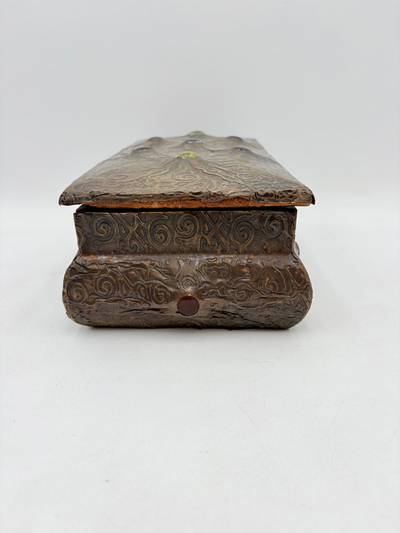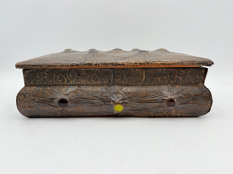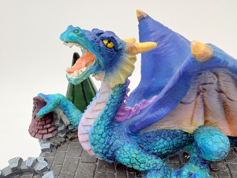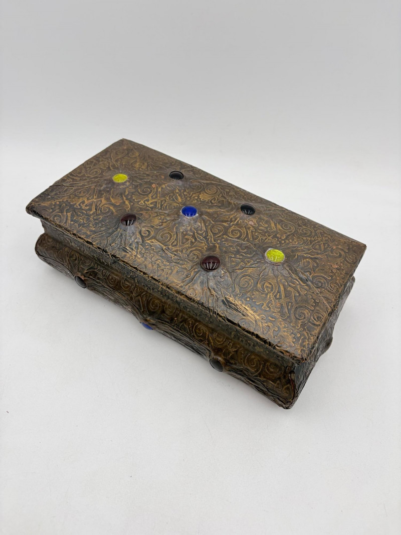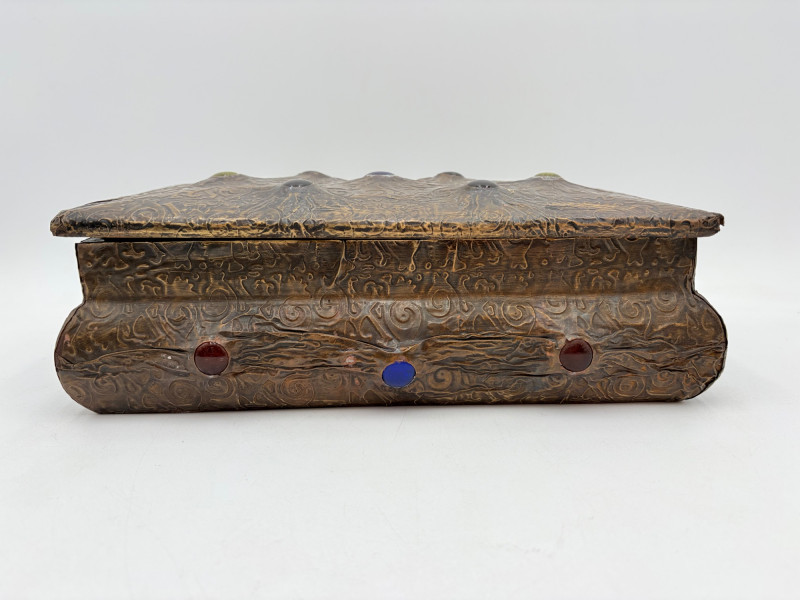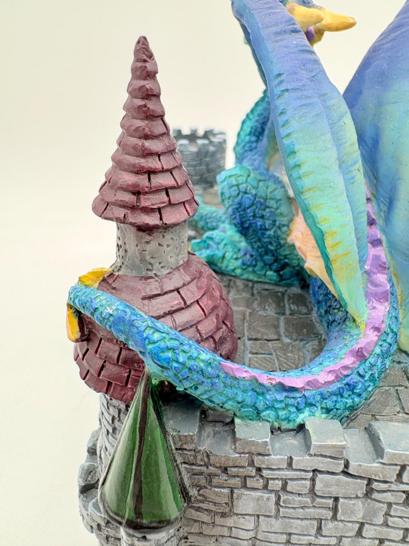 Two fun boxes with a dragon theme! While they aren't especially precious, they are fun! - Metal-covered box resembling dragon skin with colored glass insets. Bottom is actual wood, but under the lid is pressboard - much of the box needs some regluing on the metal skin - see last photos. Measures 4" H x 12.5" W x 6.5" D. While kids would love this, if you give it to them make sure you glue it beforehand as some of the metal edges are sharp. - Resin box in the shape of a castle has a blue dragon on the lid. Measures 6.5" H x 6.75" L x 3.25" D.