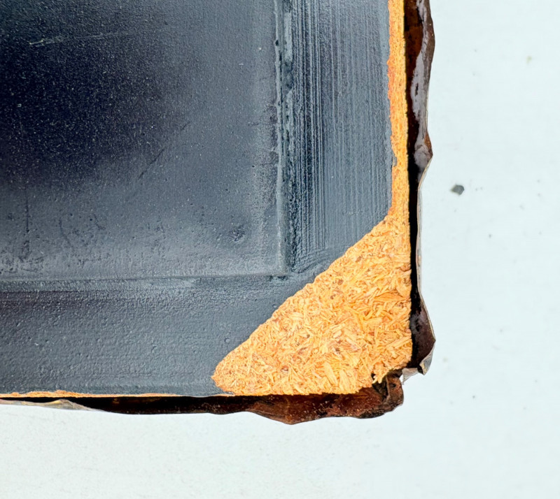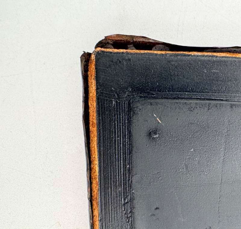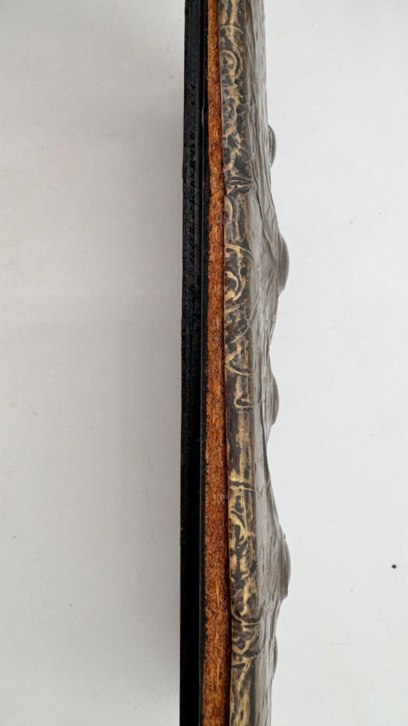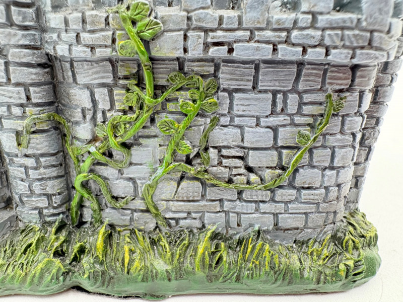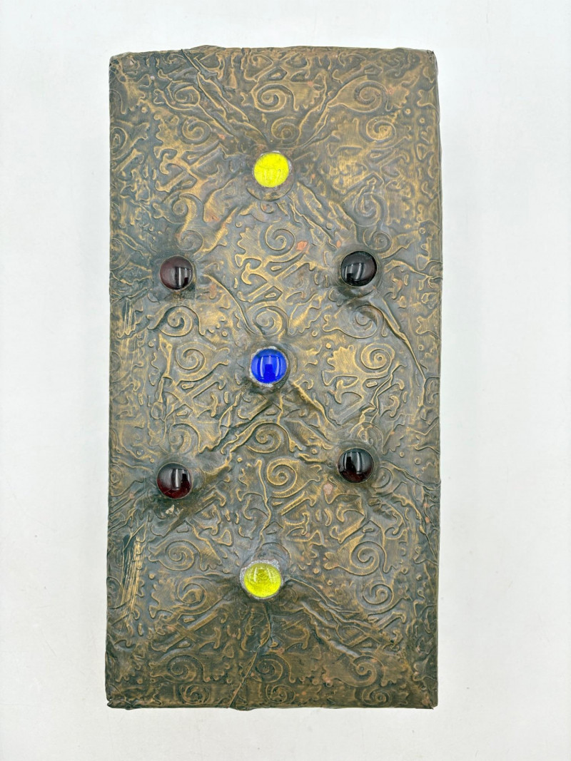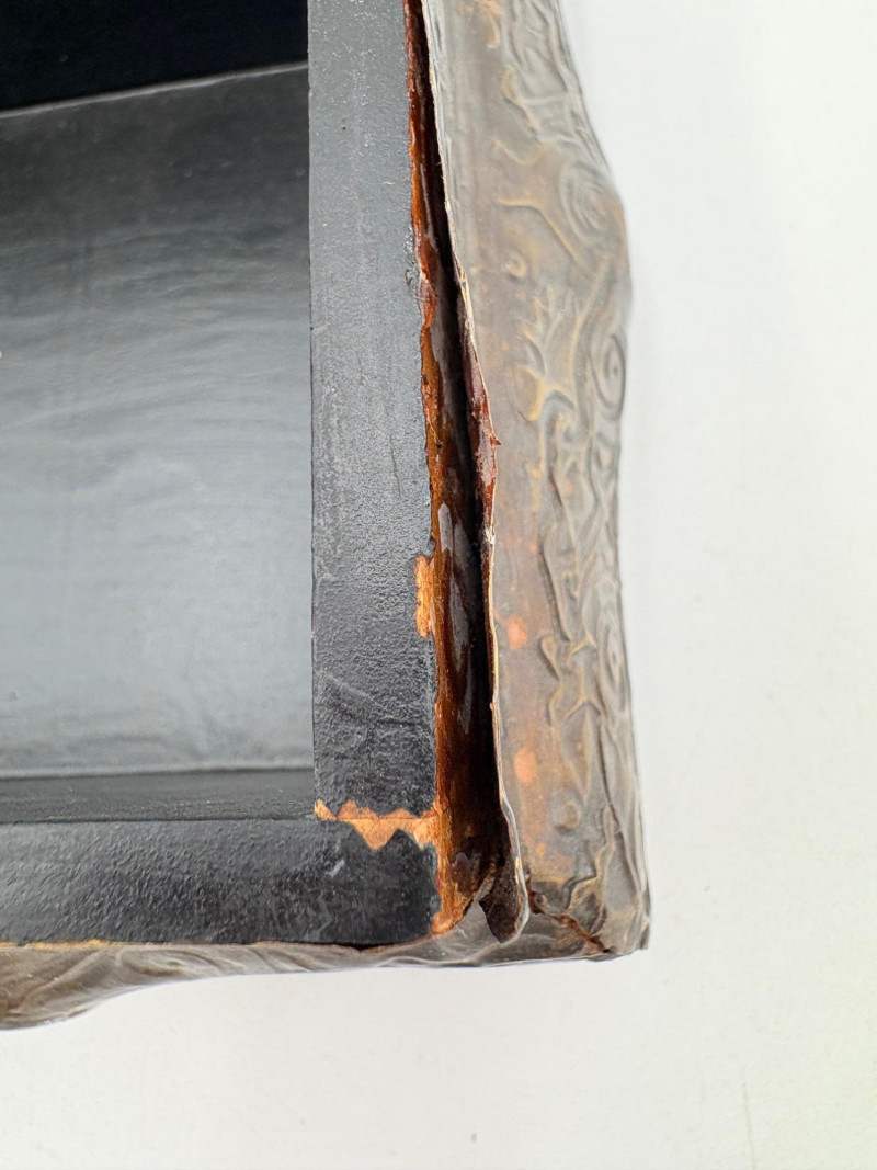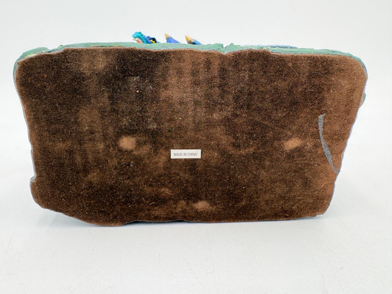 Two fun boxes with a dragon theme! While they aren't especially precious, they are fun! - Metal-covered box resembling dragon skin with colored glass insets. Bottom is actual wood, but under the lid is pressboard - much of the box needs some regluing on the metal skin - see last photos. Measures 4" H x 12.5" W x 6.5" D. While kids would love this, if you give it to them make sure you glue it beforehand as some of the metal edges are sharp. - Resin box in the shape of a castle has a blue dragon on the lid. Measures 6.5" H x 6.75" L x 3.25" D.