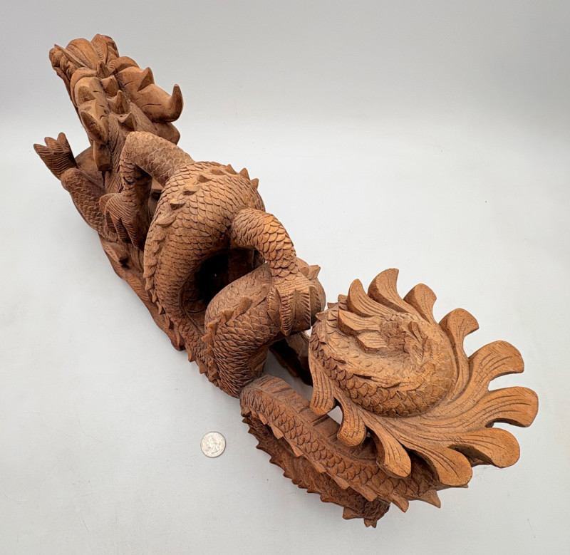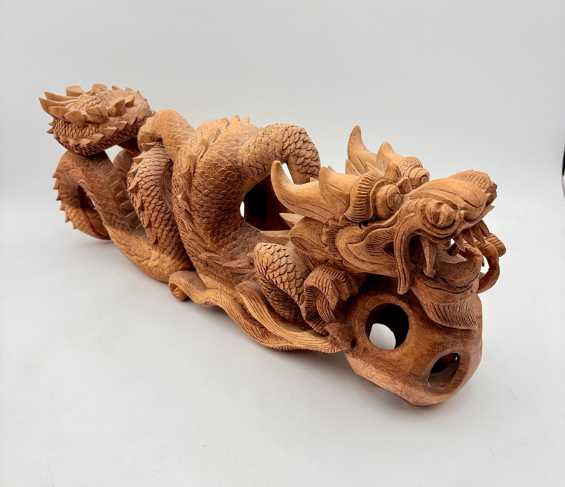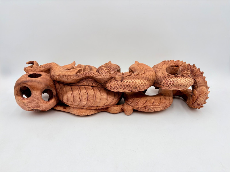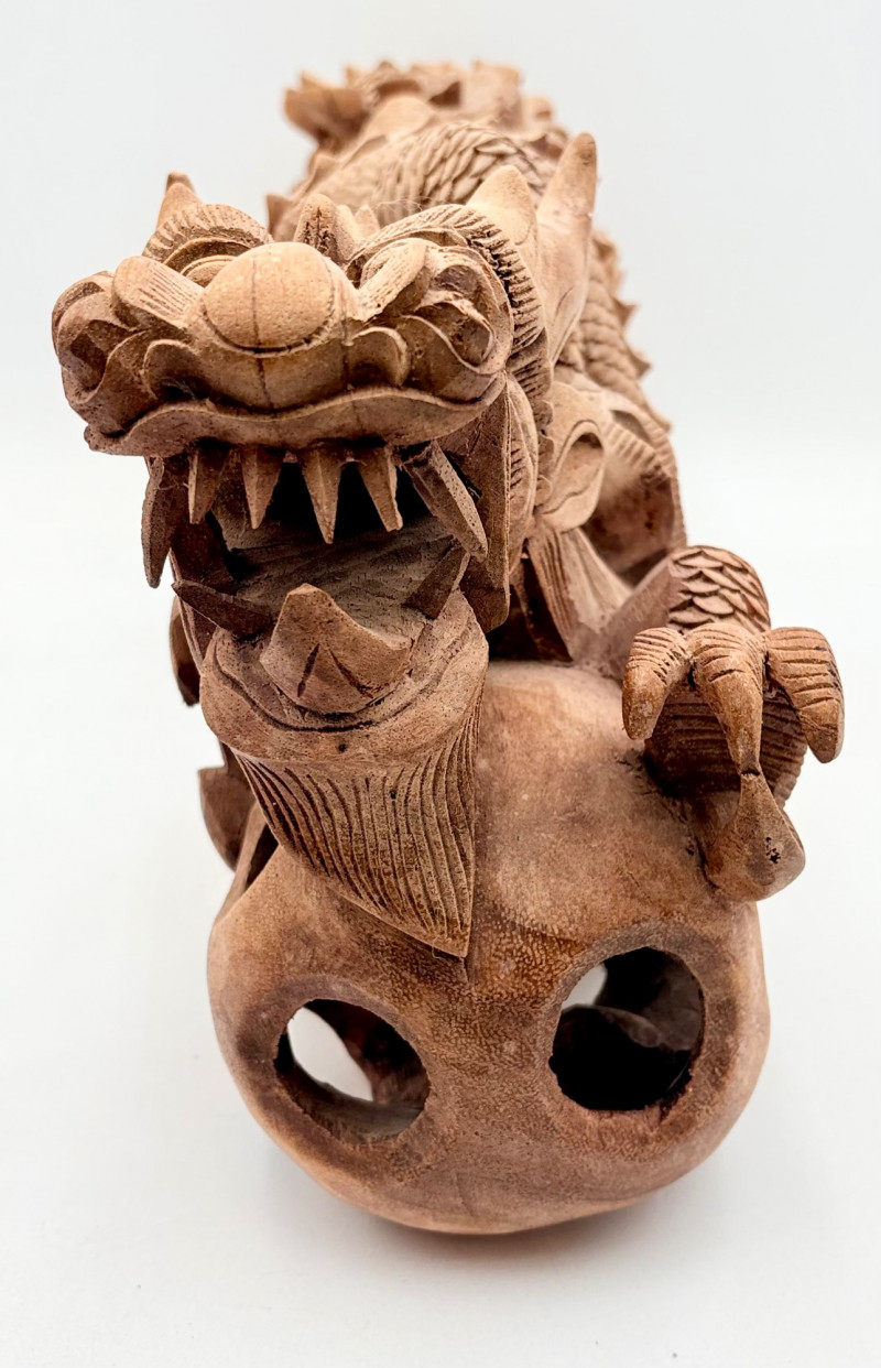 Fairly large carved wooden dragon in a crouching horizontal position. Appears to be saur wood and has lots of fine detail with a hollow orb/ball under his front legs. Measures approx. 8" H x 20" L.