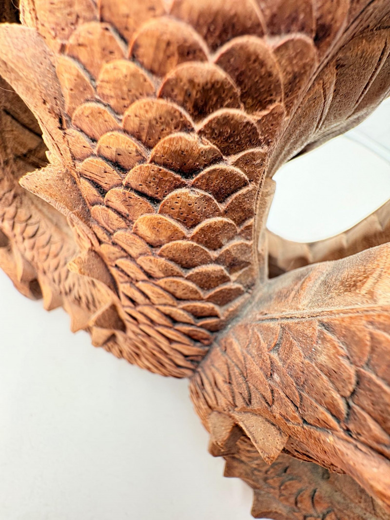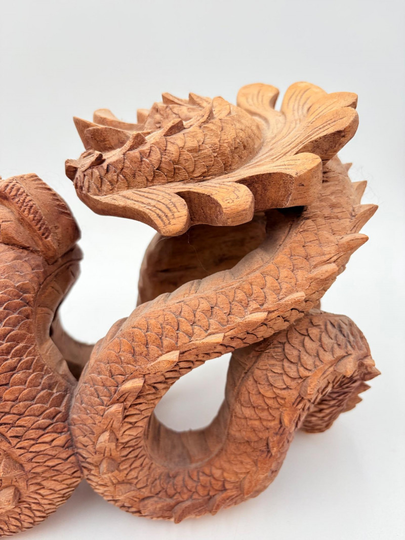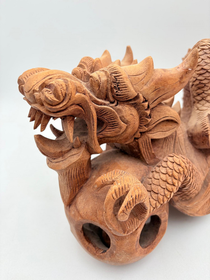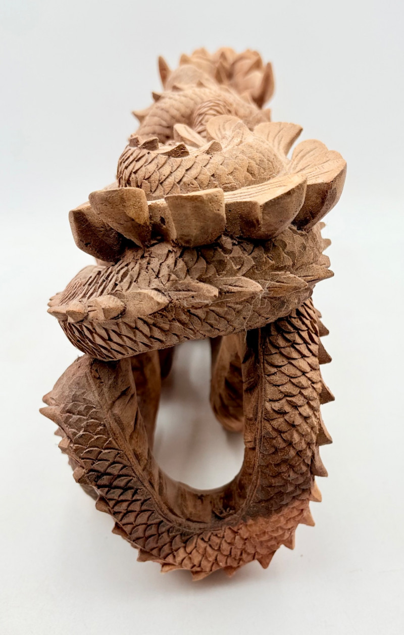 Fairly large carved wooden dragon in a crouching horizontal position. Appears to be saur wood and has lots of fine detail with a hollow orb/ball under his front legs. Measures approx. 8" H x 20" L.