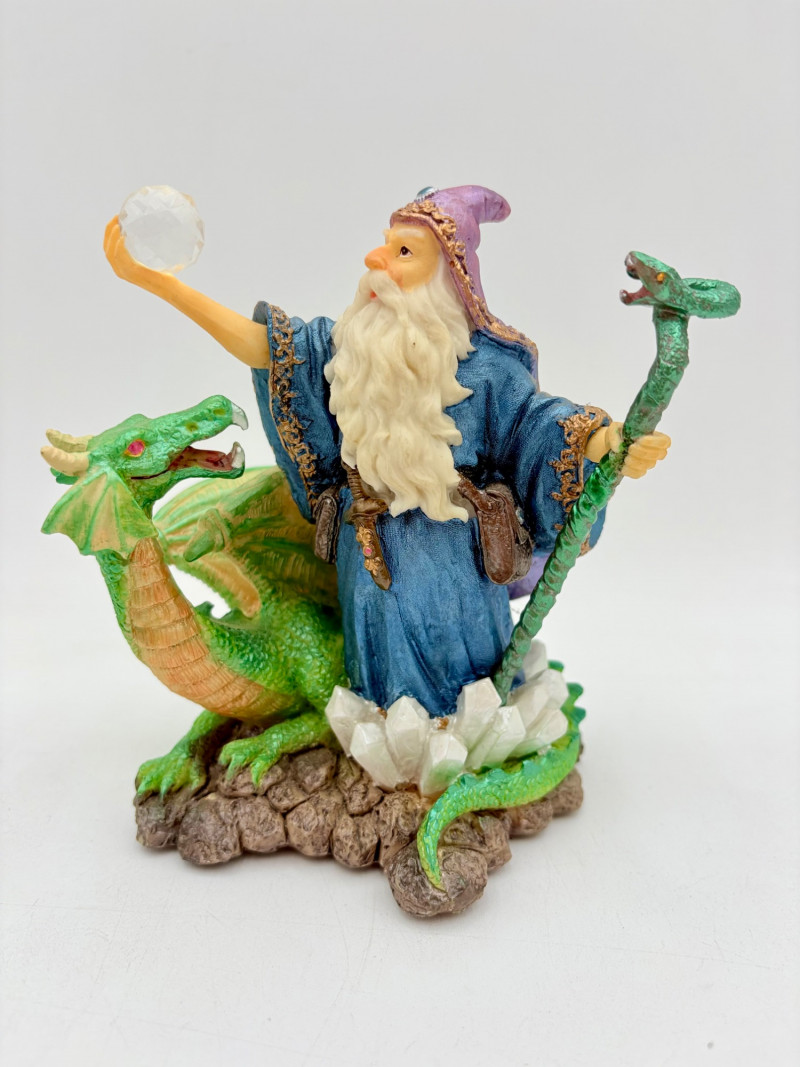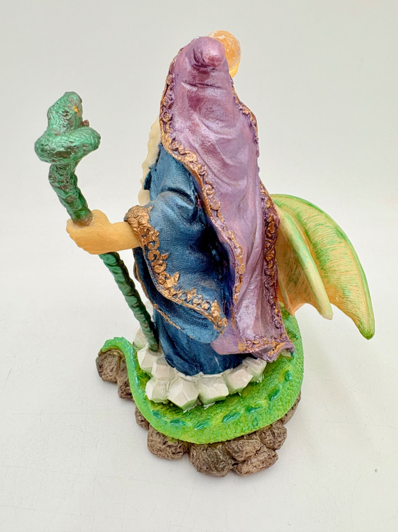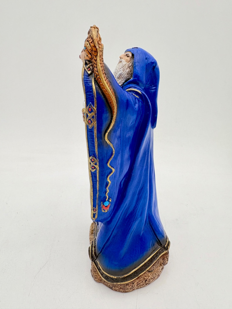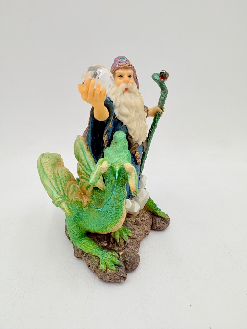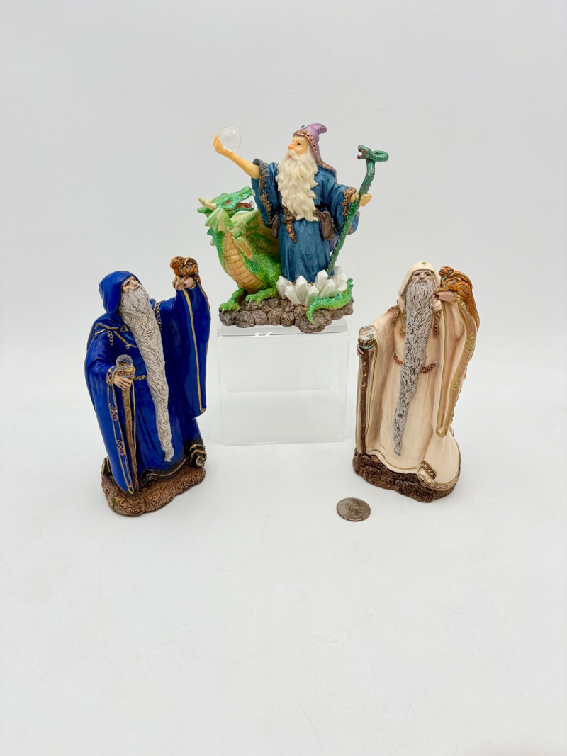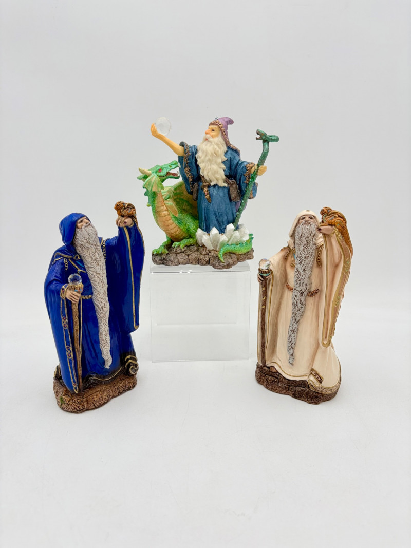 Trio of wizards in flowing robes, holding a staff, and one has an accompanying dragon. - Dark blue and white wizards are identical except for colorway - they are from the Windsong Collection and are hand-painted. These are really highly crafted pieces. Measure 7" H. - The smaller wizard is of resin with a snake staff & larger dragon. Measures 5.5" H.