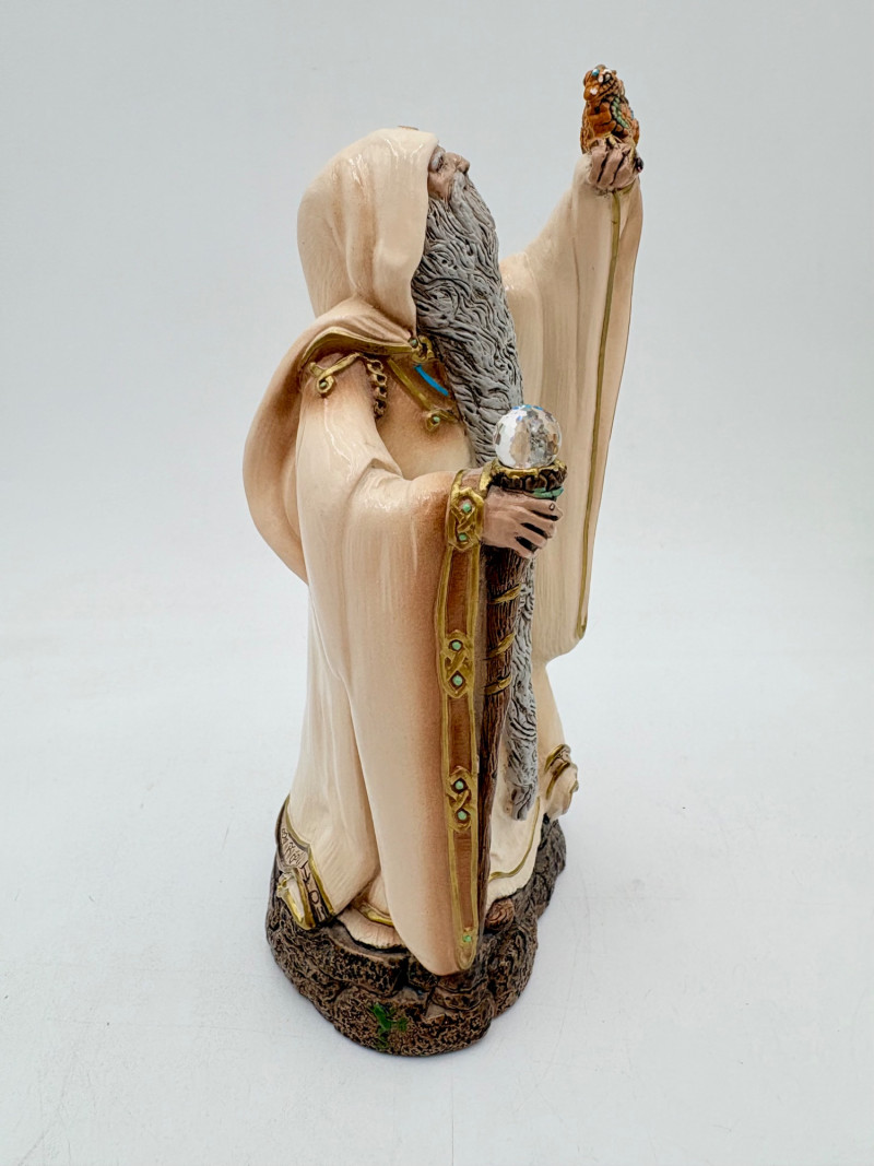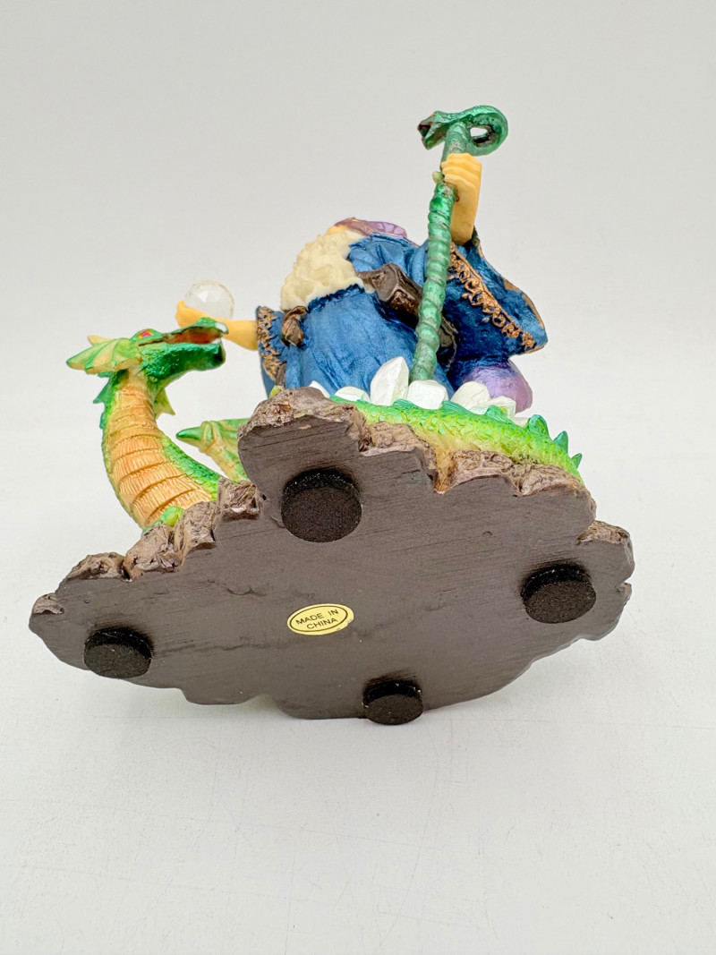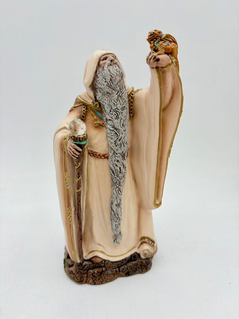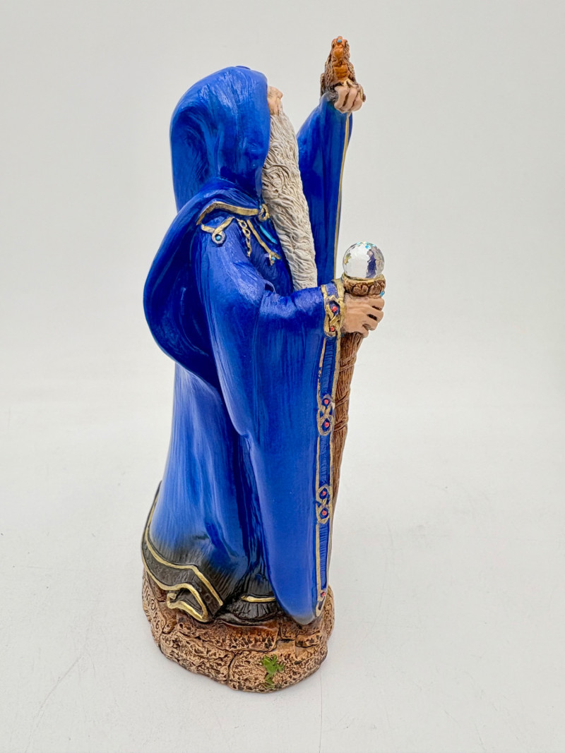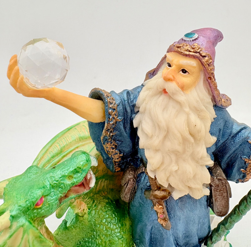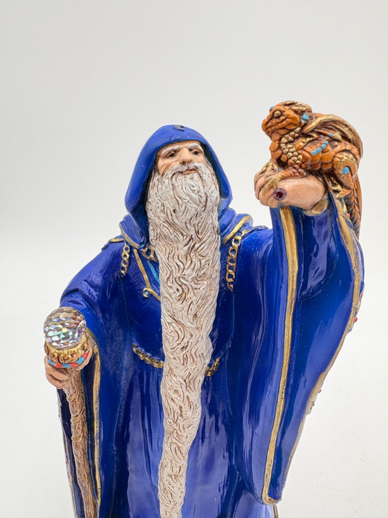 Trio of wizards in flowing robes, holding a staff, and one has an accompanying dragon. - Dark blue and white wizards are identical except for colorway - they are from the Windsong Collection and are hand-painted. These are really highly crafted pieces. Measure 7" H. - The smaller wizard is of resin with a snake staff & larger dragon. Measures 5.5" H.