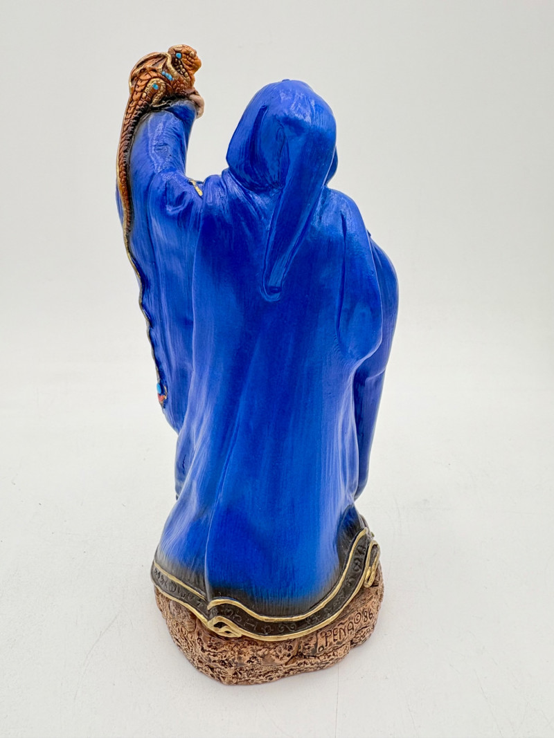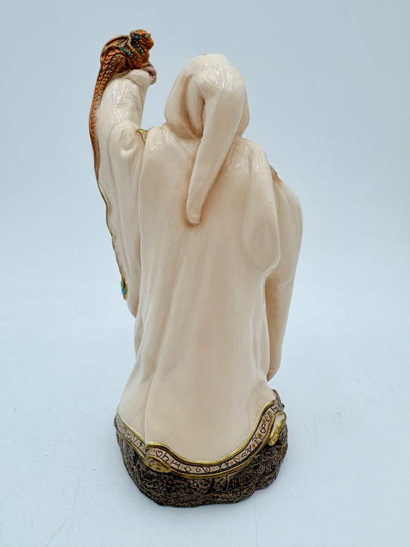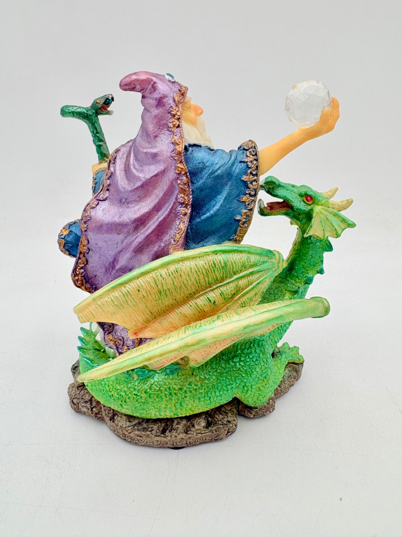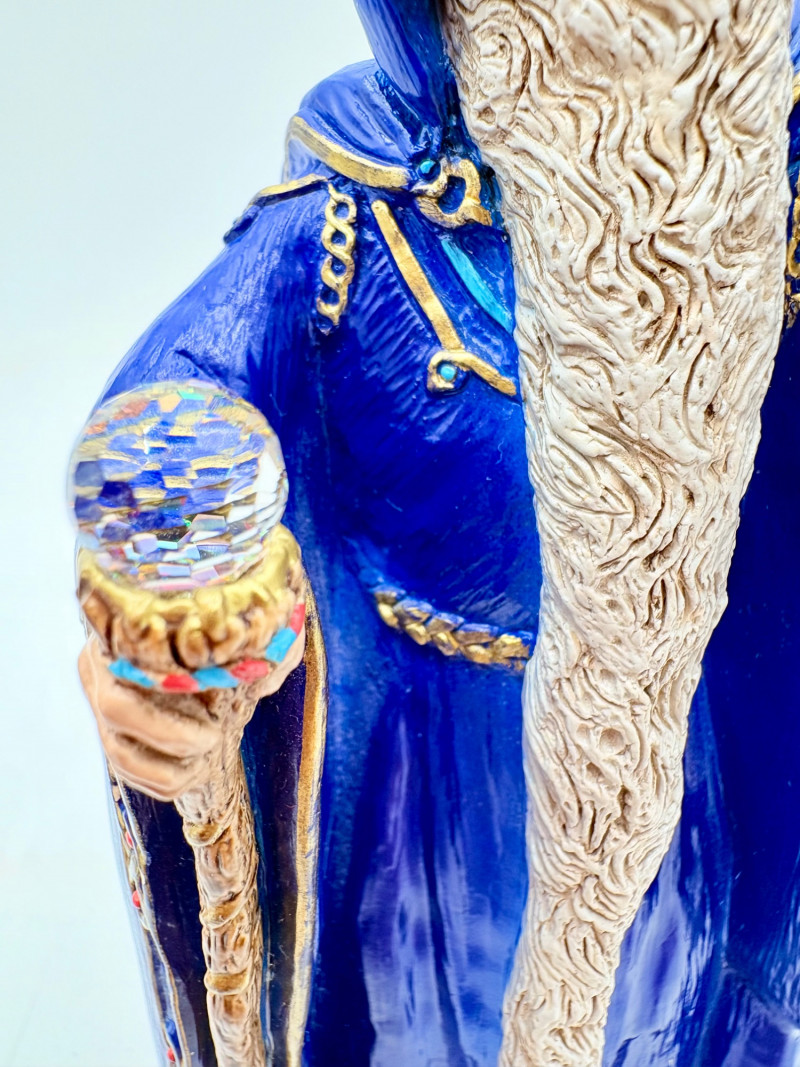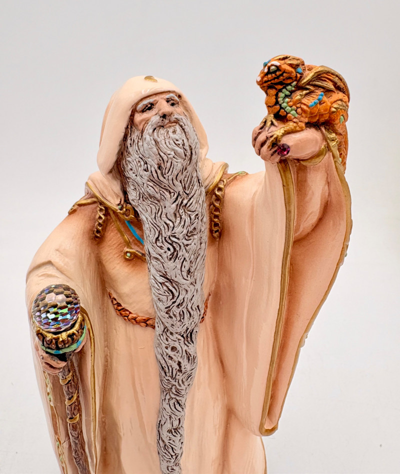 Trio of wizards in flowing robes, holding a staff, and one has an accompanying dragon. - Dark blue and white wizards are identical except for colorway - they are from the Windsong Collection and are hand-painted. These are really highly crafted pieces. Measure 7" H. - The smaller wizard is of resin with a snake staff & larger dragon. Measures 5.5" H.