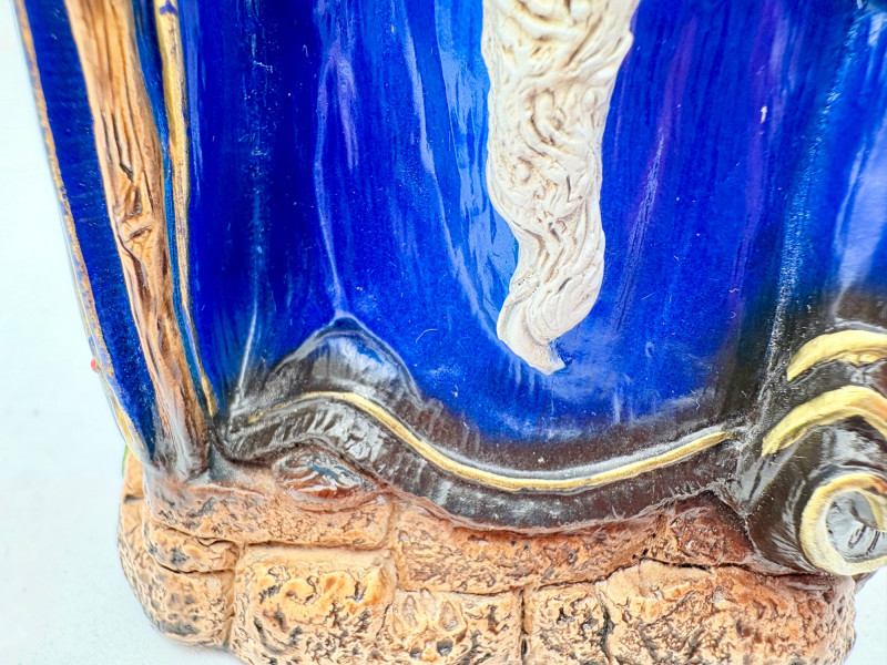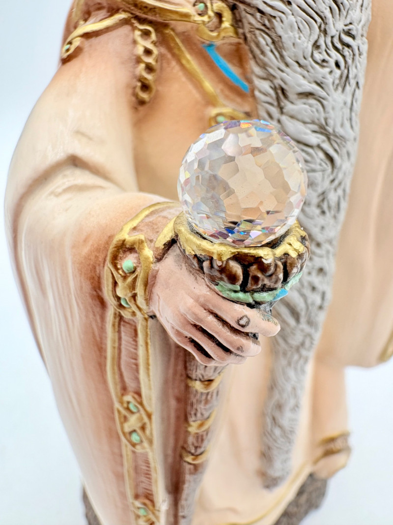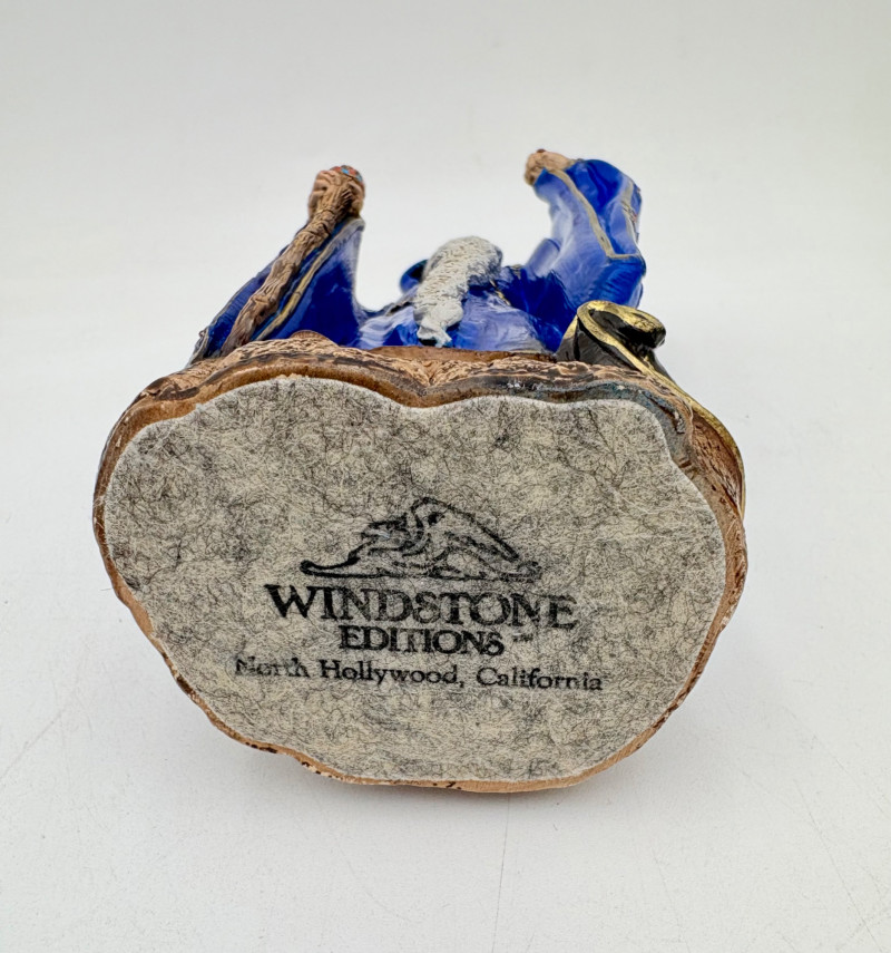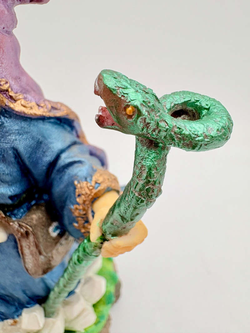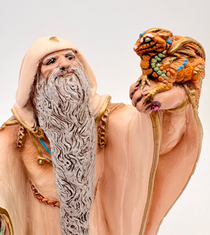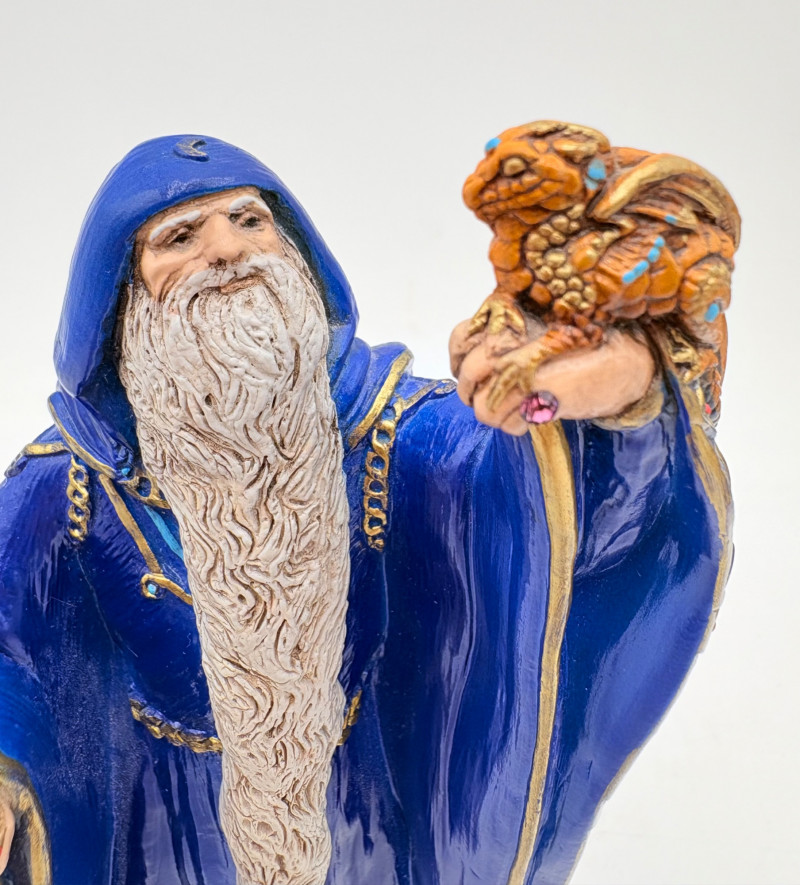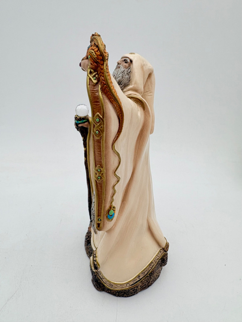 Trio of wizards in flowing robes, holding a staff, and one has an accompanying dragon. - Dark blue and white wizards are identical except for colorway - they are from the Windsong Collection and are hand-painted. These are really highly crafted pieces. Measure 7" H. - The smaller wizard is of resin with a snake staff & larger dragon. Measures 5.5" H.