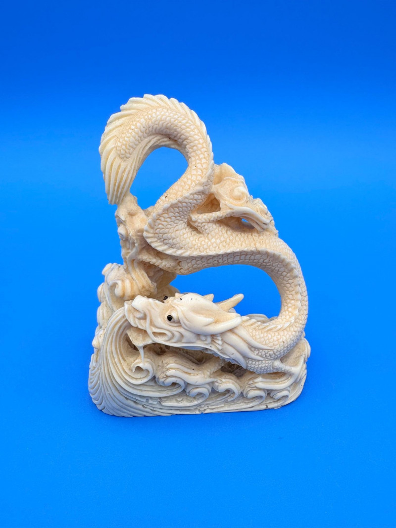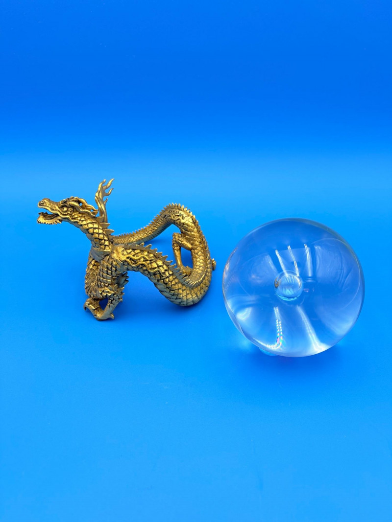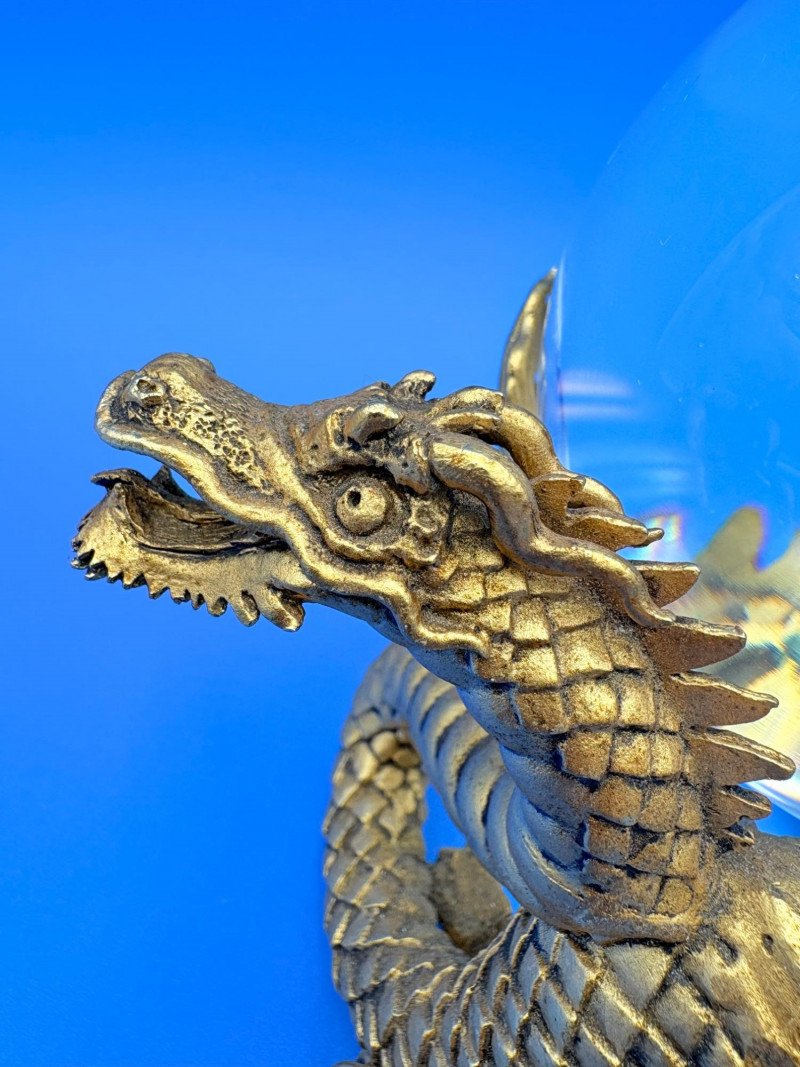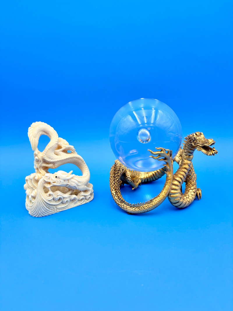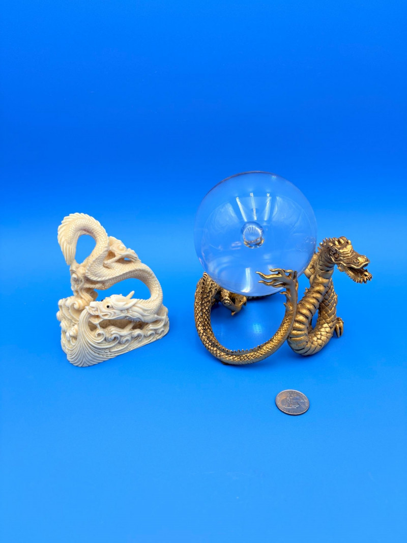 Pair of smaller tabletop dragons in Asian style, but very different in appearance. Heavy golden cast metal dragon encircles a clear glass orb. Mark of bottom says "90FM". Measures 5.25" H. Finely detailed resin white dragon rises from curly waves - terrific scales! Measures 4.5" H.
