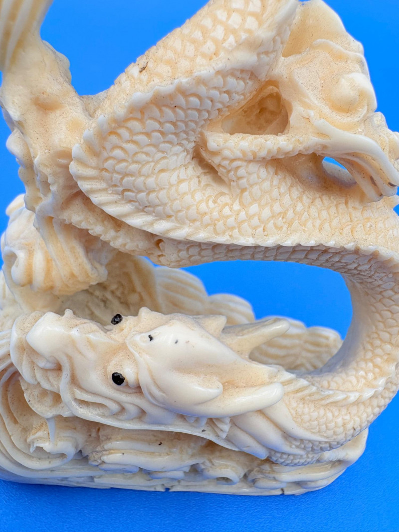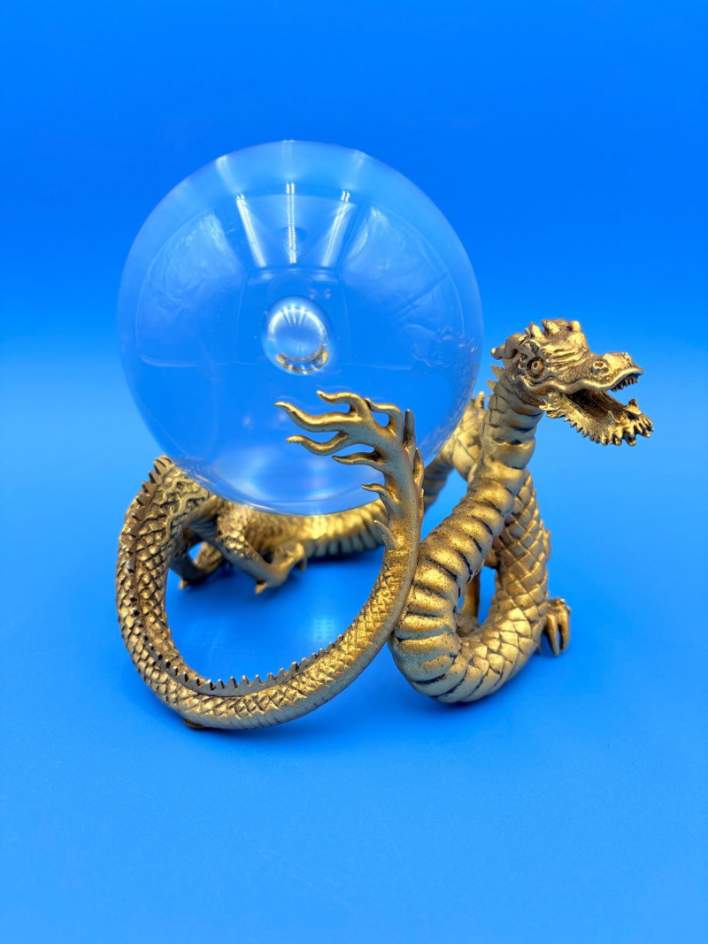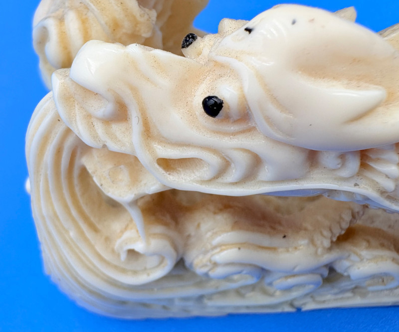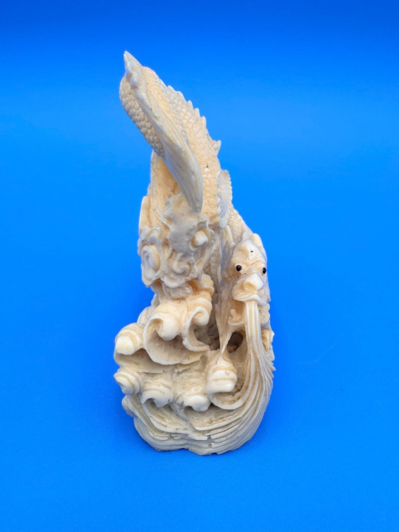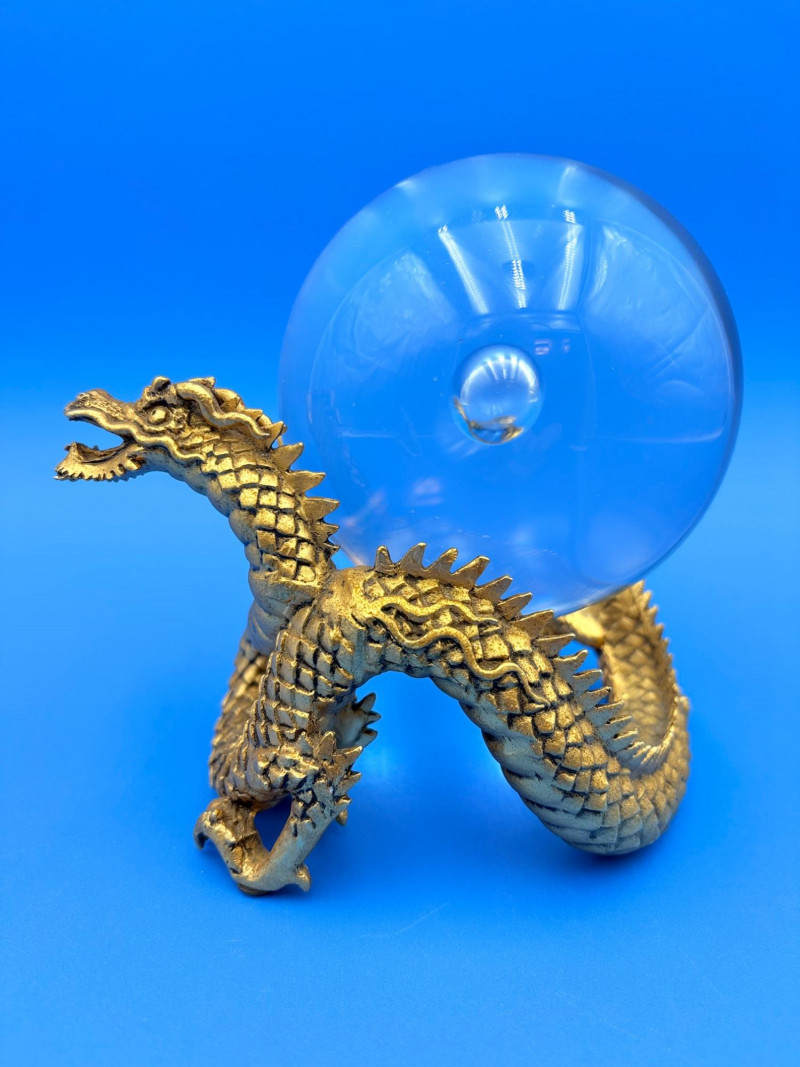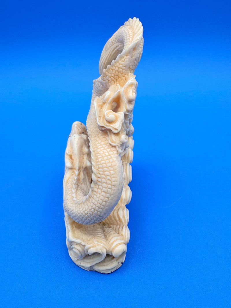 Pair of smaller tabletop dragons in Asian style, but very different in appearance. Heavy golden cast metal dragon encircles a clear glass orb. Mark of bottom says "90FM". Measures 5.25" H. Finely detailed resin white dragon rises from curly waves - terrific scales! Measures 4.5" H.
