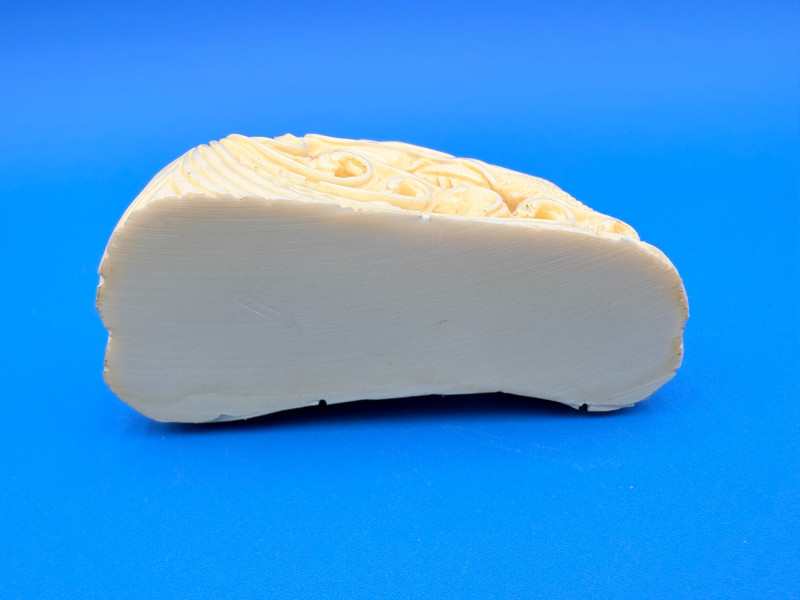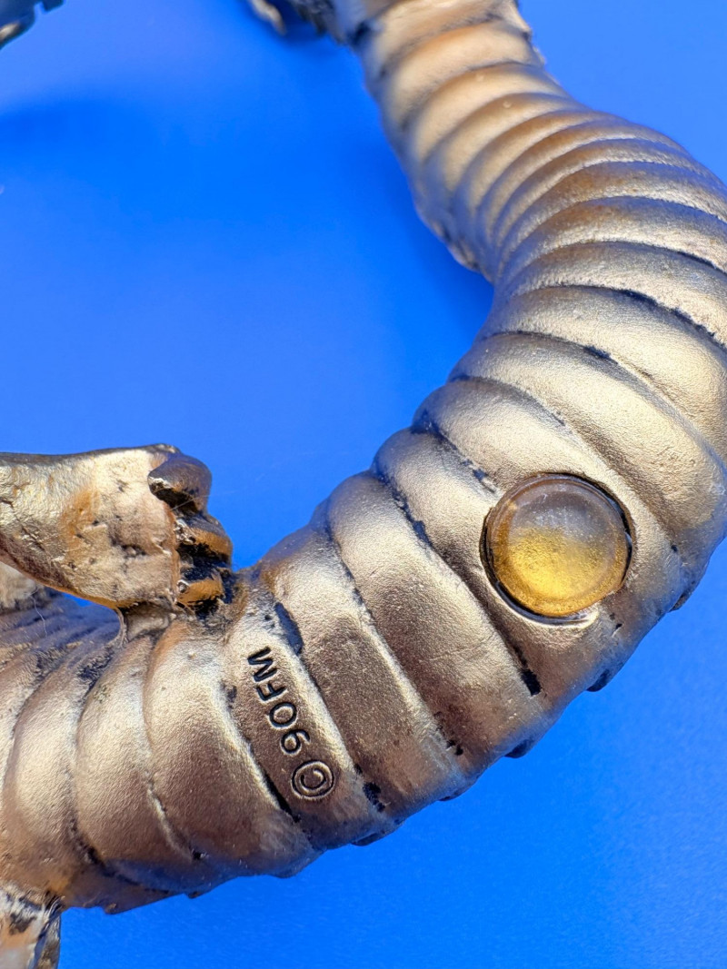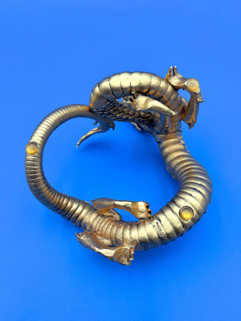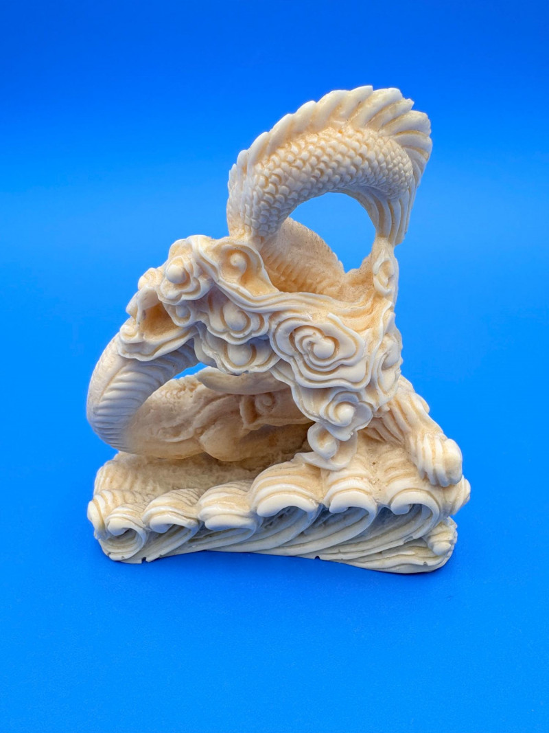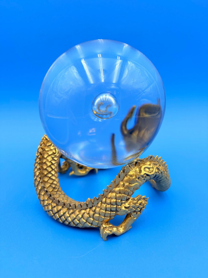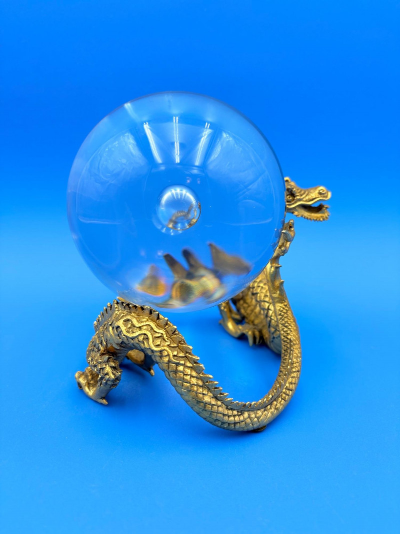 Pair of smaller tabletop dragons in Asian style, but very different in appearance. Heavy golden cast metal dragon encircles a clear glass orb. Mark of bottom says "90FM". Measures 5.25" H. Finely detailed resin white dragon rises from curly waves - terrific scales! Measures 4.5" H.