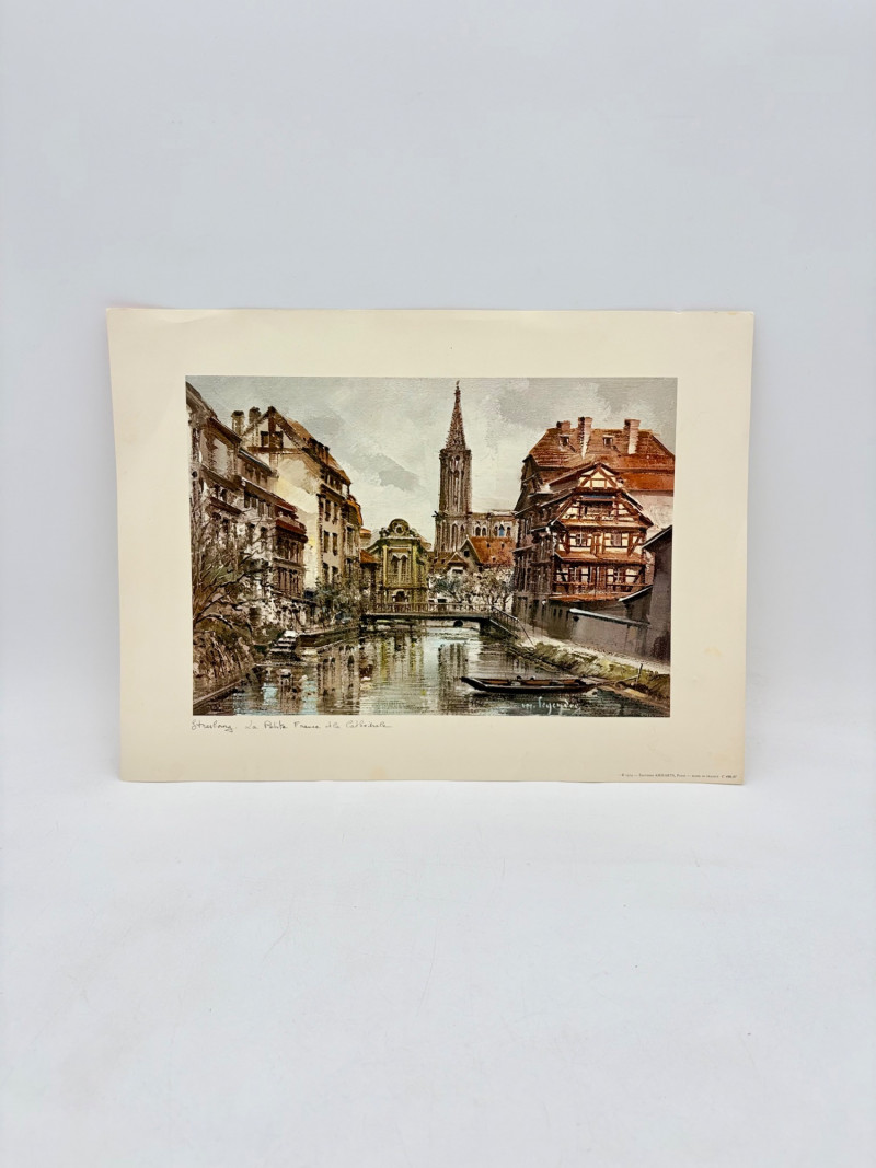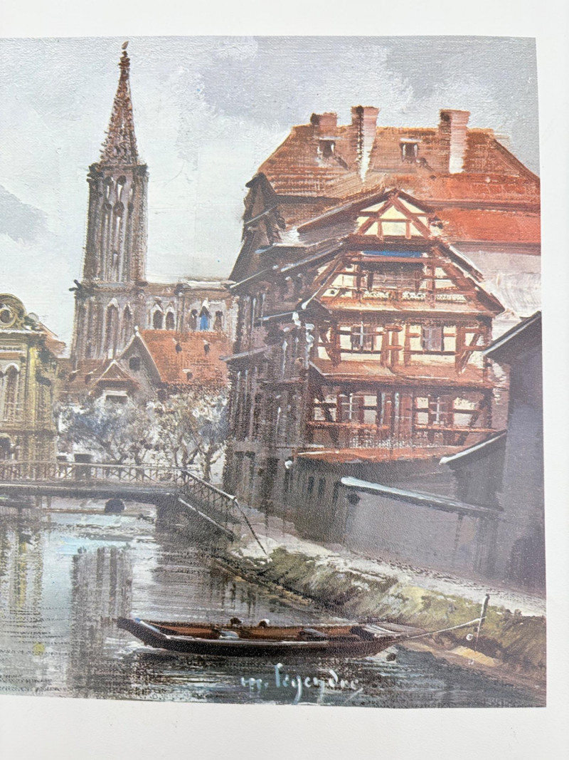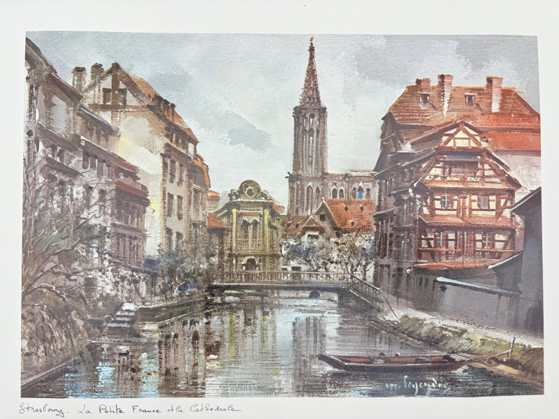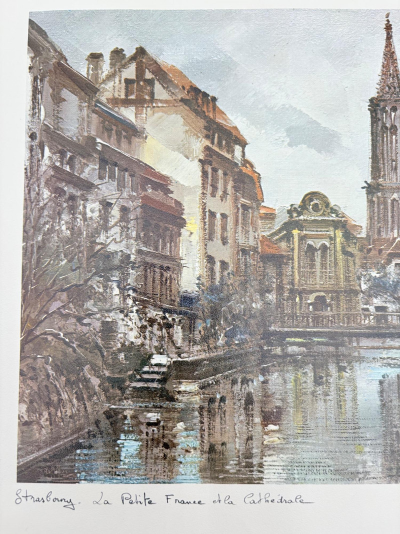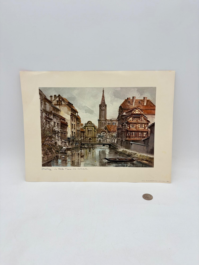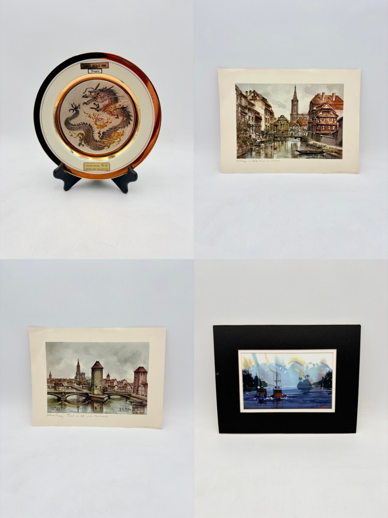 Quartet of art pieces from east & west. - Two 1970s prints of scenes in Strasbourg, France. From Krisarts of Paris. They are printed on quality paper which has a couple of slight ripples that should flatten out when framed. Printed area measures approx.8.25" H x 11.75" W on each. - print of an original watercolor maritime scene by artist Nancy Wages. Note that while this is a print, the artist appears to have signed in pen over the printed signature on the lower right. In a black double mat with overall measurements of 9.5" H x 12.25" W. Chokin Art plate of a dragon in gold with a 24K gold rim. Comes with stand & certificate. Measures just over 9" diameter.