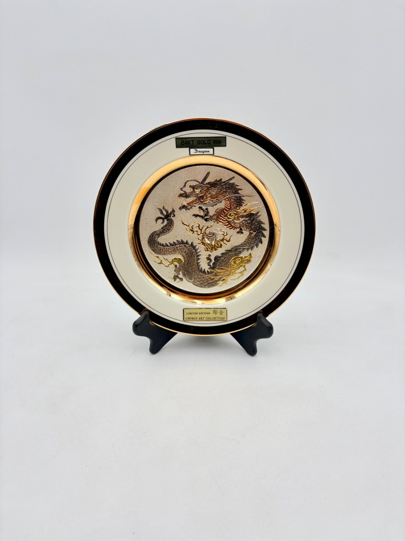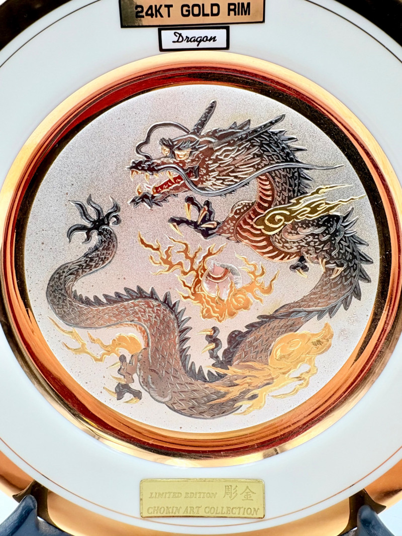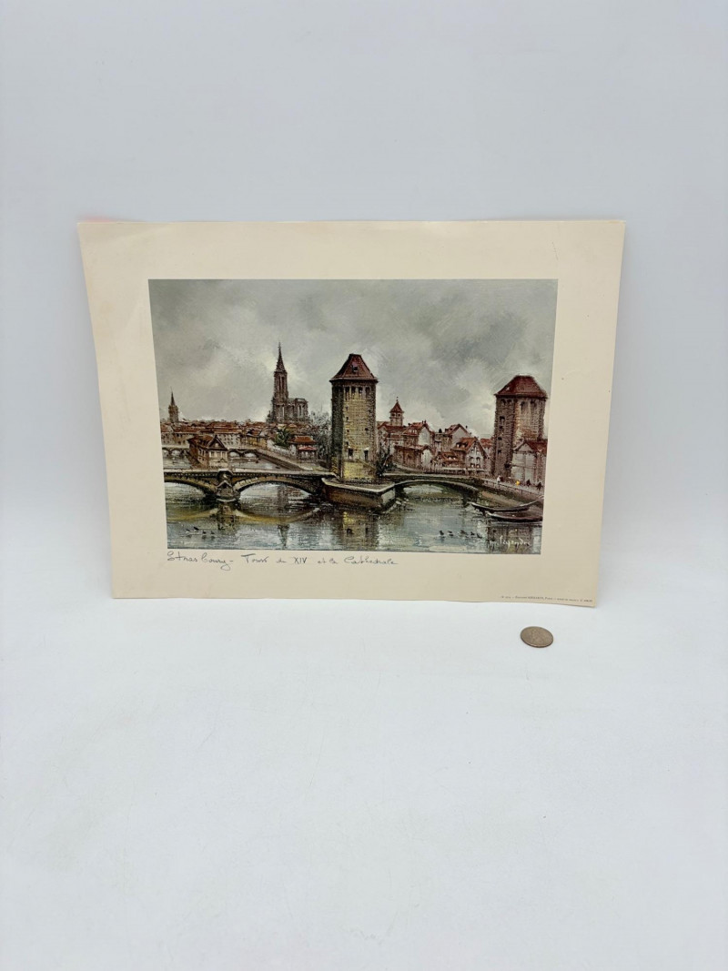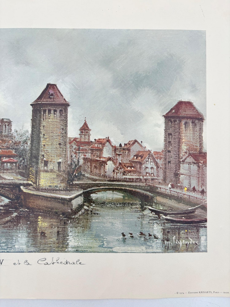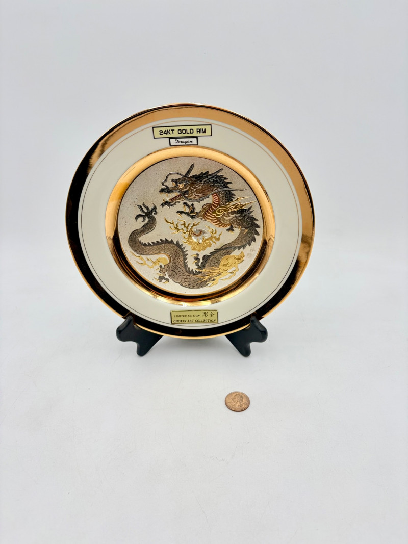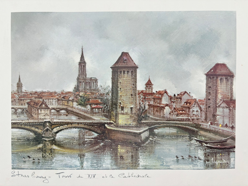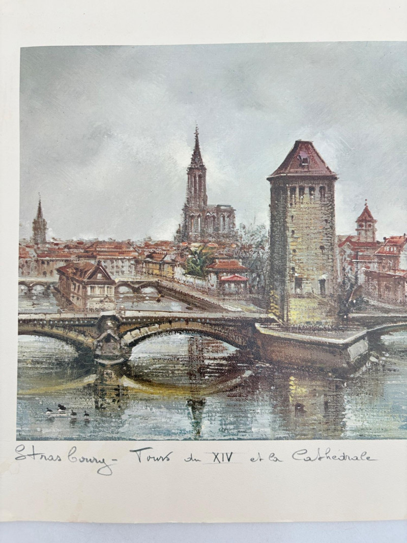 Quartet of art pieces from east & west. - Two 1970s prints of scenes in Strasbourg, France. From Krisarts of Paris. They are printed on quality paper which has a couple of slight ripples that should flatten out when framed. Printed area measures approx.8.25" H x 11.75" W on each. - print of an original watercolor maritime scene by artist Nancy Wages. Note that while this is a print, the artist appears to have signed in pen over the printed signature on the lower right. In a black double mat with overall measurements of 9.5" H x 12.25" W. Chokin Art plate of a dragon in gold with a 24K gold rim. Comes with stand & certificate. Measures just over 9" diameter.