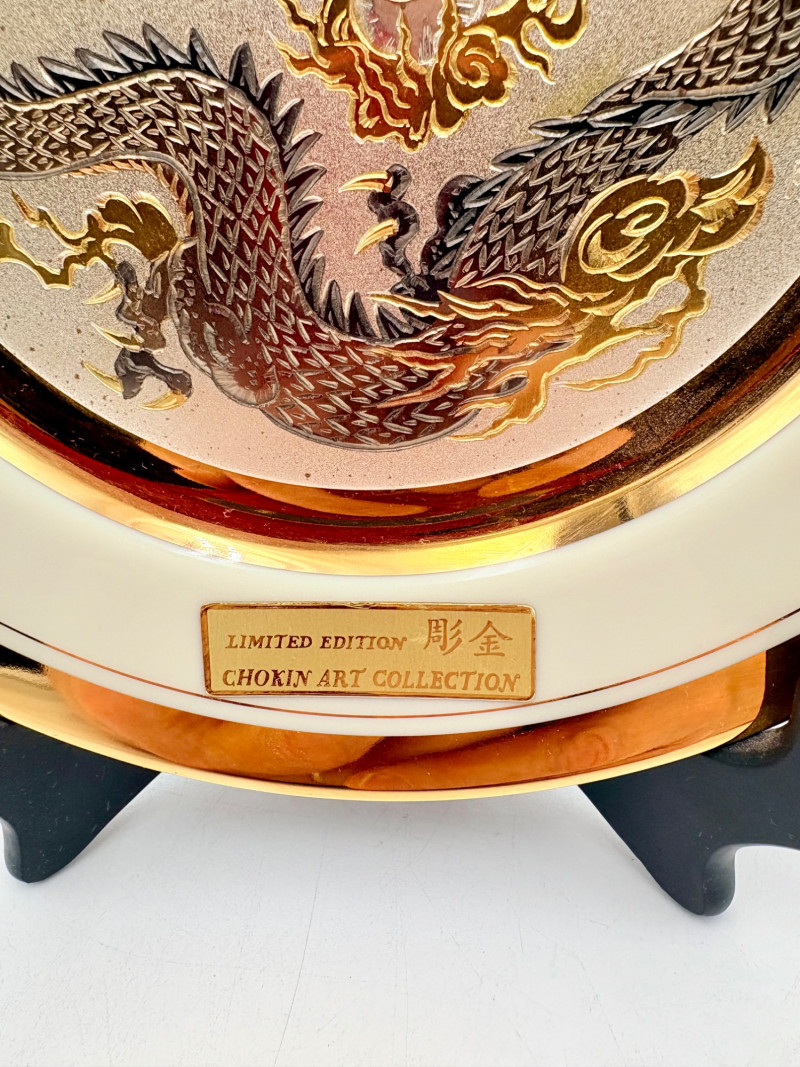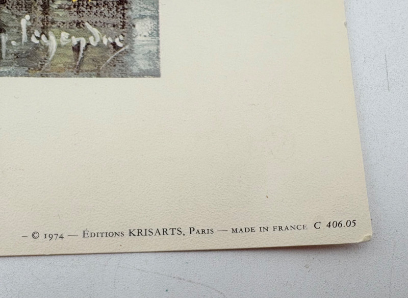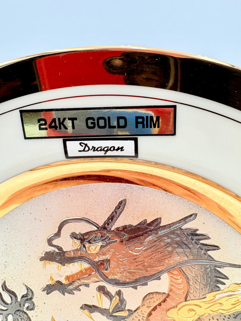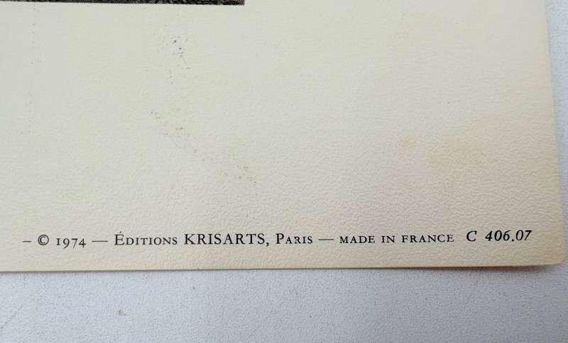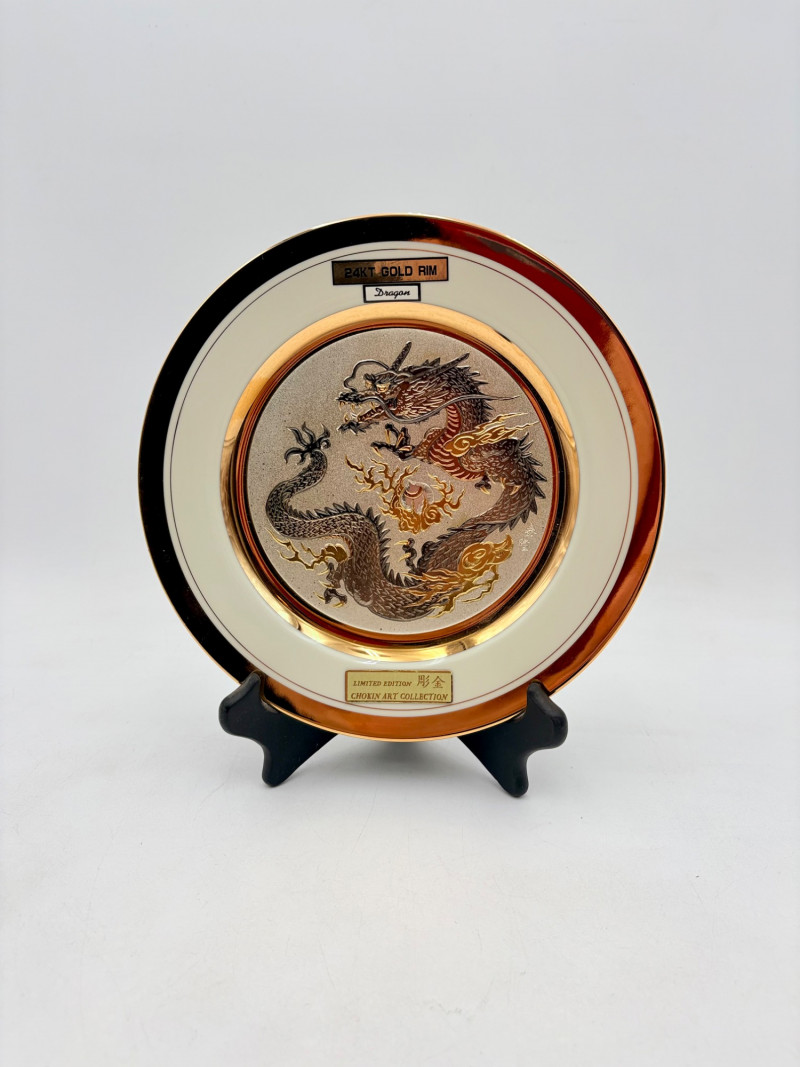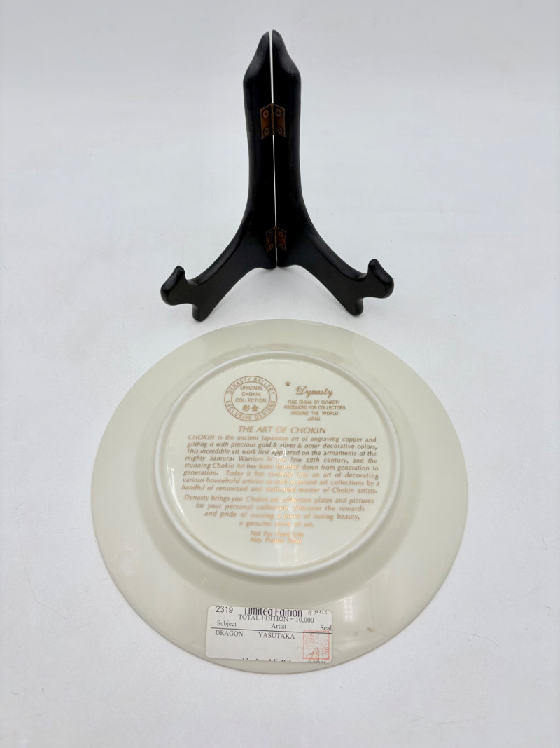 Quartet of art pieces from east & west. - Two 1970s prints of scenes in Strasbourg, France. From Krisarts of Paris. They are printed on quality paper which has a couple of slight ripples that should flatten out when framed. Printed area measures approx.8.25" H x 11.75" W on each. - print of an original watercolor maritime scene by artist Nancy Wages. Note that while this is a print, the artist appears to have signed in pen over the printed signature on the lower right. In a black double mat with overall measurements of 9.5" H x 12.25" W. Chokin Art plate of a dragon in gold with a 24K gold rim. Comes with stand & certificate. Measures just over 9" diameter.